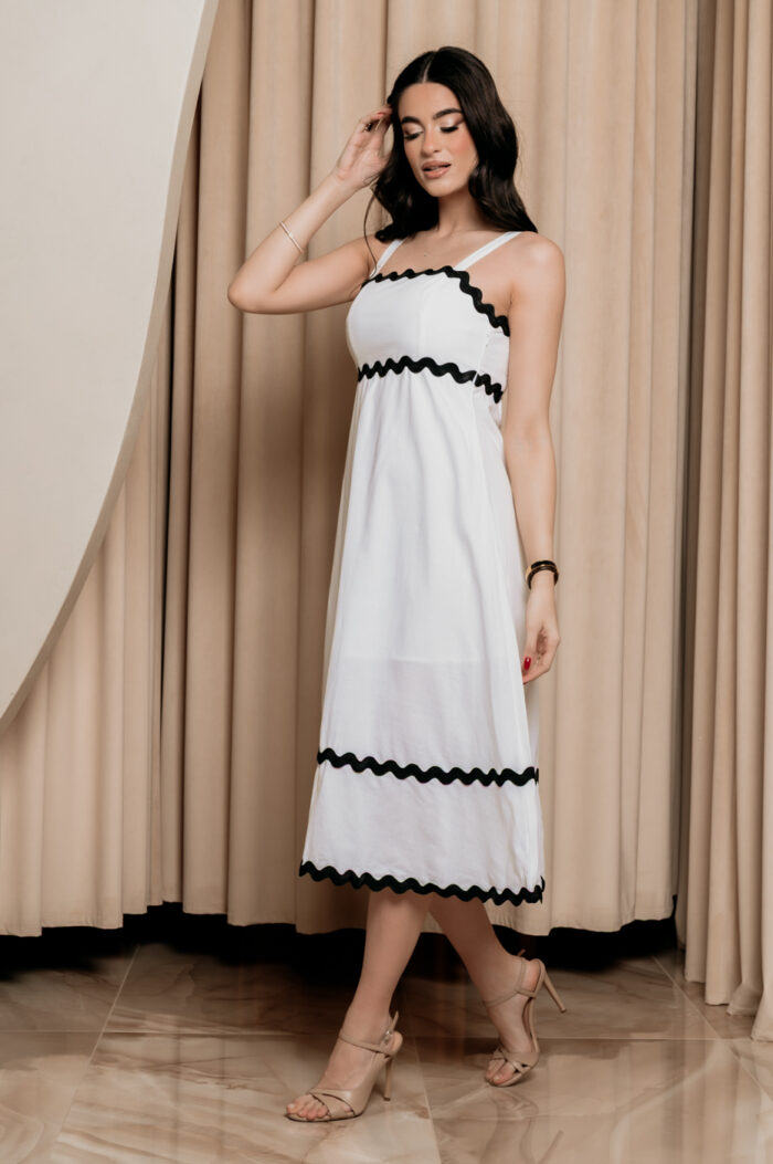 Φόρεμα midi άσπρο με μαύρες λεπτομέρειες. Διαθέτει ράντες που αυξομειώνουν και έχει σφιγγοφωλιά πίσω. Κλείνει με φερμουάρ πίσω. Ένα φόρεμα άνετο και μοναδικό για απογευματινές αλλά και βραδινές ώρες.