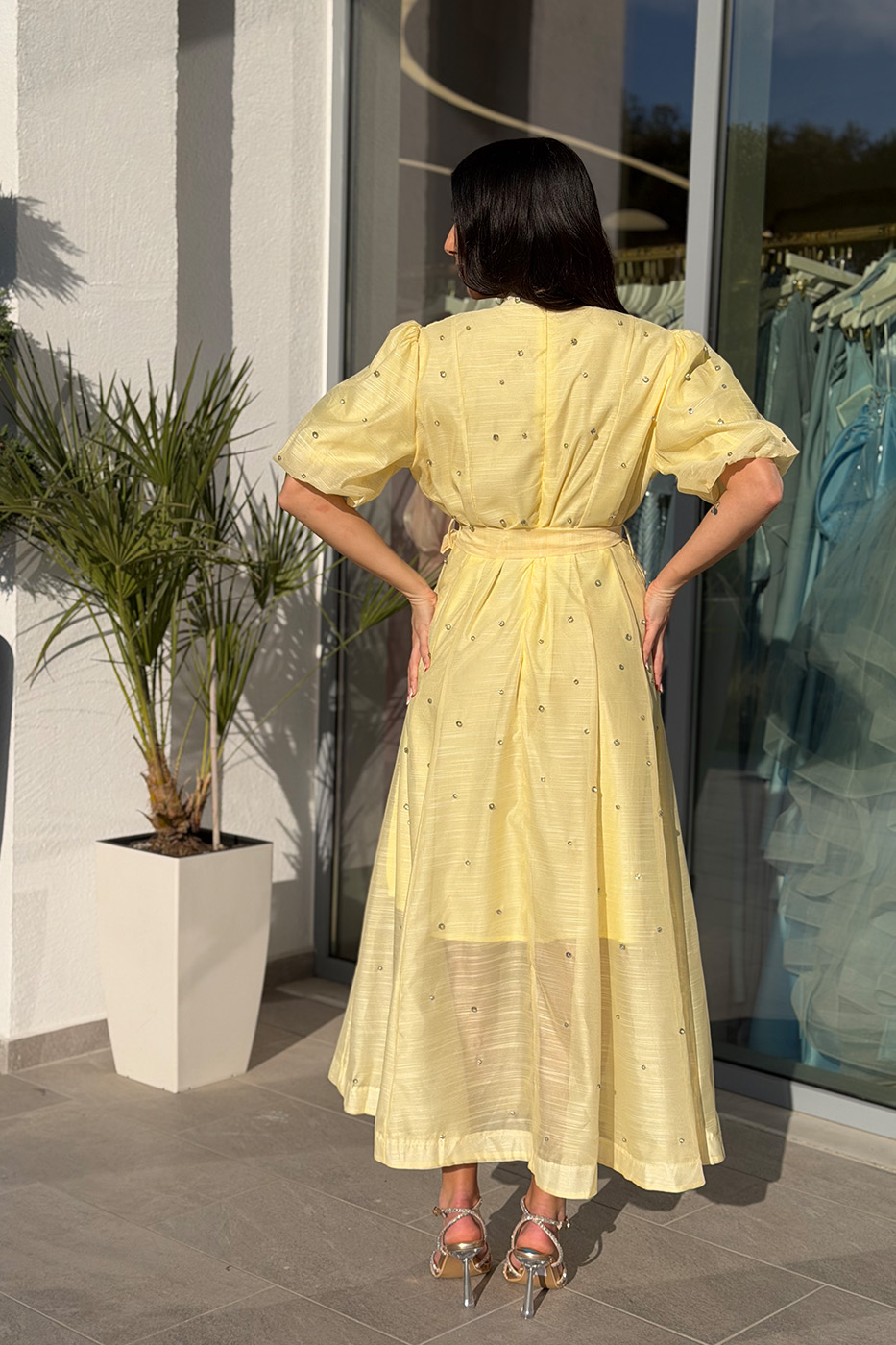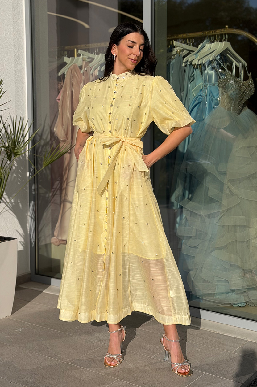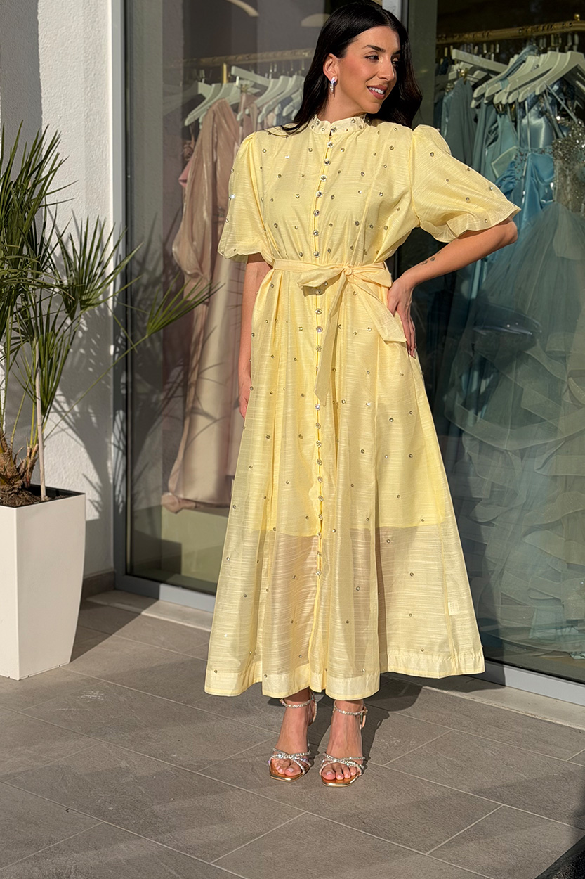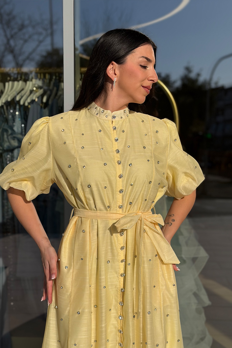 Φόρεμα midi balloon μανίκια με στρας κίτρινο. Διαθέτει μεσοφόρι, στρογγυλή λαιμόκοψη, κοντά μανίκια με λάστιχο στο τελείωμα. Διαθέτει στρας σε όλο το φόρεμα και κλείνει με κουμπιά κόσμημα.