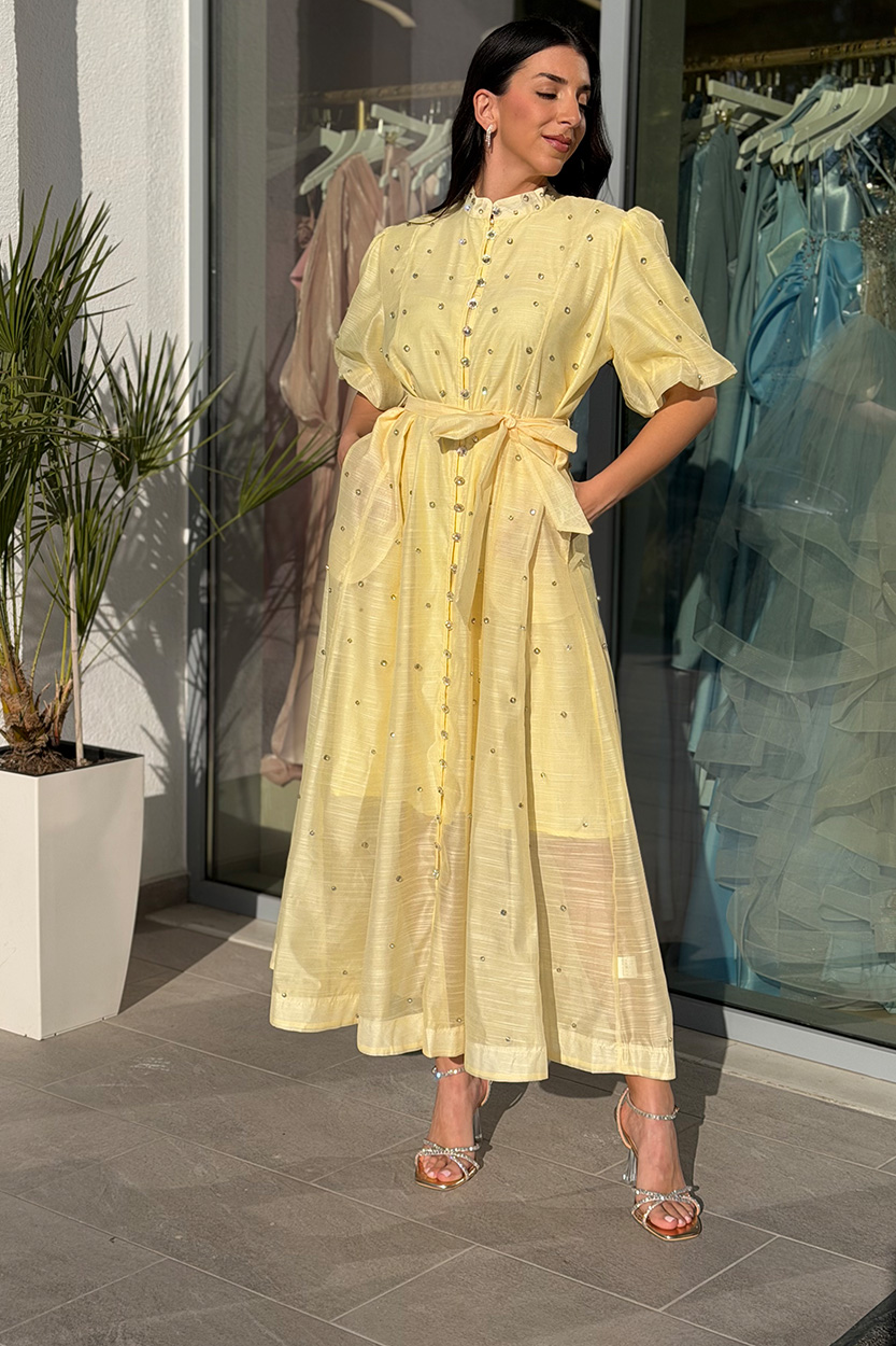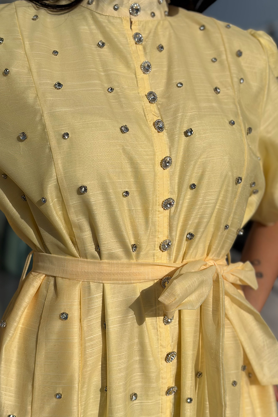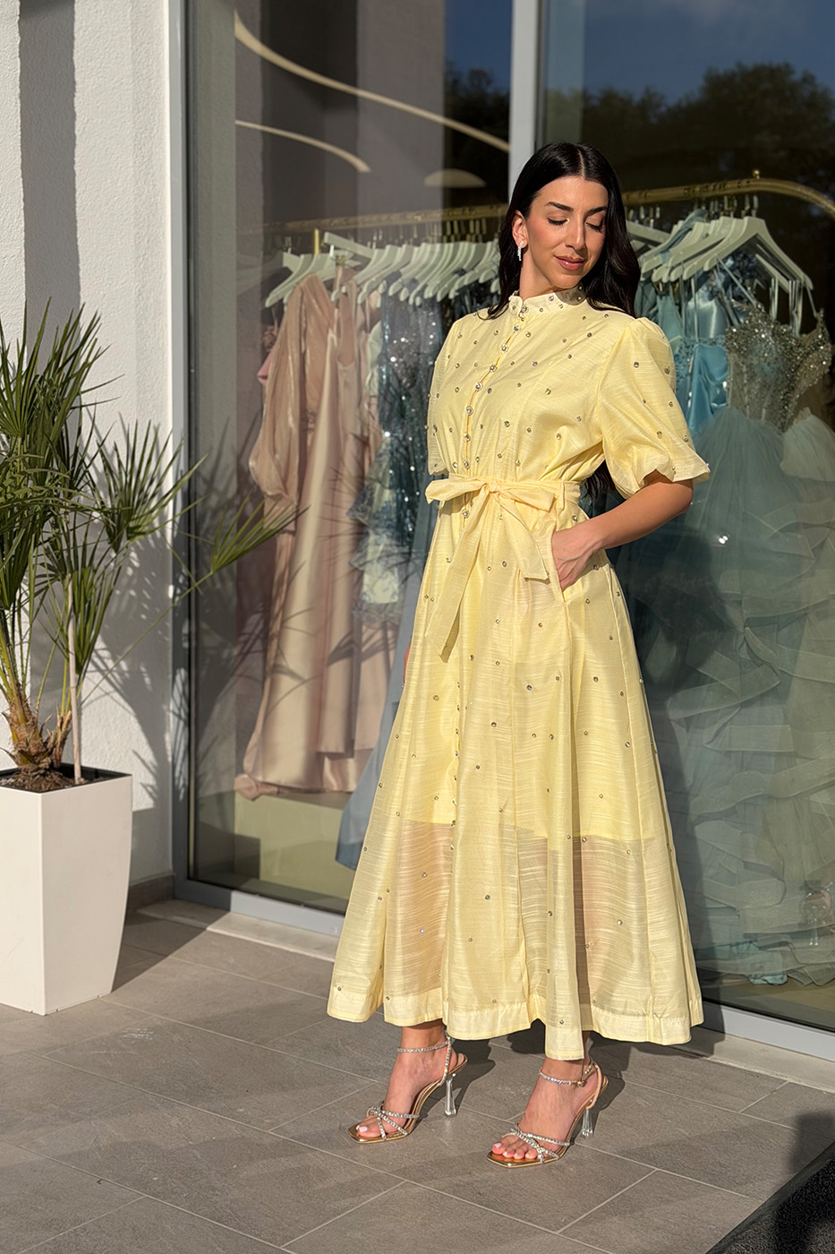Φόρεμα midi balloon μανίκια με στρας κίτρινο. Διαθέτει μεσοφόρι, στρογγυλή λαιμόκοψη, κοντά μανίκια με λάστιχο στο τελείωμα. Διαθέτει στρας σε όλο το φόρεμα και κλείνει με κουμπιά κόσμημα.