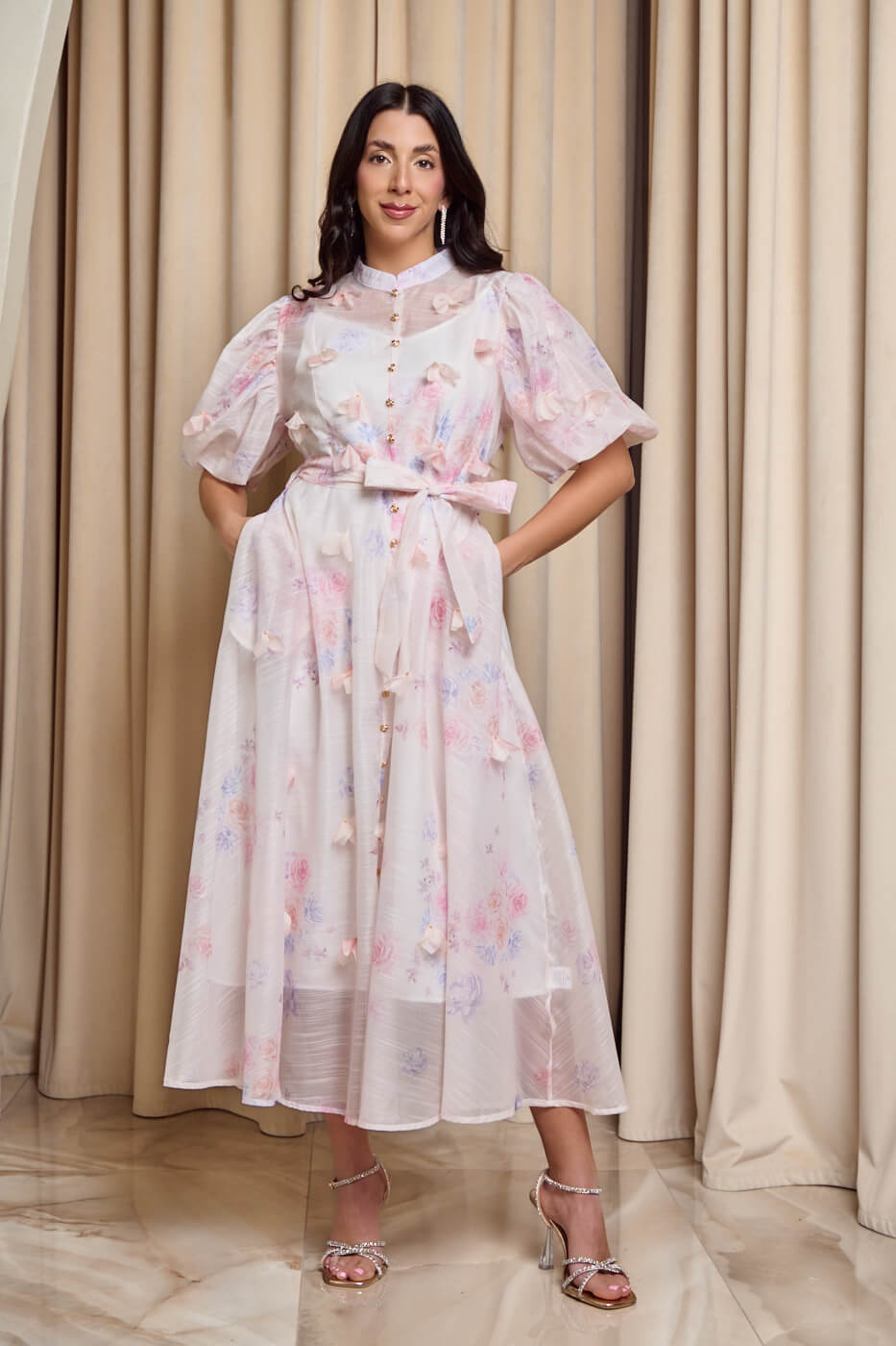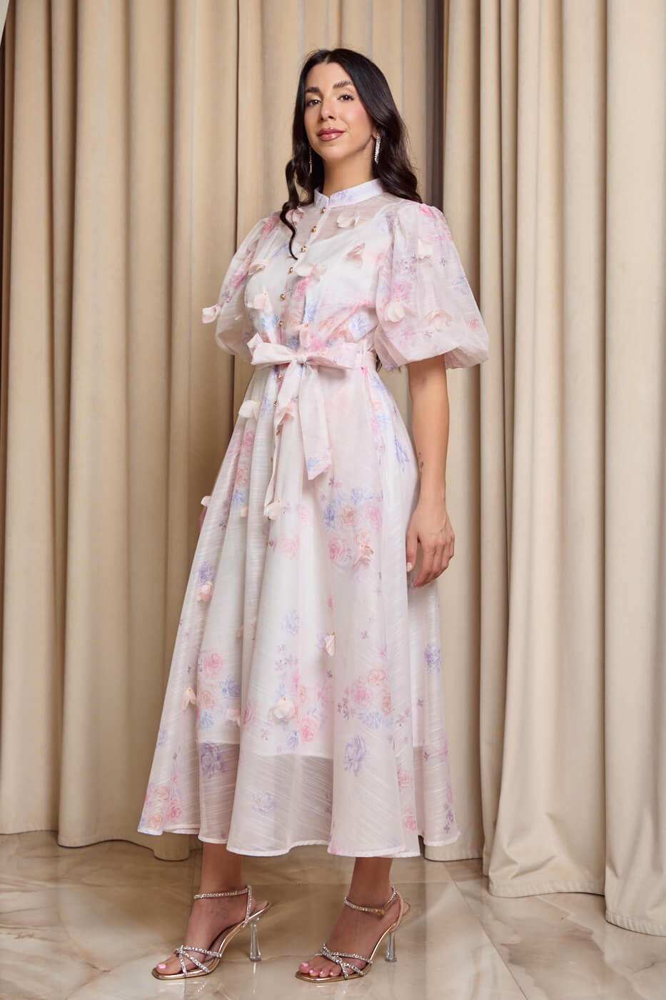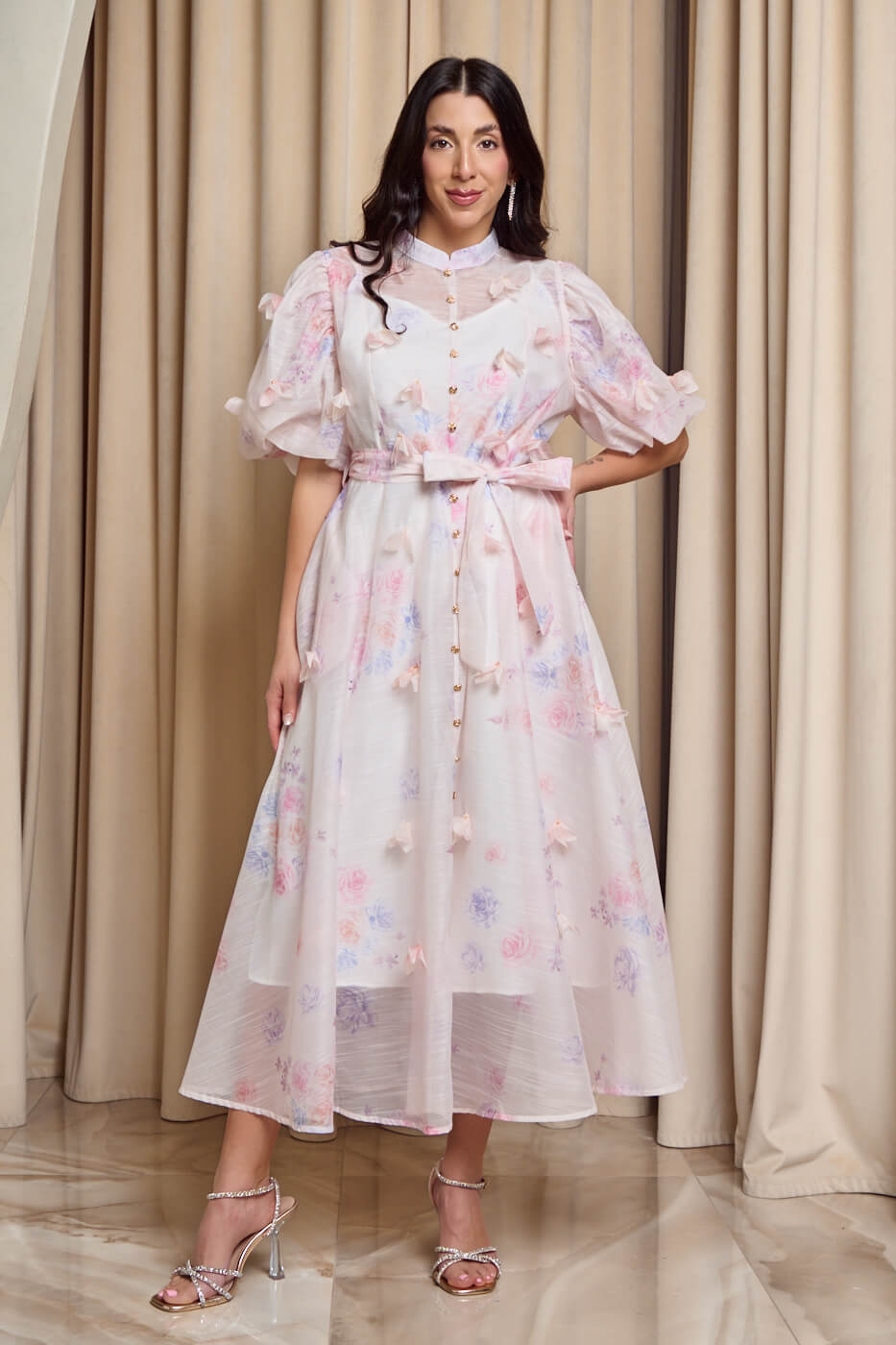 Φόρεμα midi floral με 3D λεπτομέρειες και balloon μανίκια εκρού