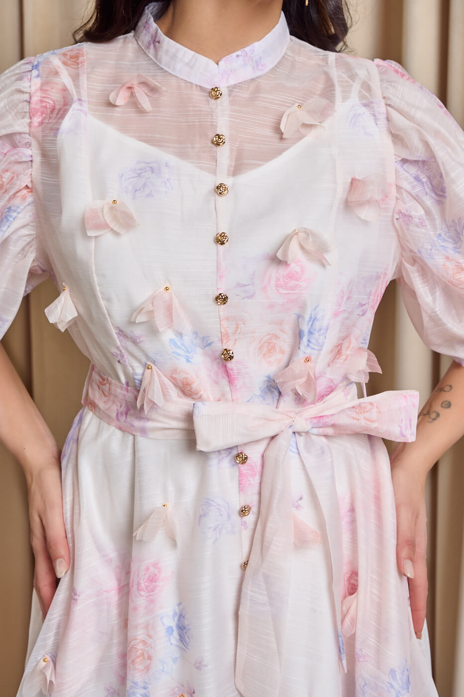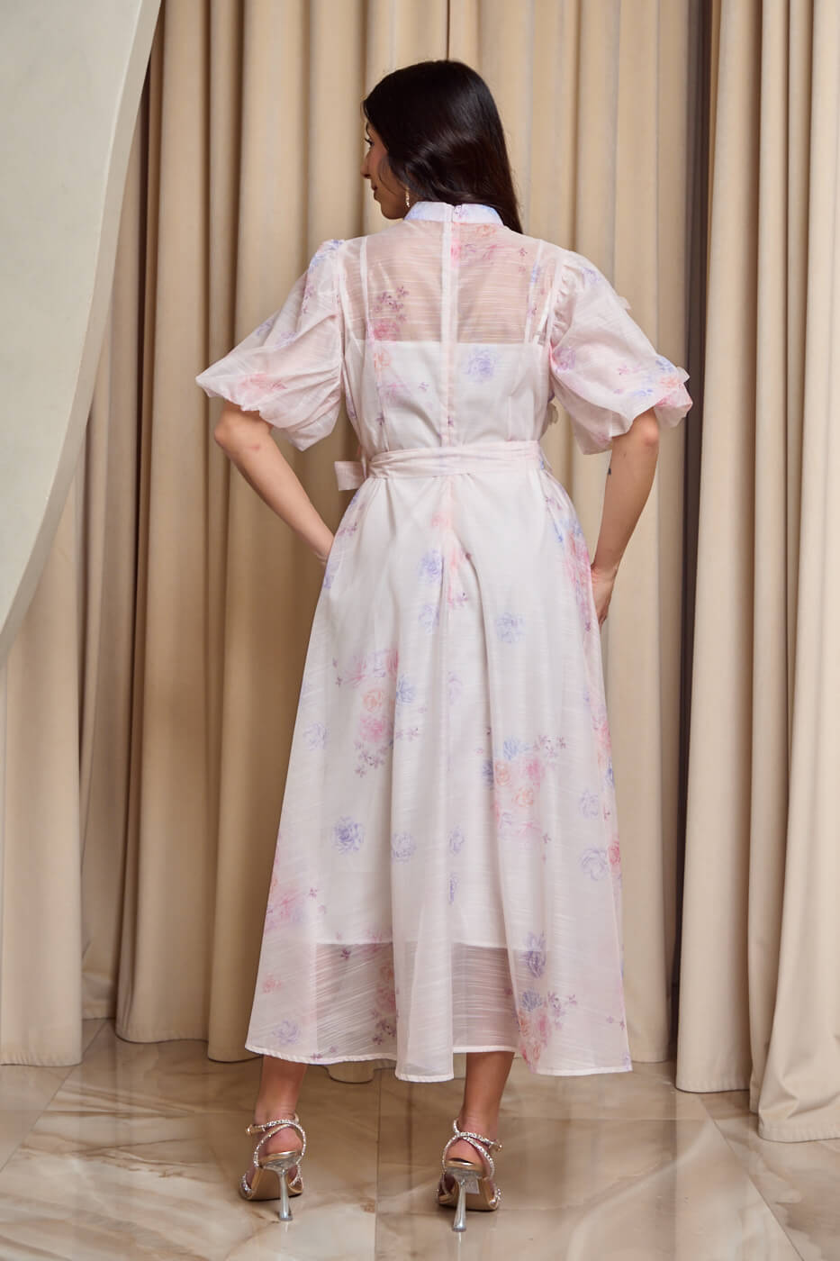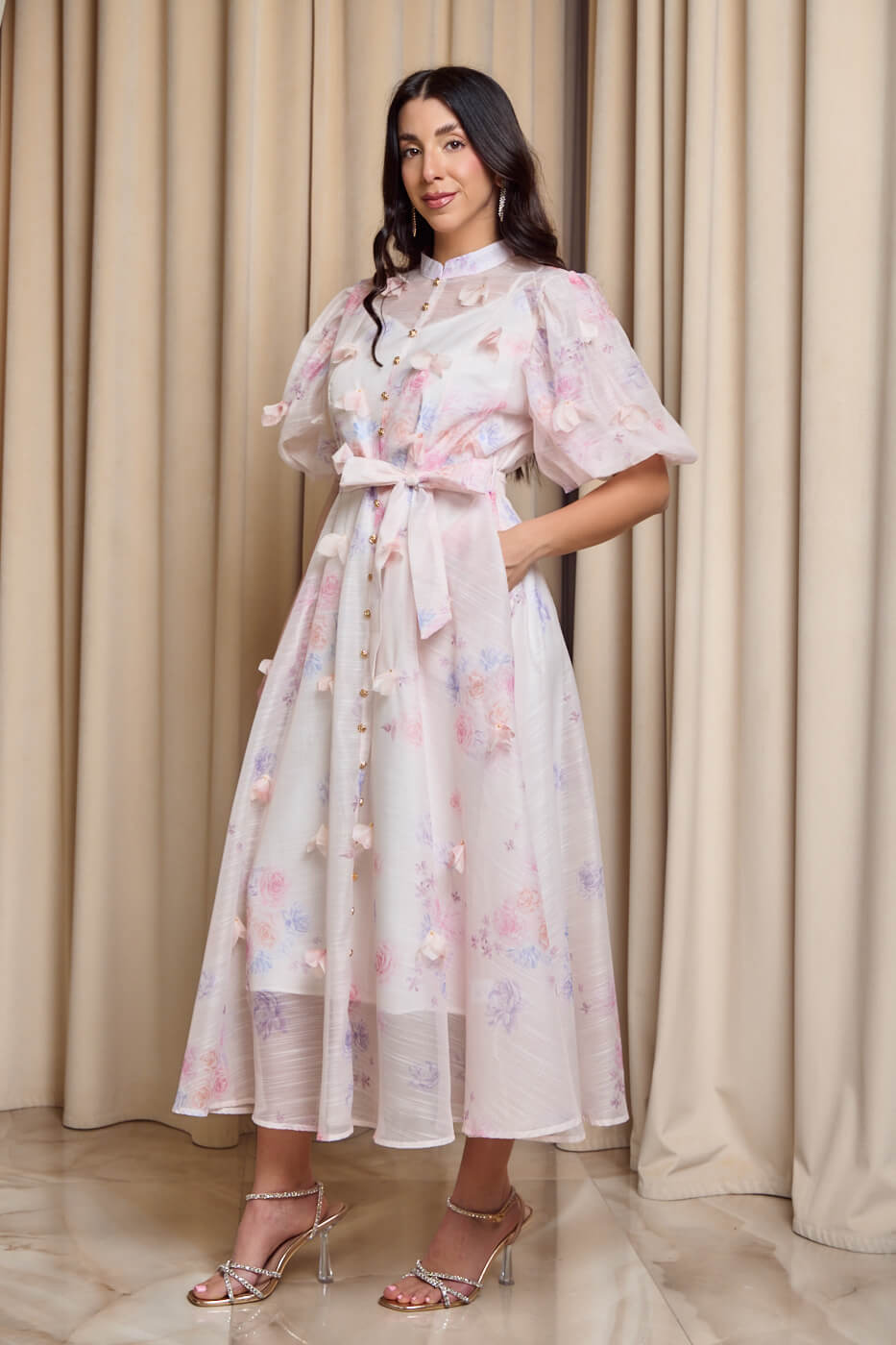Φόρεμα midi floral με 3D λεπτομέρειες και balloon μανίκια εκρού