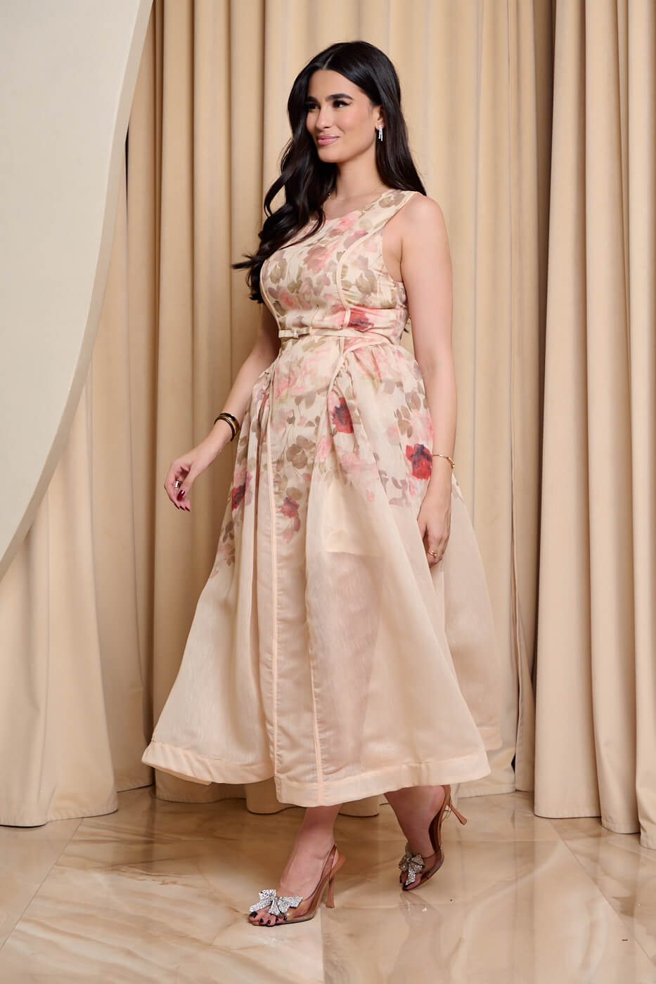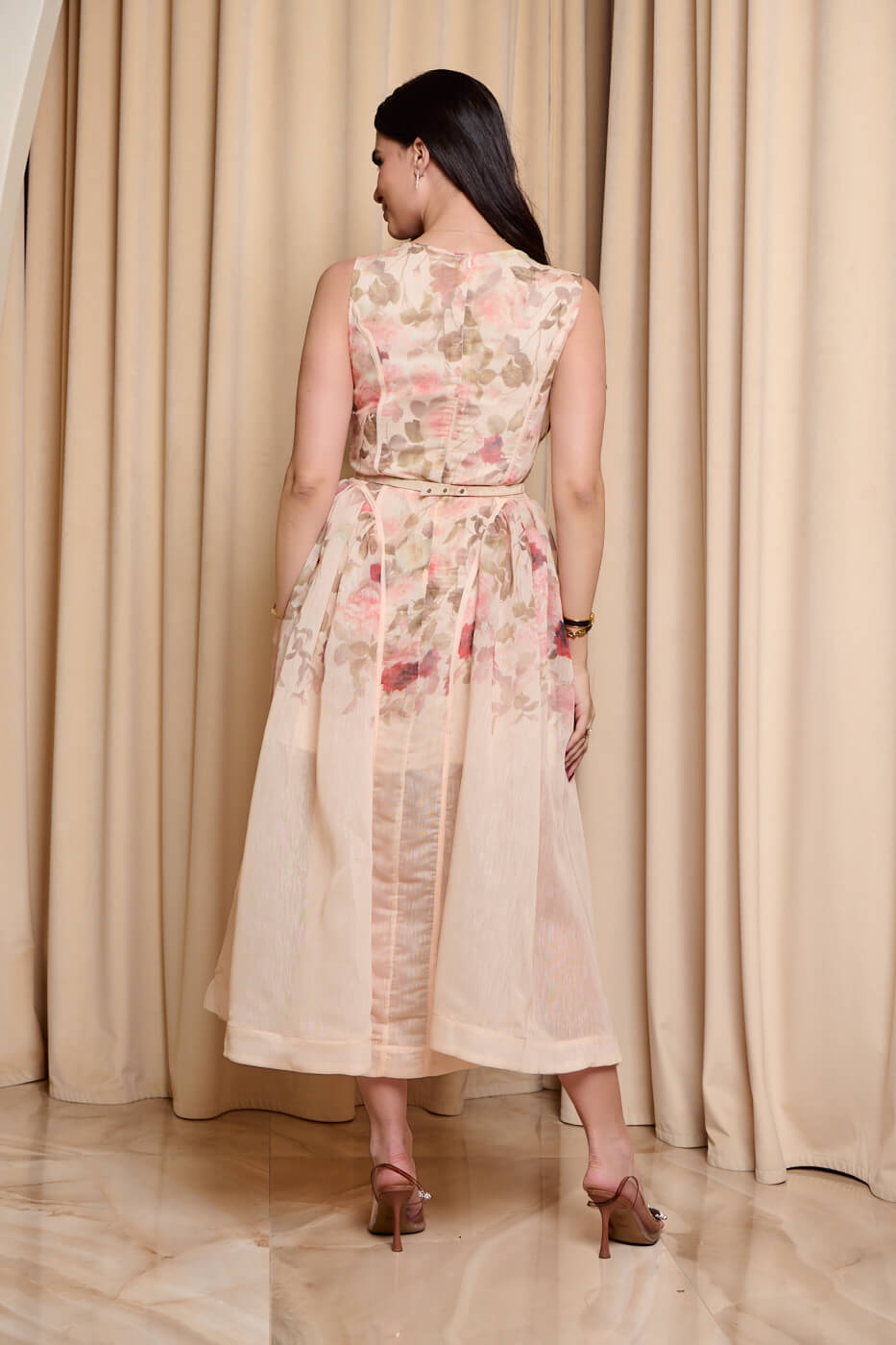 Φόρεμα midi floral με ζώνη μπεζ . Ένα αέρινο και ρομαντικό φόρεμα σε απαλό μπεζ τόνο με floral μοτίβο. Διαθέτει φαρδιές τιράντες , στρογγυλή λαιμόκοψη και διακοσμητικές ραφές στο πάνω μέρος. Το κάτω μέρος έχει επίσης διακοσμητικές ραφές και πιέτες. Στο πλάι και στις δύο πλευρές διαθέτει εσωτερικά μικρό κομμάτι από τούλι , τύπου φουρό, που δημιουργεί έναν διακριτικό και κολακευτικό όγκο. Έχει δική του αποσπώμενη ζώνη και εσωτερική φόδρα. Κλείνει με φερμουάρ πίσω. Ιδανικό για κομψές εμφανίσεις με ρομαντική διάθεση και στυλ.
