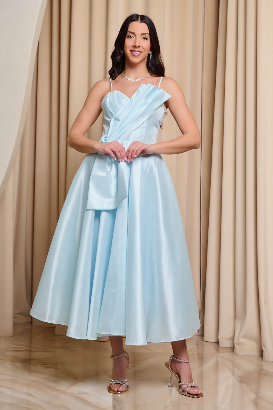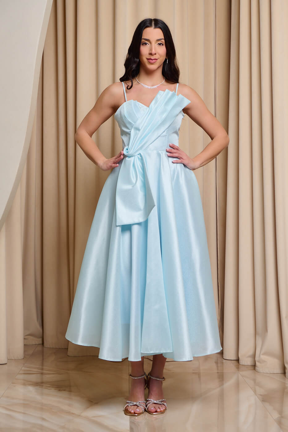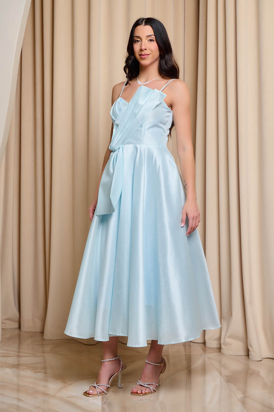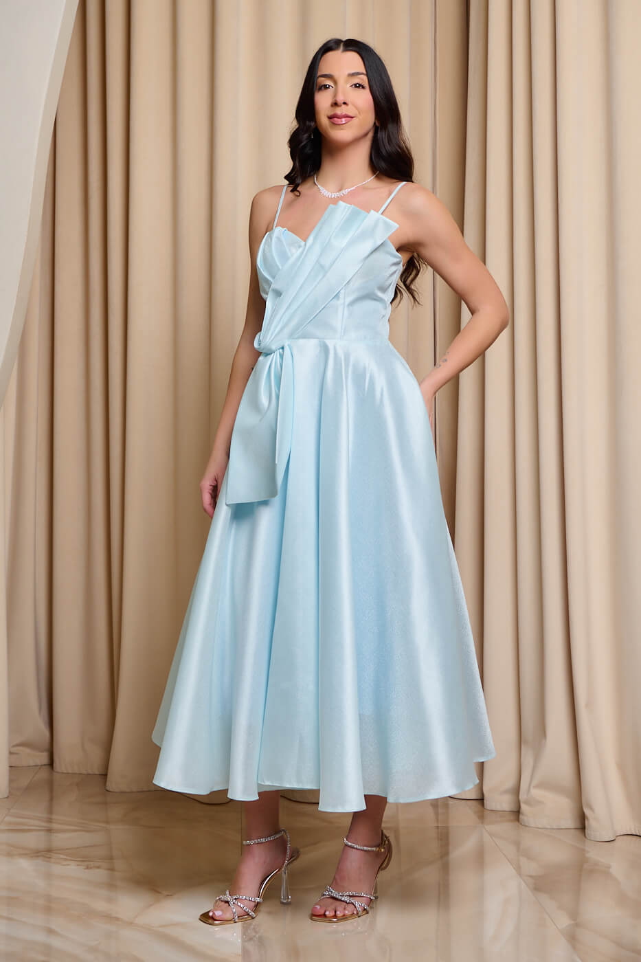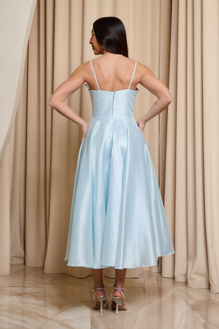 Φόρεμα midi γυαλιστερή οργάντζα baby blue . Ρομαντικό και κομψό φόρεμα σε απαλή baby blue απόχρωση κατασκευασμένο από γυαλιστερή οργάντζα που προσφέρει διακριτική λάμψη. Διαθέτει τρισδιάστατο ιδιαίτερο σχέδιο με πιέτες στο μπούστο. Έχει εσωτερικά cups και λεπτές τιράντες που προσφέρουν στήριξη. Το κάτω μέρος είναι σε Α γραμμή που χαρίζει κίνηση και κομψότητα σε κάθε βήμα. Διαθέτει εσωτερική φόδρα και κλείνει με φερμουάρ πίσω. Ιδανικό για κομψές επίσημες εμφανίσεις που ξεχωρίζουν για το στυλ και τη ρομαντική τους διάθεση.