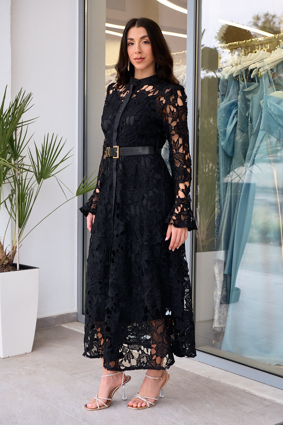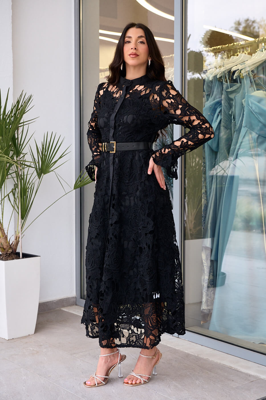 Φόρεμα midi κιπούρ με ζώνη μαύρο. Ένα κομψό μαύρο φόρεμα από κιπούρ δαντέλα. Διαθέτει αποσπώμενο μεσοφόρι και δική ζώνη δερματίνι. Κλείνει με κουμπιά μπροστά. .