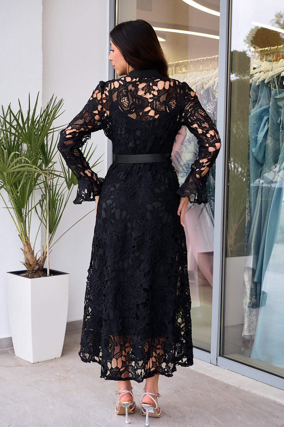 Φόρεμα midi κιπούρ με ζώνη δερματίνη μαύρο . Ένα κομψό μαύρο φόρεμα από κιπούρ δαντέλα. Διαθέτει αποσπώμενο μεσοφόρι και δική ζώνη δερματίνι. Τα μανίκια είναι μακριά με καμπάνα τελείωμα. Κλείνει με κουμπιά μπροστά. Ιδανική επιλογή για καθημερινές αλλά και πιο επίσημες εμφανίσεις με στυλ.