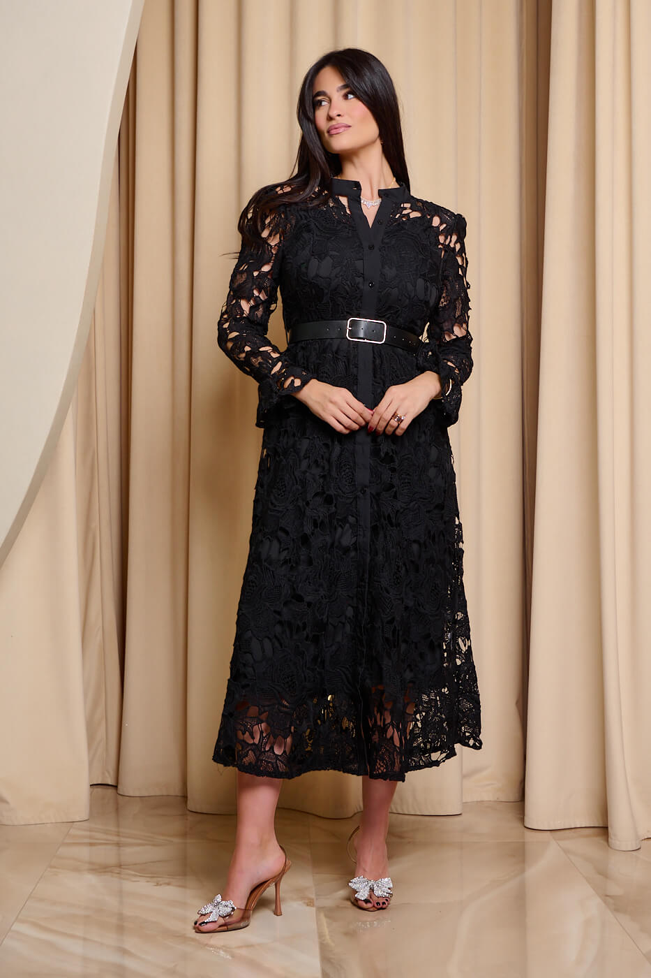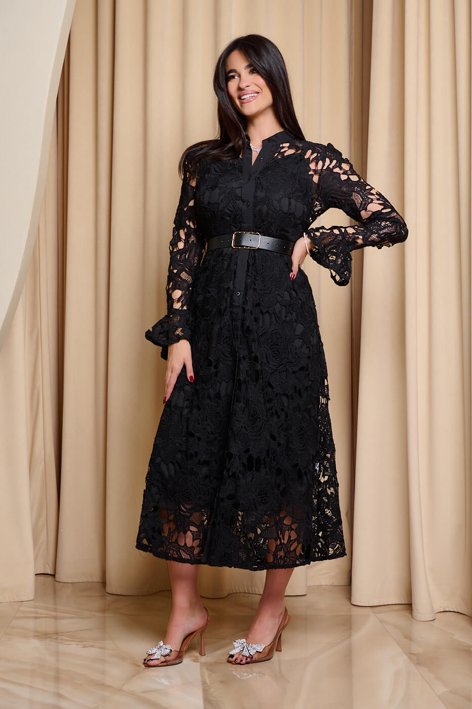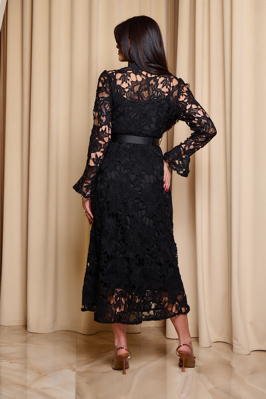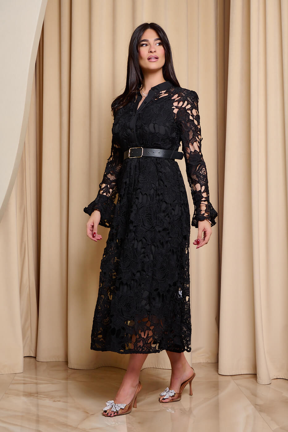 Φόρεμα midi κιπούρ με ζώνη μαύρο. Ένα κομψό μαύρο φόρεμα από κιπούρ δαντέλα. Διαθέτει αποσπώμενο μεσοφόρι και δική ζώνη δερματίνι. Τα μανίκια είναι μακριά με καμπάνα τελείωμα. Κλείνει με κουμπιά μπροστά. Ιδανική επιλογή για καθημερινές αλλά και πιο επίσημες εμφανίσεις με στυλ.