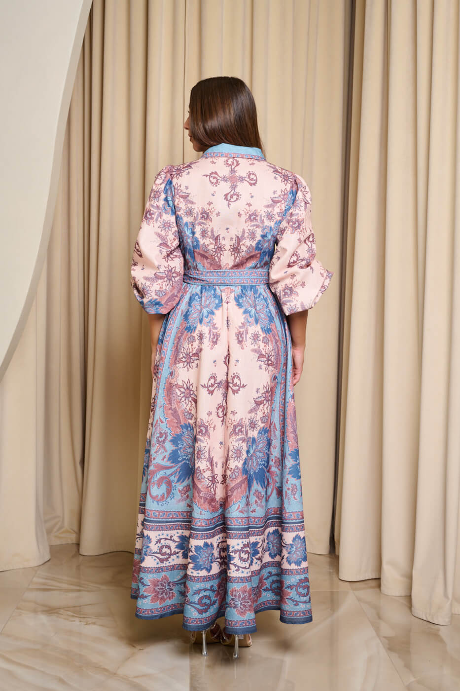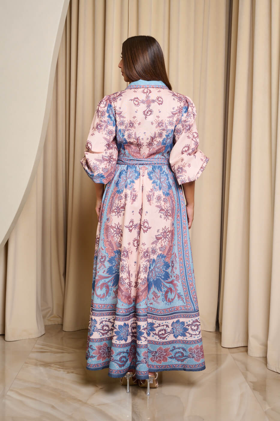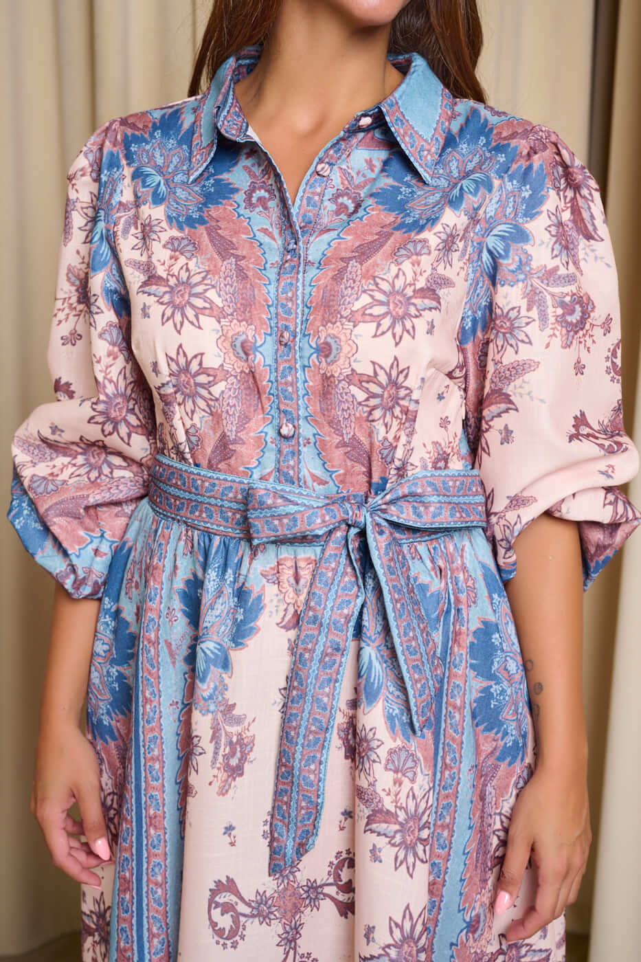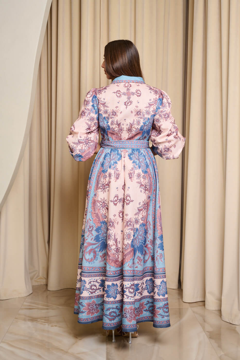 Φόρεμα midi λαχούρ με γιακά μπεζ. Με γιακά και κουμπιά από το ίδιο ύφασμα και χρώμα στο πάνω μέρος και μακριά μανίκια με λάστιχο στο τελείωμα. Διαθέτει δική του ζώνη από το ίδιο ύφασμα και χρώμα.