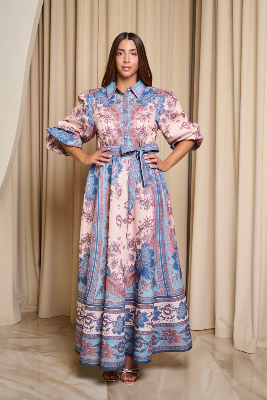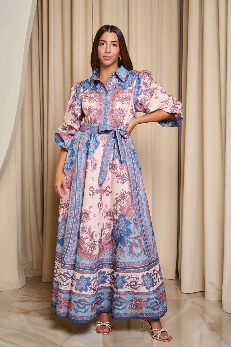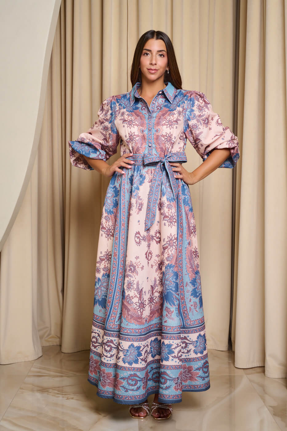Φόρεμα midi λαχούρ με γιακά μπεζ. Με γιακά και κουμπιά από το ίδιο ύφασμα και χρώμα στο πάνω μέρος και μακριά μανίκια με λάστιχο στο τελείωμα. Διαθέτει δική του ζώνη από το ίδιο ύφασμα και χρώμα.