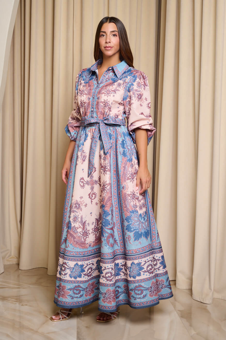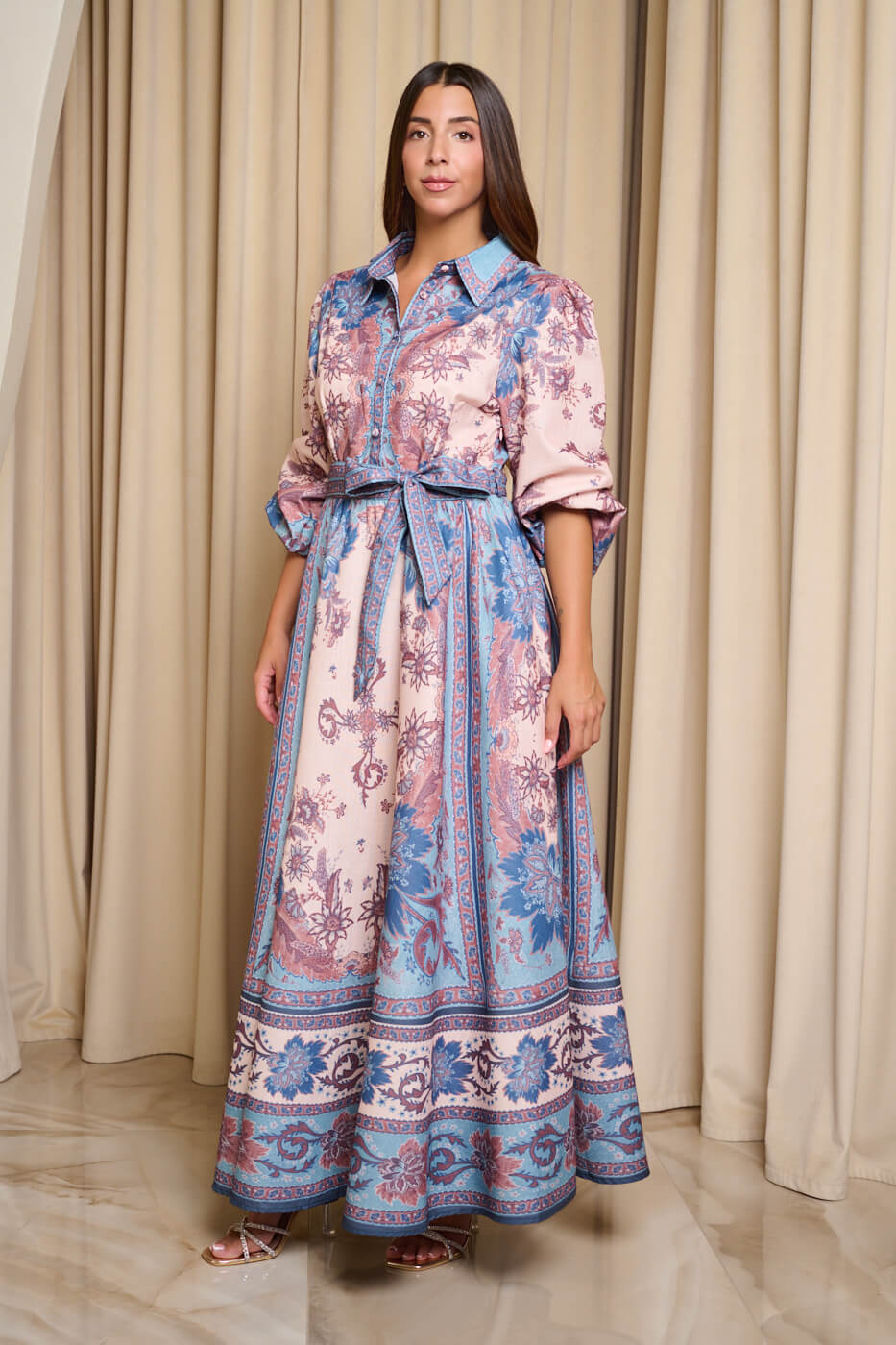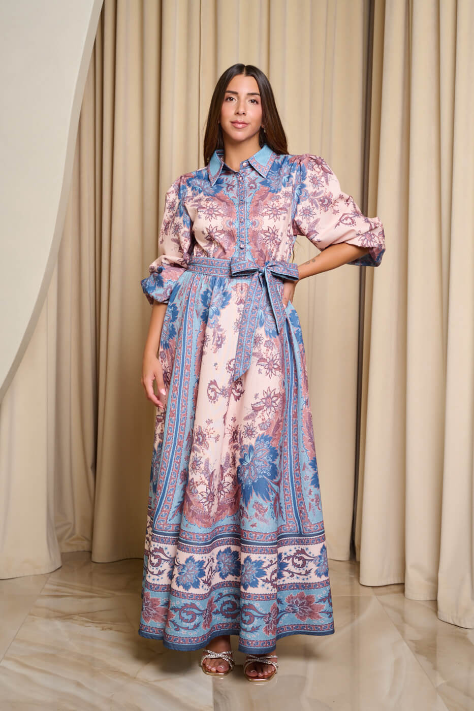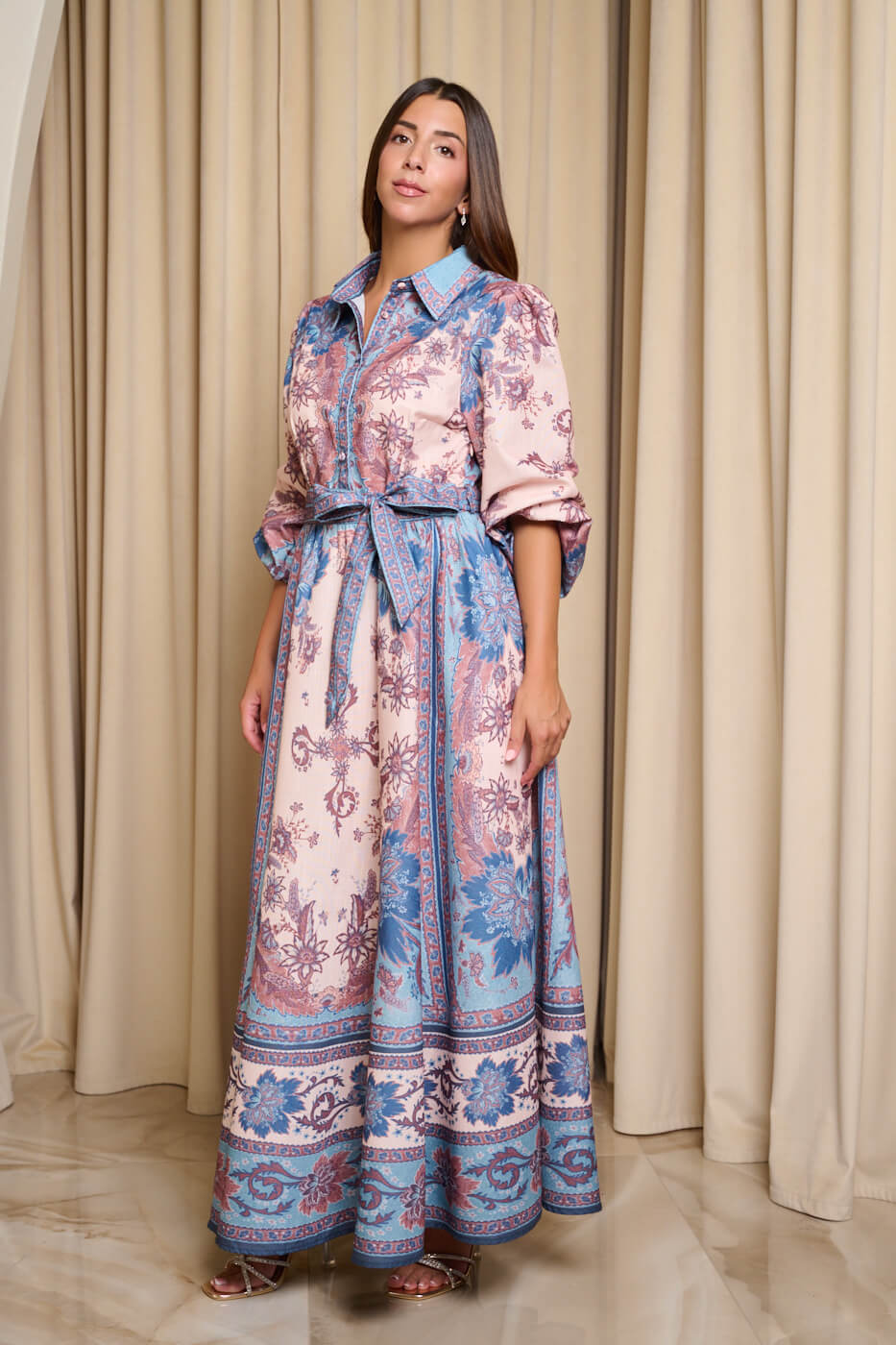 Φόρεμα midi λαχούρ με γιακά μπεζ. Με γιακά και κουμπιά από το ίδιο ύφασμα και χρώμα στο πάνω μέρος και μακριά μανίκια με λάστιχο στο τελείωμα. Διαθέτει δική του ζώνη από το ίδιο ύφασμα και χρώμα.