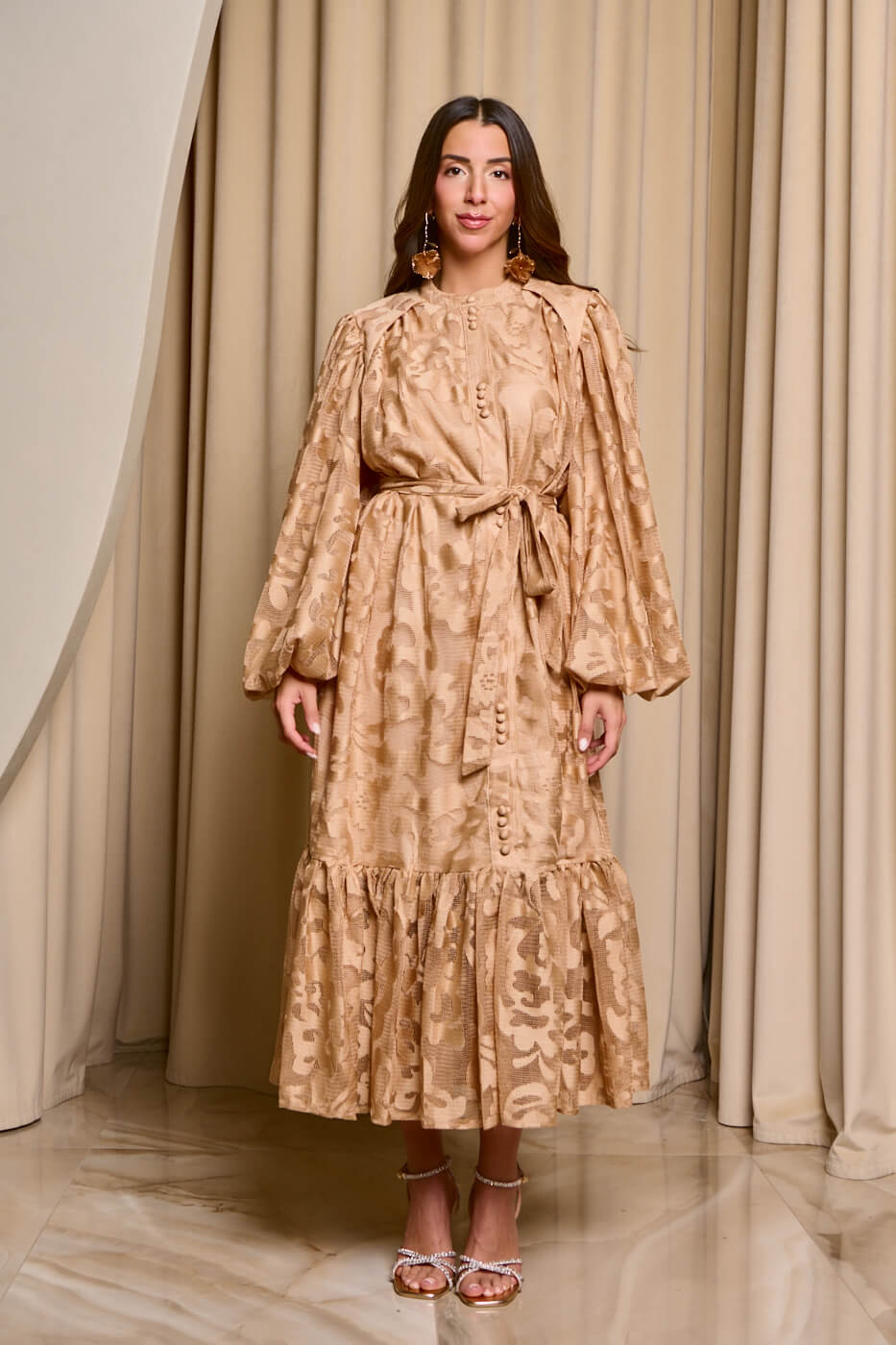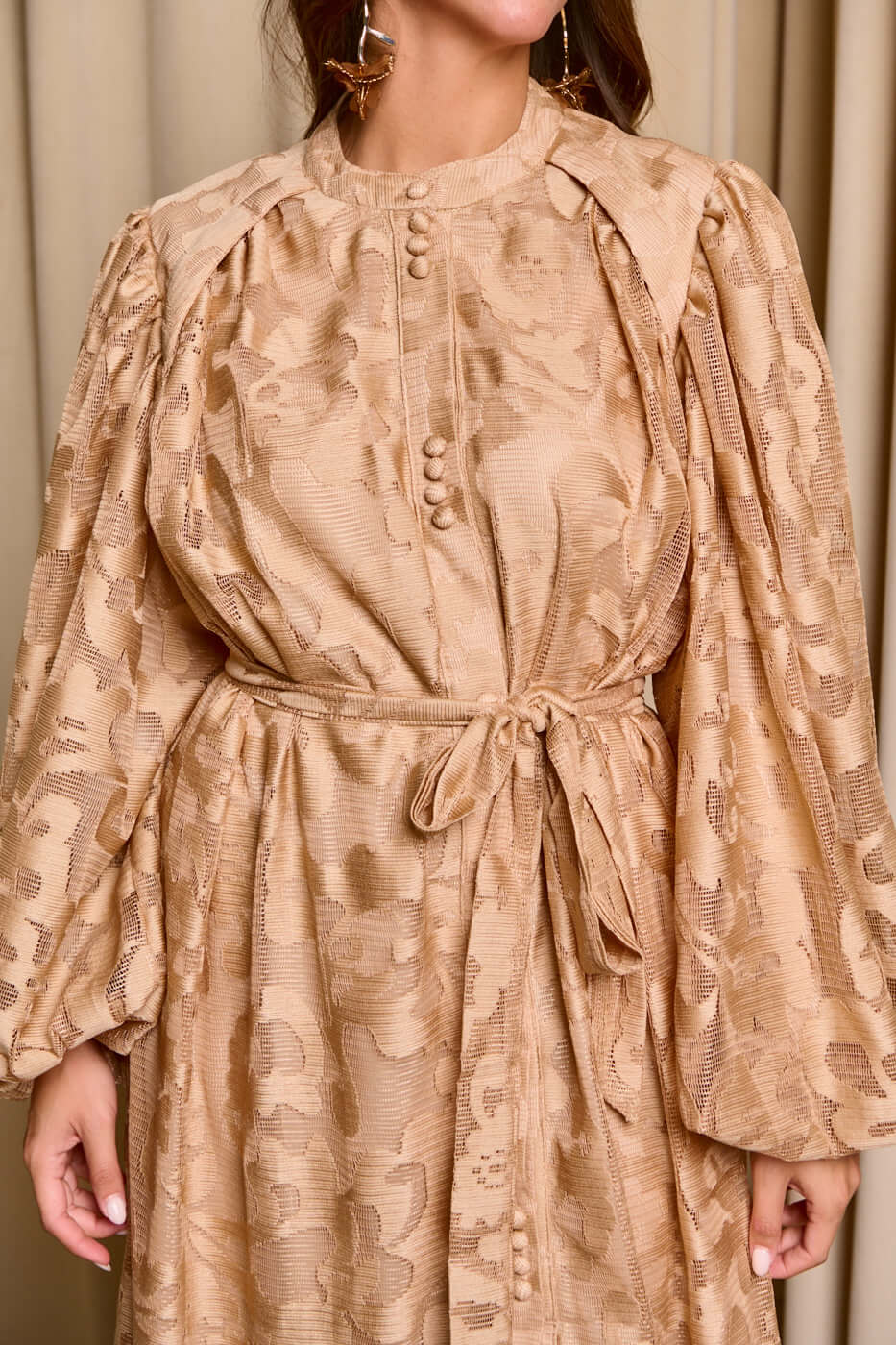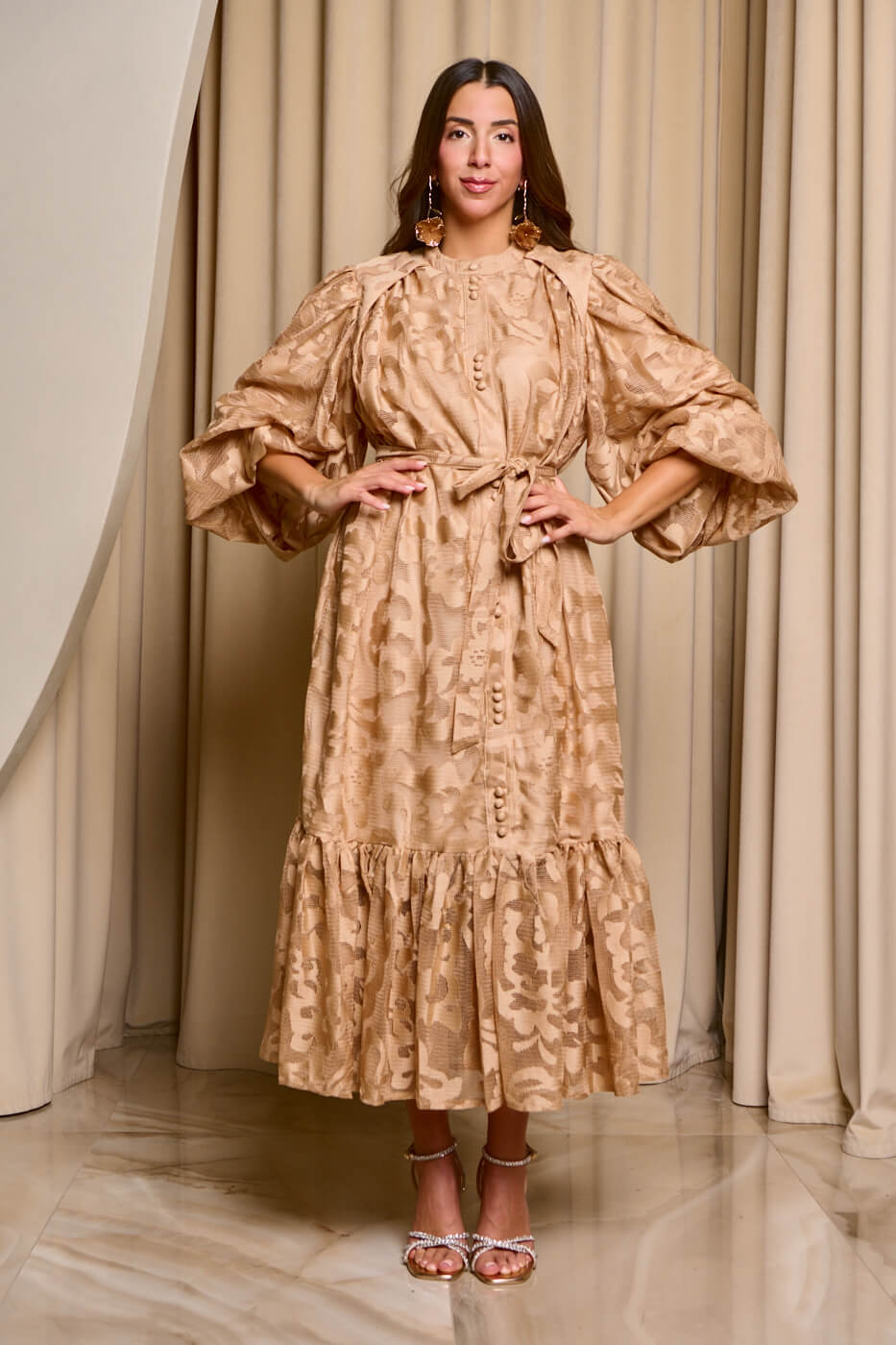 Φόρεμα midi με ανάγλυφα μοτίβα και balloon μανίκια μπεζ. Το ύφασμα έχει ανάγλυφη υφή με σχέδιο σε διάφανη δαντελένια ύφανση, που του χαρίζει πολυτελή χαρακτήρα. Με ψηλή, στρογγυλή λαιμόκοψη που κουμπώνει μπροστά με επενδυμένα κουμπιά από το ίδιο ύφασμα και χρώμα. Διαθέτει φαρδιά, balloon μανίκια με όγκο, ζώνη από το ίδιο ύφασμα που δένει στη μέση και εσωτερική ραμμένη φόδρα.