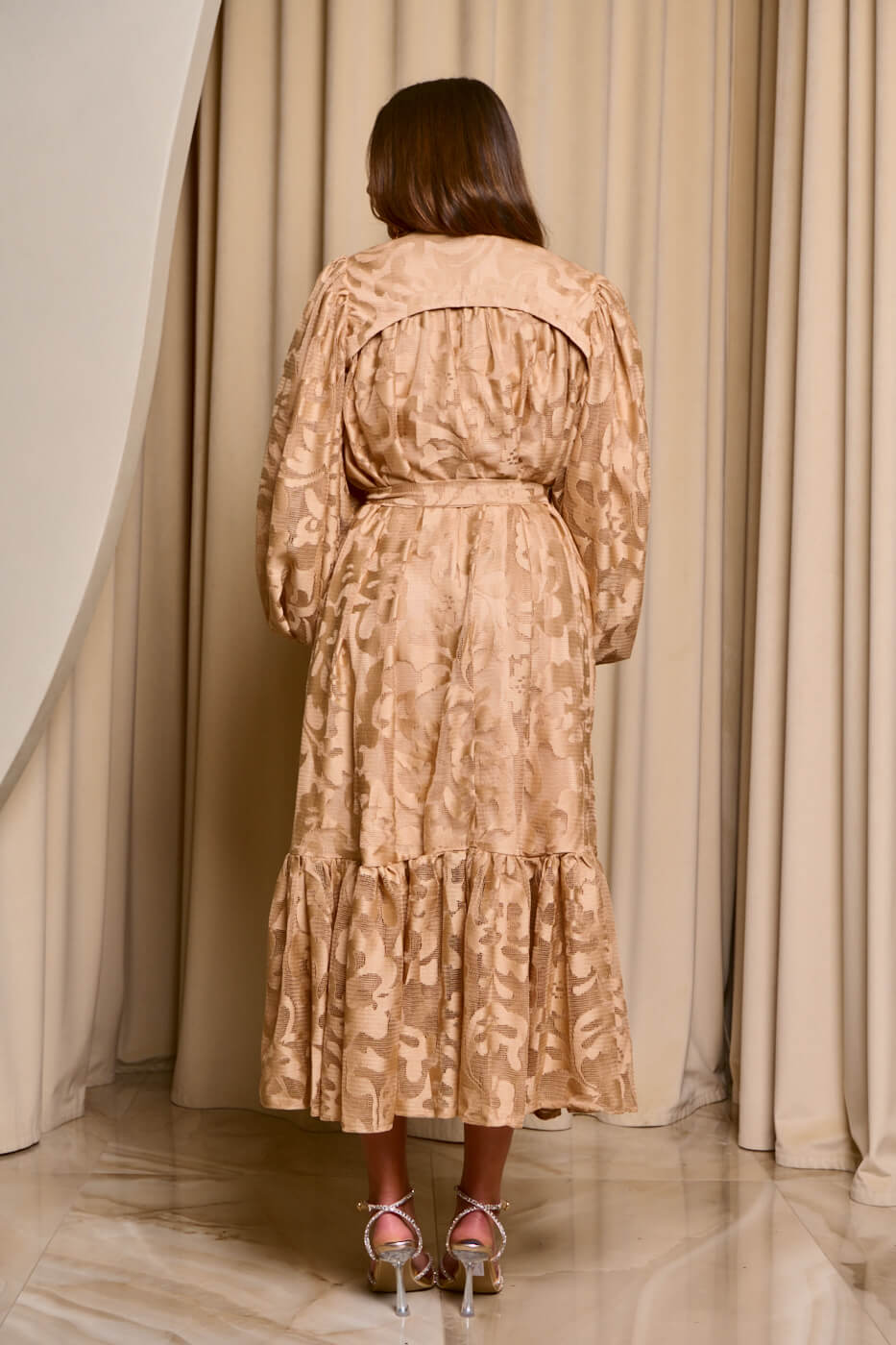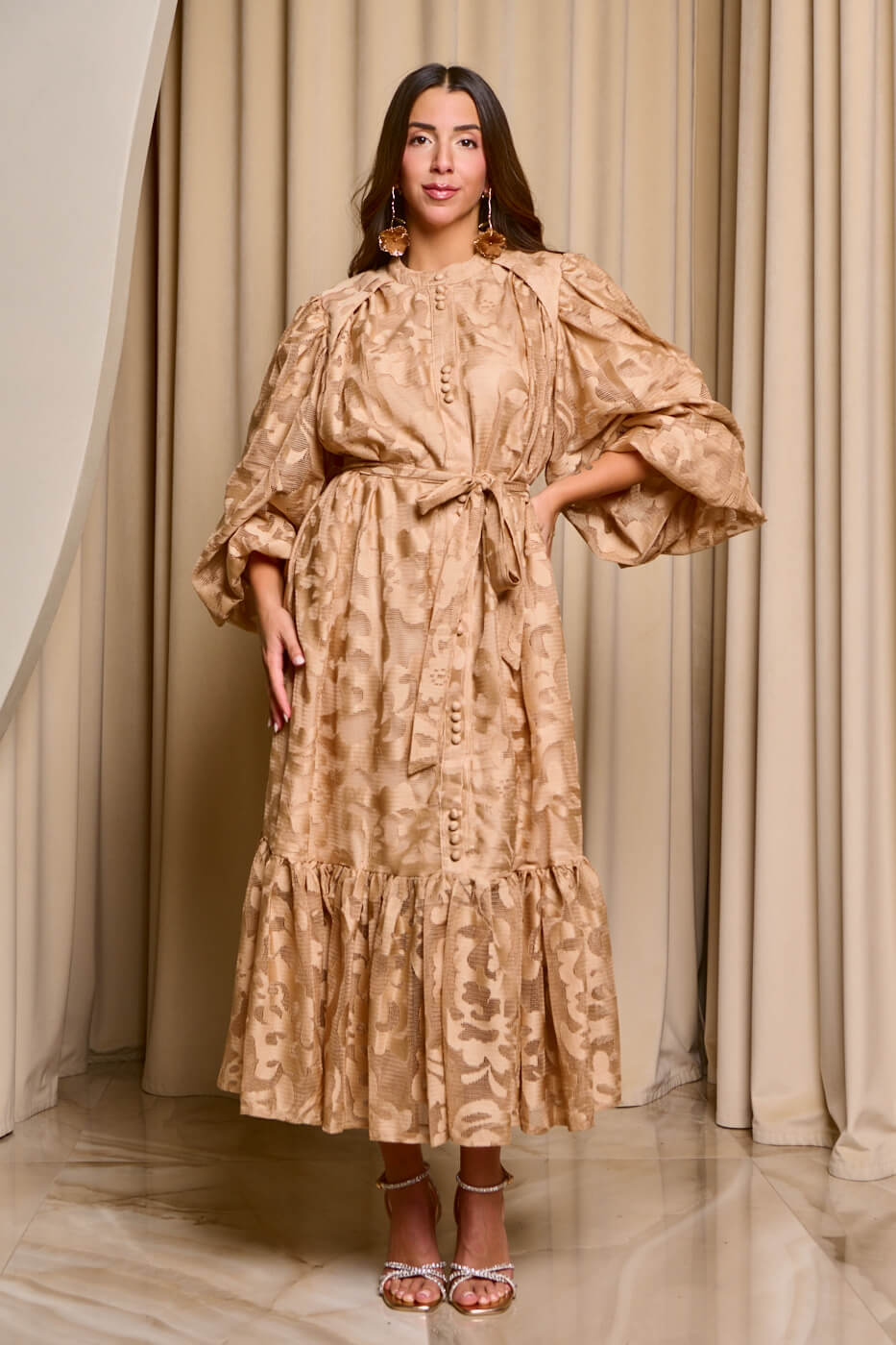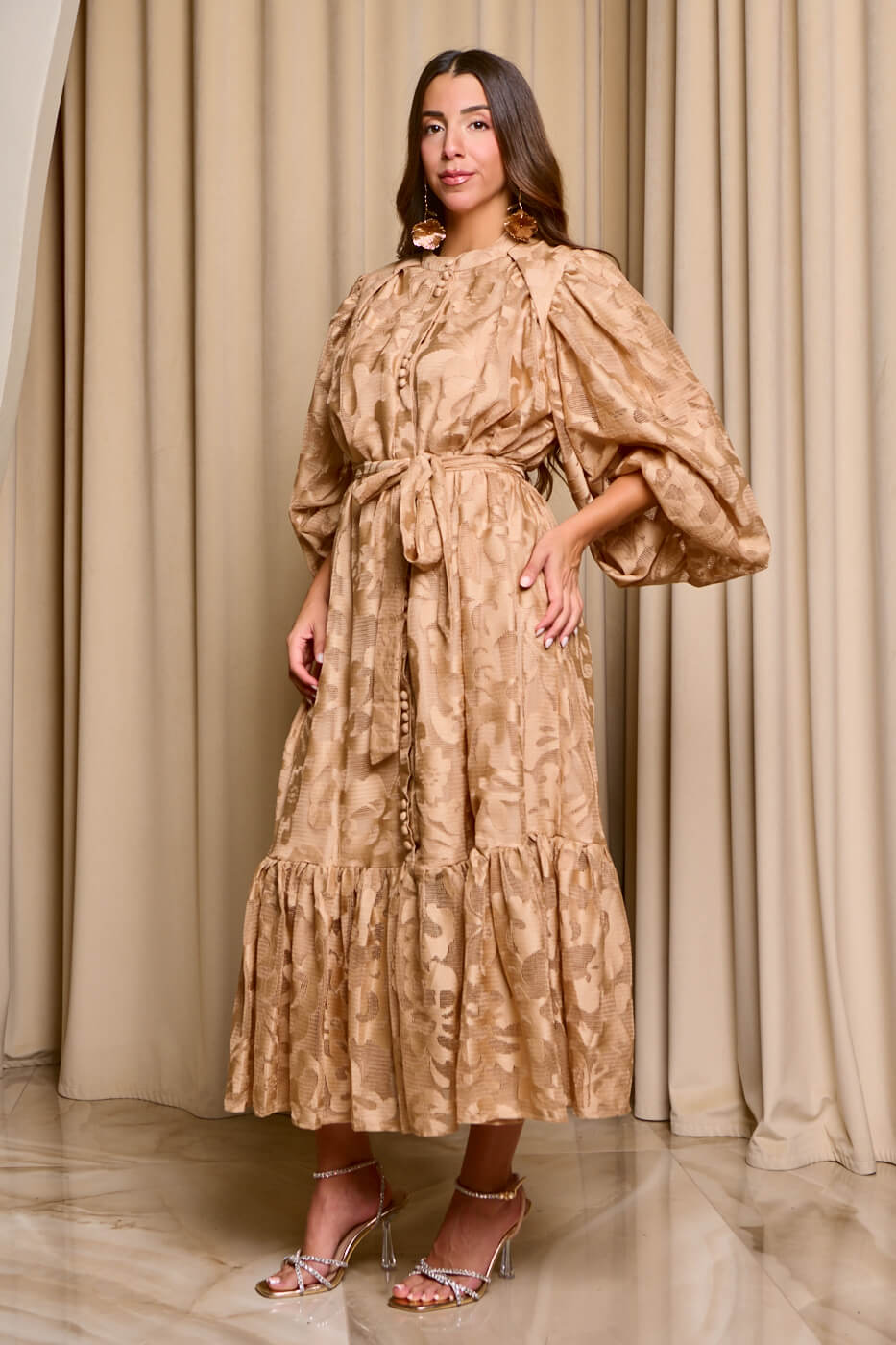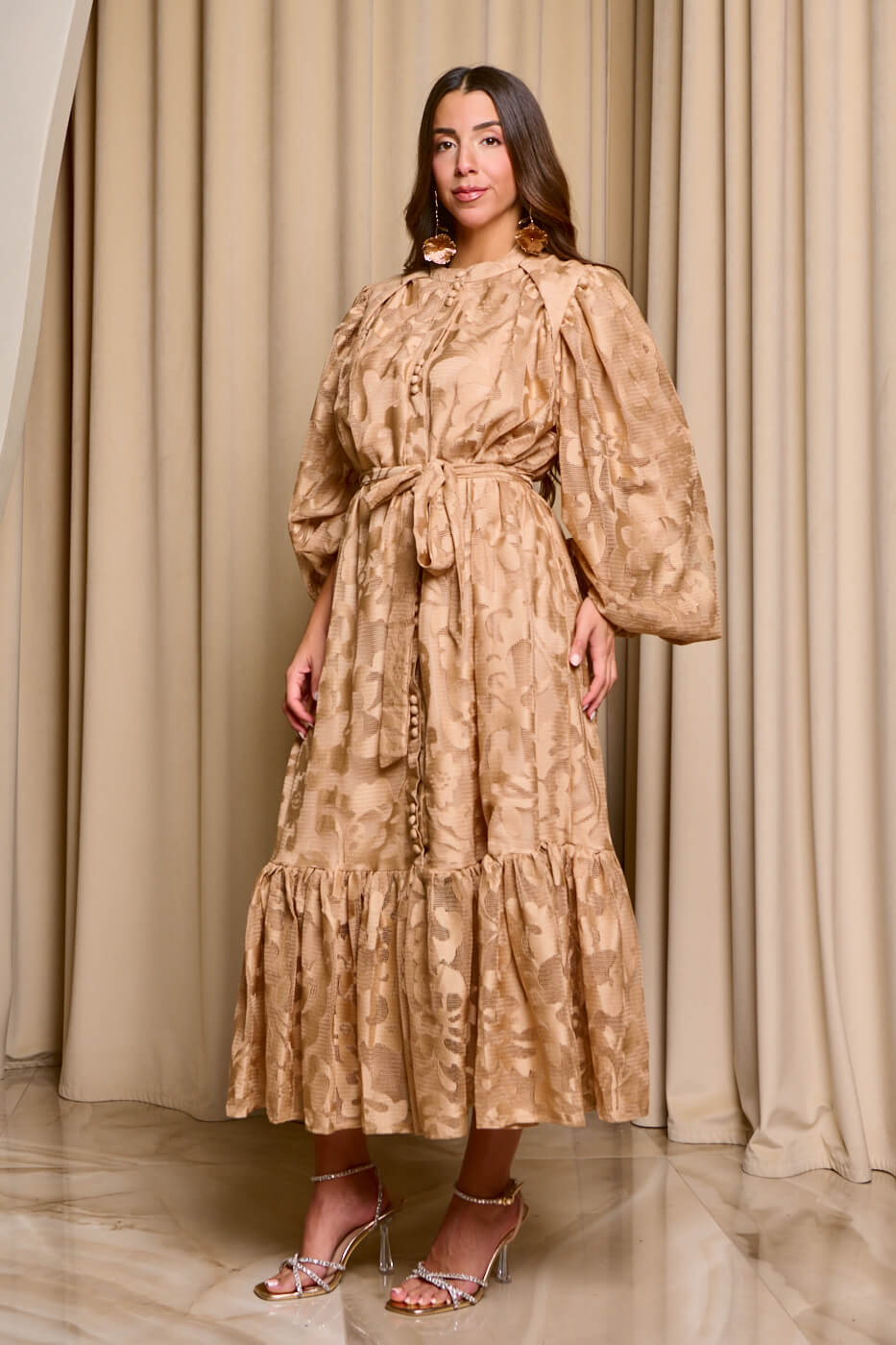 Φόρεμα midi με ανάγλυφα μοτίβα και balloon μανίκια μπεζ. Το ύφασμα έχει ανάγλυφη υφή με σχέδιο σε διάφανη δαντελένια ύφανση, που του χαρίζει πολυτελή χαρακτήρα. Με ψηλή, στρογγυλή λαιμόκοψη που κουμπώνει μπροστά με επενδυμένα κουμπιά από το ίδιο ύφασμα και χρώμα. Διαθέτει φαρδιά, balloon μανίκια με όγκο, ζώνη από το ίδιο ύφασμα που δένει στη μέση και εσωτερική ραμμένη φόδρα.
