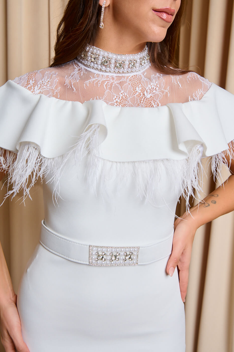 Φόρεμα midi με δαντέλα και πούπουλα άσπρο. Έχει ψιλή λαιμόκοψη διακοσμημένη με πέρλες και στρας. Στο πάνω μέρος έχει διαφανή δαντέλα και βολάν με πούπουλα στο τελείωμα. Διαθέτει εσωτερική φόδρα και δική του αποσπώμενη ζώνη με πέρλες και στρας. Κλείνει με φερμουάρ και κουμπιά και έχει διακριτικό κομψό σκίσιμο πίσω.