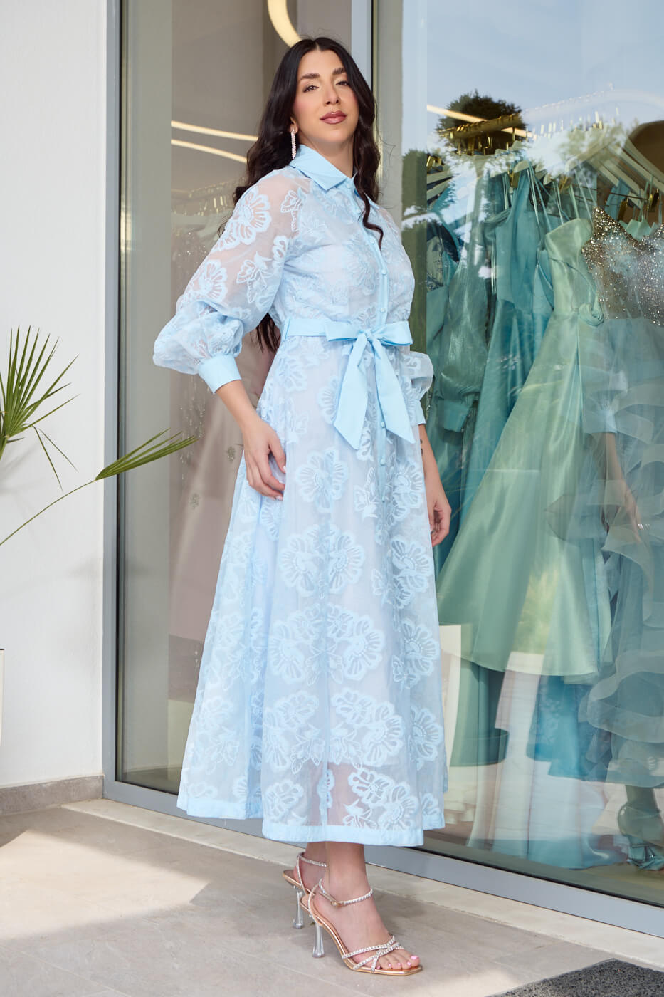 Φόρεμα midi με floral κεντήματα baby blue. Ένα ρομαντικό φόρεμα στην πιο γλυκιά και κομψή baby blue απόχρωση. Διαθέτει ανάγλυφα κεντήματα σε όλο του το μήκος μπροστά και πίσω. Στο πάνω μέρος έχει πέτο γιακά και μακριά ημιδιάφανα μανίκια με μανσέτα και κουμπί στο τελείωμα. Το κάτω μέρος είναι σε άλφα γραμμή με πολύ ωραία κίνηση. Διαθέτει δική του αποσπώμενη ζώνη και εσωτερική φόδρα. Κλείνει με κουμπιά μπροστά. Ιδανικό για επίσημες λαμπερές εμφανίσεις που ξεχωρίζουν για το στυλ και τη ρομαντική τους διάθεση.