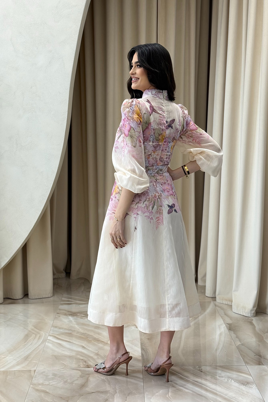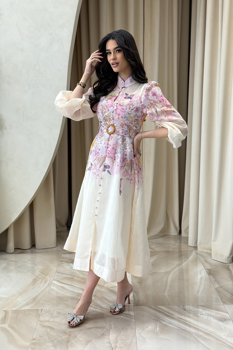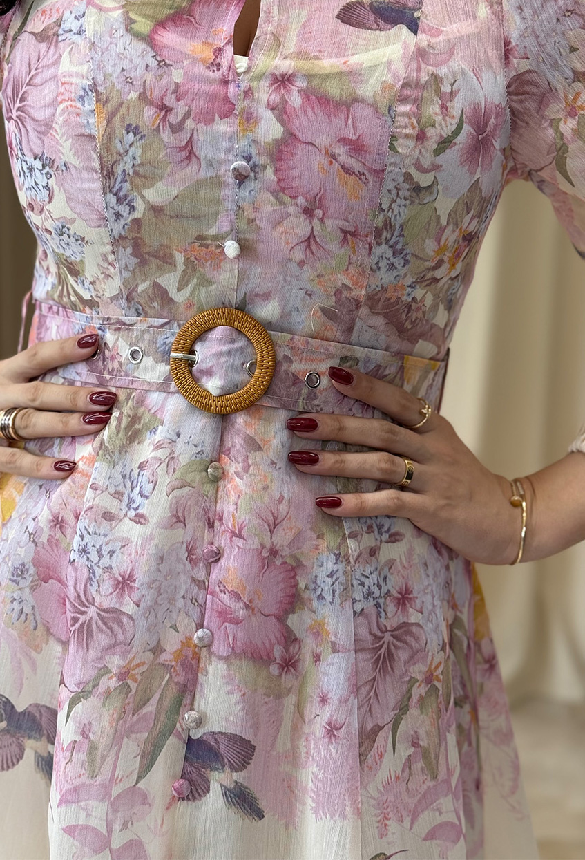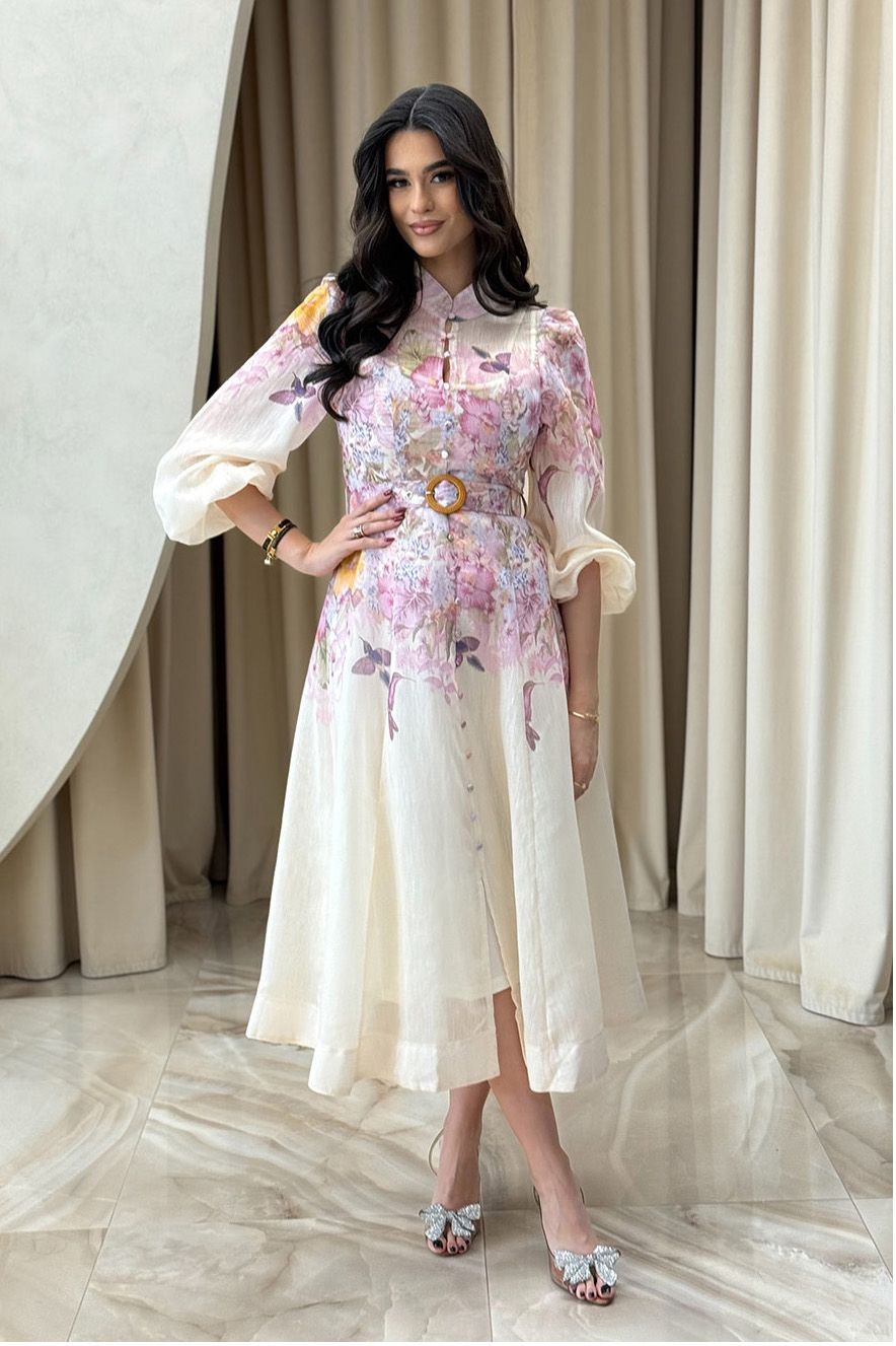 Φόρεμα midi με floral σχέδιο και ζώνη ροζ. Αέρινο και κομψό φόρεμα με ρομαντικό floral μοτίβο σε εκρού βάση. Διαθέτει μακριά μανίκια με λάστιχο στο τελείωμα και διακοσμητικά ντυμένα κουμπιά στο μπροστινό μέρος. ‘Εχει δική του αποσπώμενη ζώνη με κοκάλινη αγκράφα και ίδιο floral μοτίβο καθώς και αποσπώμενο μεσοφόρι. Κλείνει με φερμουάρ πίσω. Ιδανικό για κομψές εμφανίσεις με ρομαντική διάθεση.