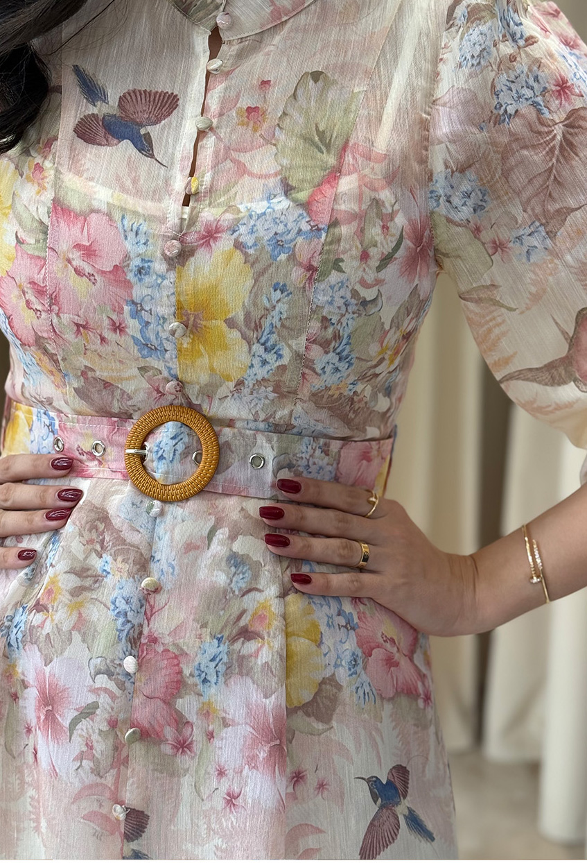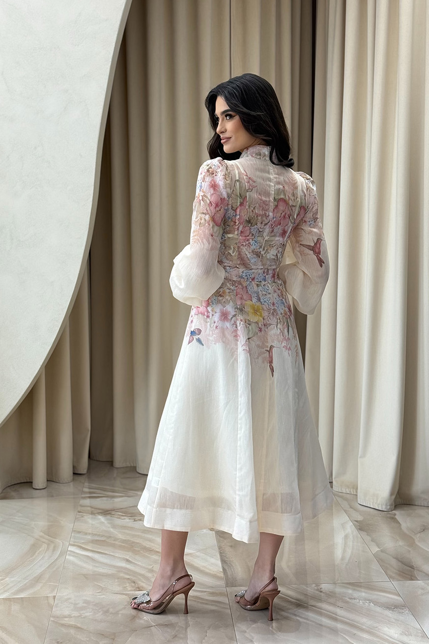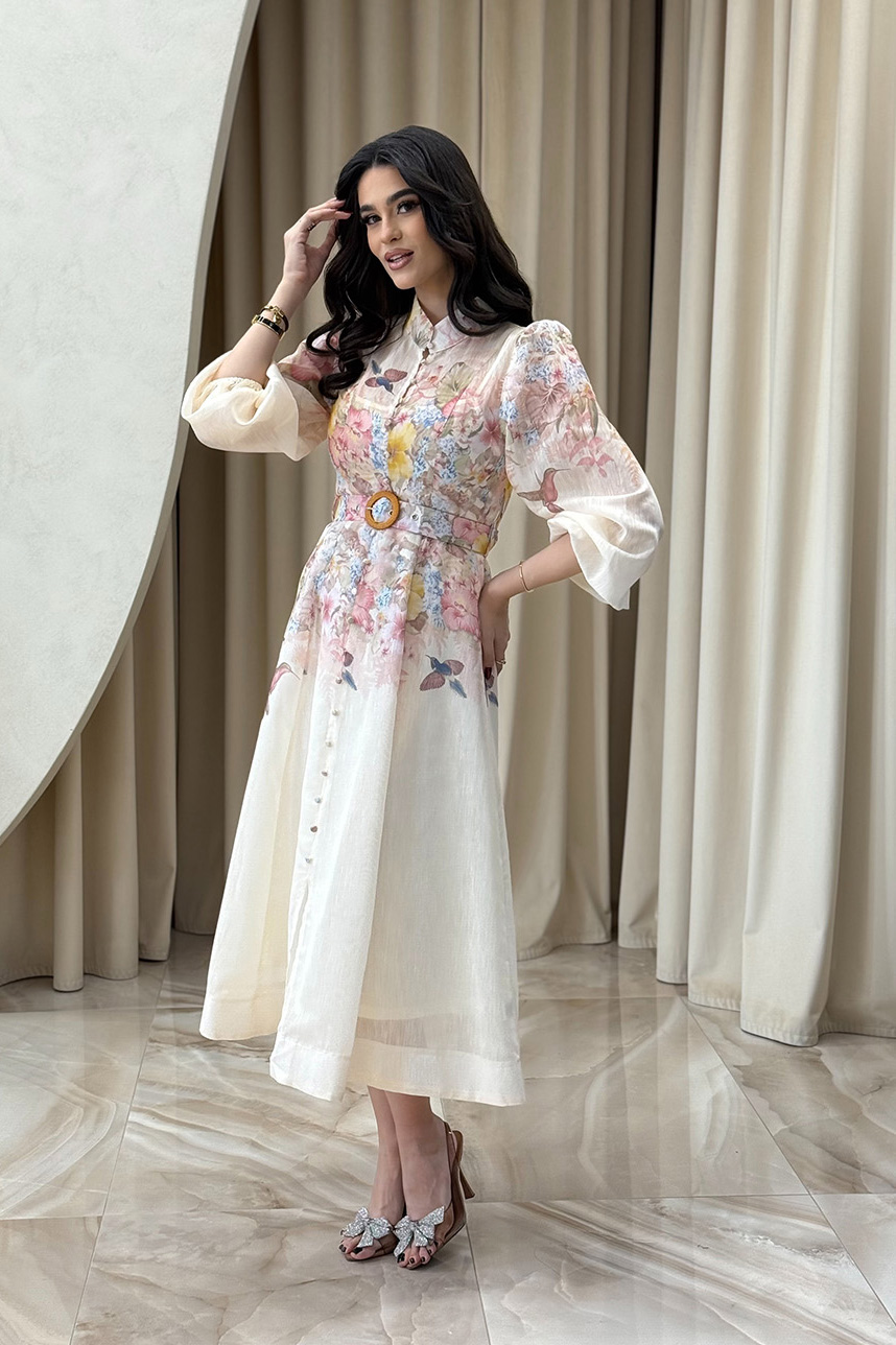 Φόρεμα midi με floral σχέδιο και ζώνη εκρού. Αέρινο και κομψό φόρεμα με ρομαντικό floral μοτίβο σε εκρού βάση. Διαθέτει μακριά μανίκια με λάστιχο στο τελείωμα και διακοσμητικά ντυμένα κουμπιά στο μπροστινό μέρος. ‘Εχει δική του αποσπώμενη ζώνη με κοκάλινη αγκράφα και ίδιο floral μοτίβο καθώς και αποσπώμενο μεσοφόρι. Κλείνει με φερμουάρ πίσω. Ιδανικό για κομψές εμφανίσεις με ρομαντική διάθεση.