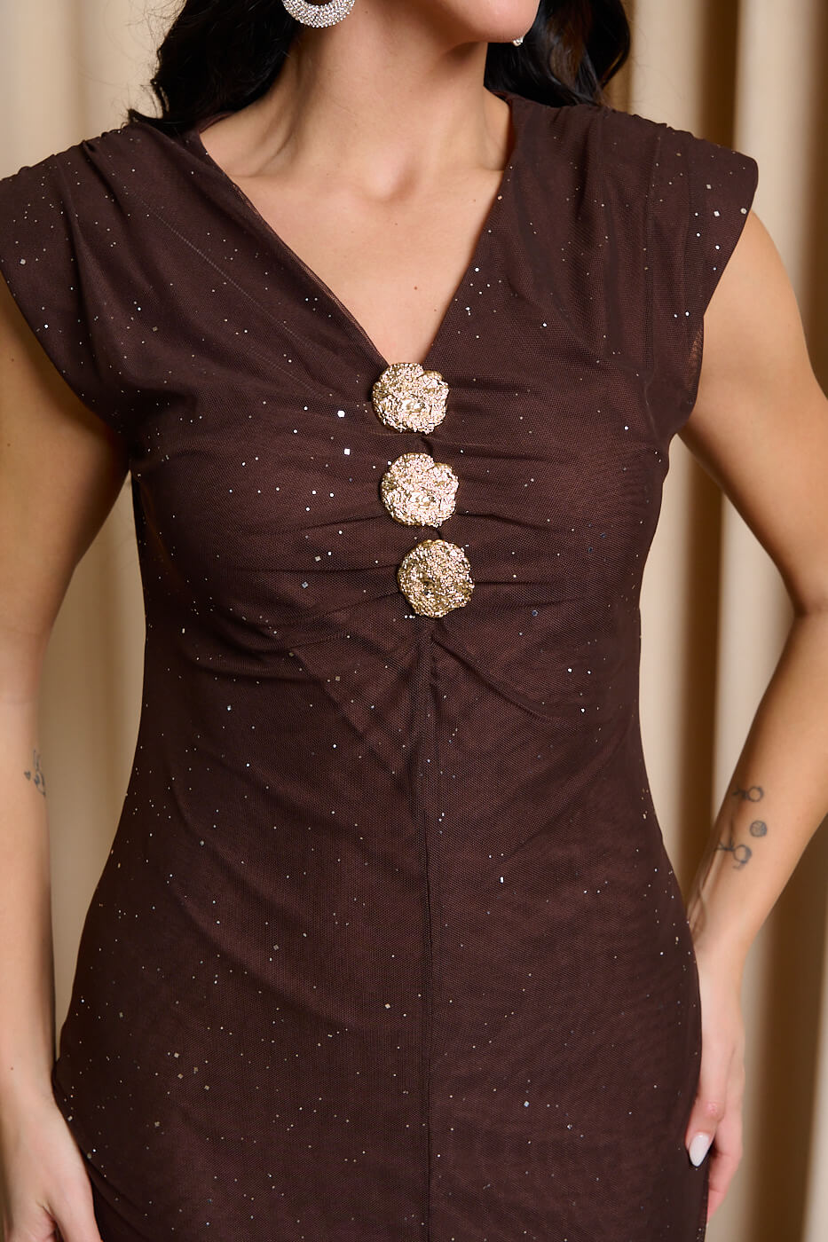 Φόρεμα midi με τούλι και χρυσές λεπτομέρειες καφέ. Ένα κομψό φόρεμα σε καφέ απόχρωση με ελαστικό τούλι και διακριτικό γκλιτερ σε όλο το μήκος του. Διαθέτει V ντεκολτέ με σούρες και διακοσμητικά χρυσά κουμπιά. Έχει εσωτερική φόδρα μέχρι τους μηρούς και από εκεί και κάτω κάνει διαφάνεια που δημιουργεί ένα ιδιαίτερο layering. Διαθέτει βάτες στους ώμους. Ιδανικό για επίσημες και γιορτινές εμφανίσεις με λάμψη και κομψότητα.