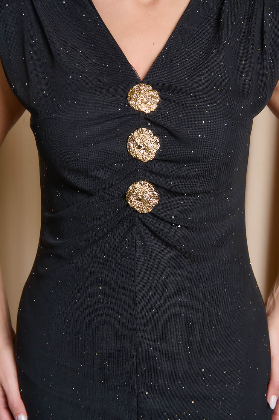 Φόρεμα midi με τούλι και χρυσές λεπτομέρειες μαύρο. Ένα κομψό και διαχρονικό μαύρο φόρεμα με ελαστικό τούλι και διακριτικό γκλιτερ σε όλο το μήκος του. Διαθέτει V ντεκολτέ με σούρες και διακοσμητικά χρυσά κουμπιά. Έχει εσωτερική φόδρα μέχρι τους μηρούς και από εκεί και κάτω κάνει διαφάνεια που δημιουργεί ένα ιδιαίτερο layering. Διαθέτει βάτες στους ώμους. Ιδανικό για επίσημες και γιορτινές εμφανίσεις με λάμψη και κομψότητα.