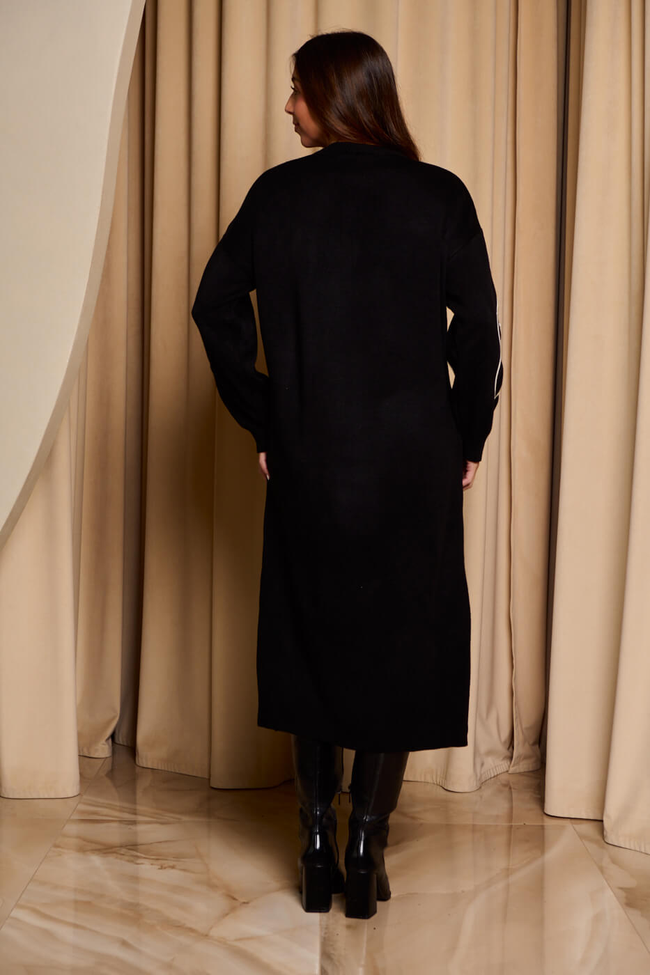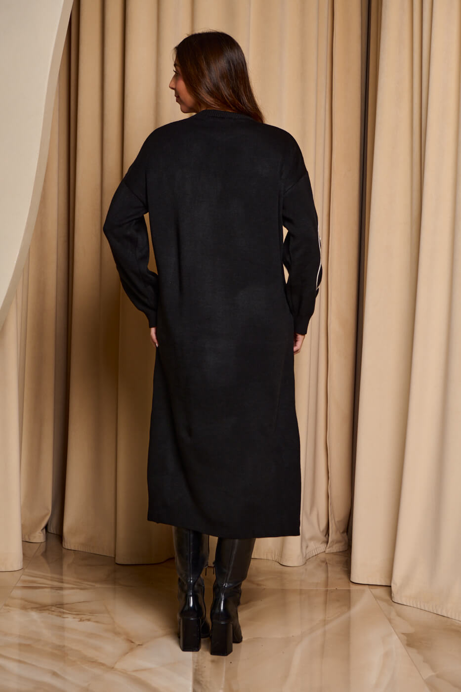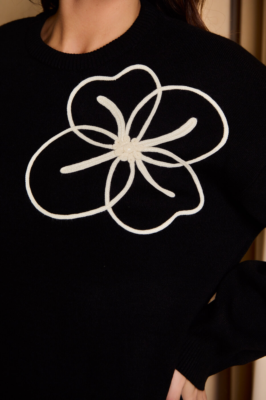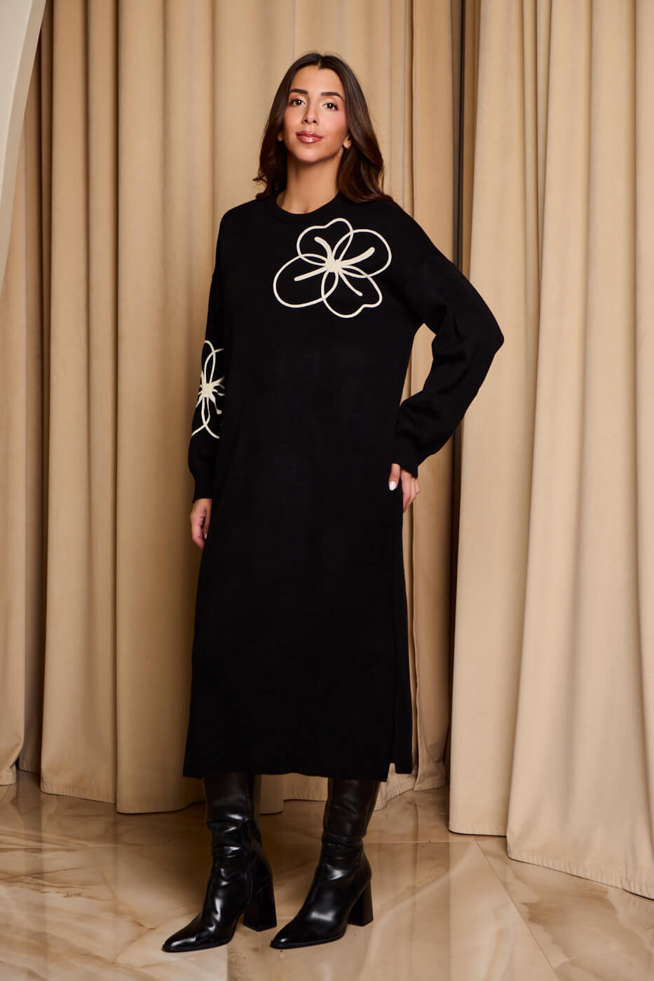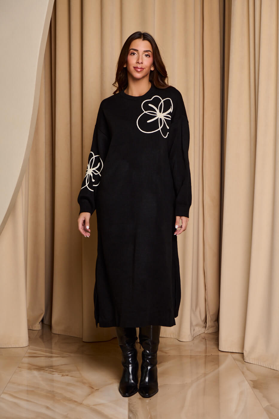 Φόρεμα midi πλεκτό με σχέδιο λουλούδι μαύρο. Διαθέτει δύο μικρά σκισίματα στο τελείωμα στο πλάι, στρογγυλή λαιμόκοψη και ελαστικό τελείωμα στα μανίκια. Είναι μαύρο με σχέδιο λουλούδι στο ένα μανίκι και στο πάνω μπροστινό μέρος.