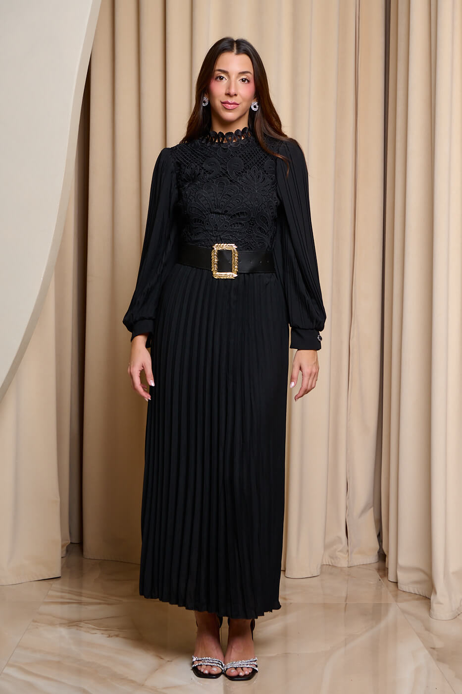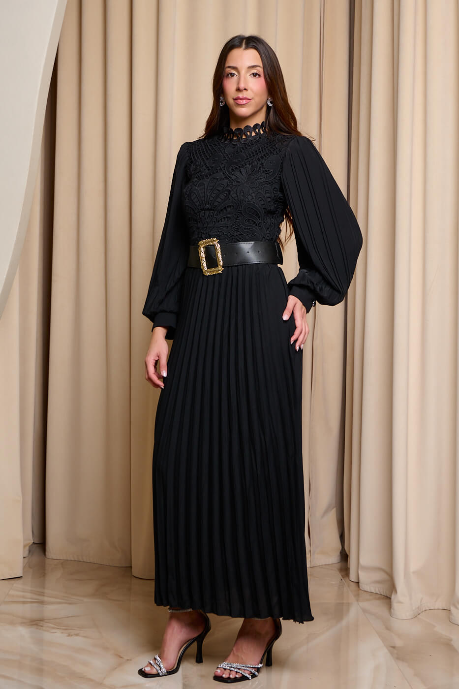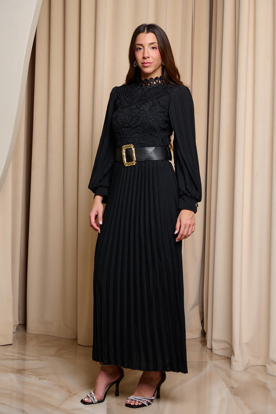 Φόρεμα midi πλισέ με δαντέλα και ζώνη μαύρο . Ένα αέρινο φόρεμα με ρομαντική διάθεση σε μαύρο χρώμα. Το πάνω μέρος είναι με δαντέλα και ψιλή λαιμόκοψη. Τα μανίκια είναι μακριά, πλισέ με μανσέτες στο τελείωμα και διακοσμητικό κουμπί κόσμημα. Το κάτω μέρος είναι πλισέ σε ίσια γραμμή. Διαθέτει δική του αποσπώμενη ζώνη με χρυσή τετράγωνη τόκα σε σχήμα φύλλων. Έχει εσωτερική φόδρα και κλείνει με φερμουάρ πίσω. Ιδανικό για outfits με στυλ , κομψότητα και ρομαντική αισθητική.