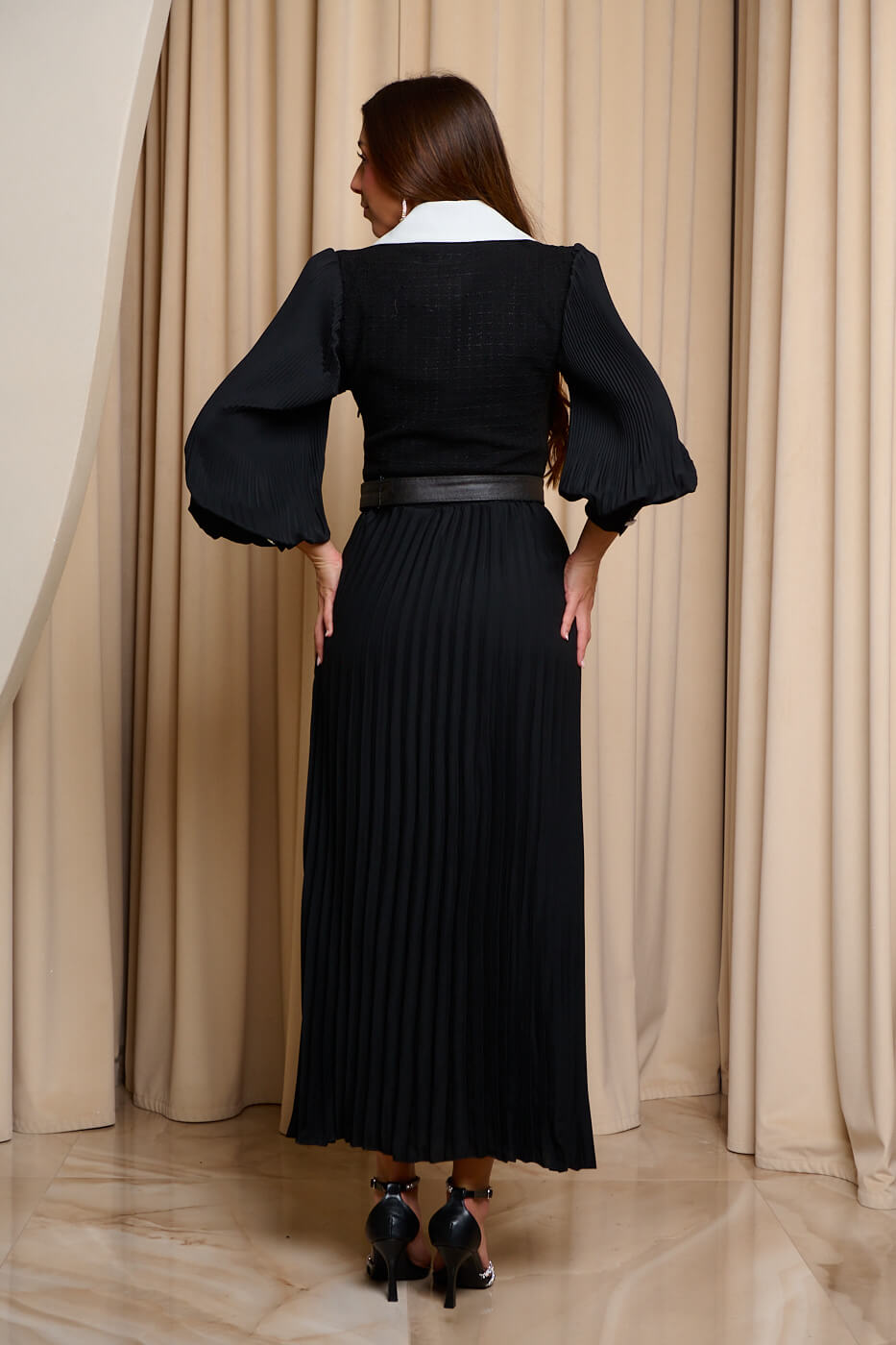 Φόρεμα midi πλισέ με tweed λεπτομέρεια μαύρο. Το επάνω μέρος είναι tweed με λευκό πέτο γιακά και διακοσμητικά κουμπιά. Τα μανίκια είναι πλισέ με βάτες στους ώμους και μανσέτες με διακοσμητικό άσπρο κουμπί. Το κάτω μέρος είναι πλισέ σε ίσια γραμμή. Διαθέτει δική του αποσπώμενη ζώνη και εσωτερική φόδρα. Κλείνει με φερμουάρ στο πλάι.