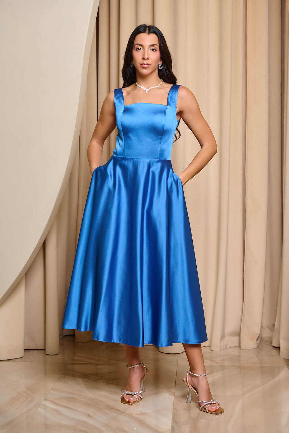 Φόρεμα midi σατέν με τιράντες indigo . Διαθέτει χοντρές τιράντες, cups στο μπούστο και τσέπες. Είναι σε Α γραμμή και κλείνει με φερμουάρ από πίσω. Έχει τετράγωνη λαιμόκοψη.