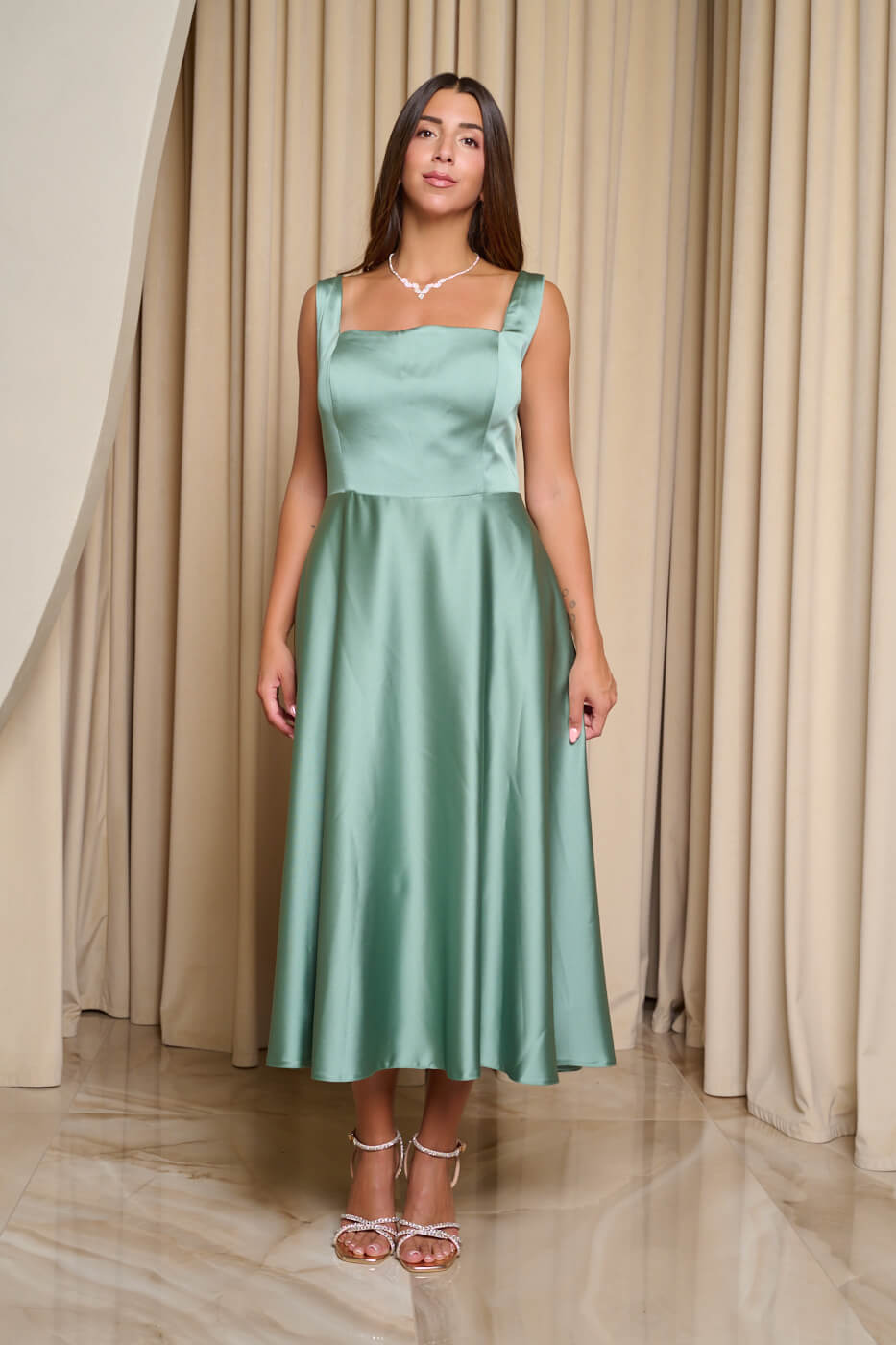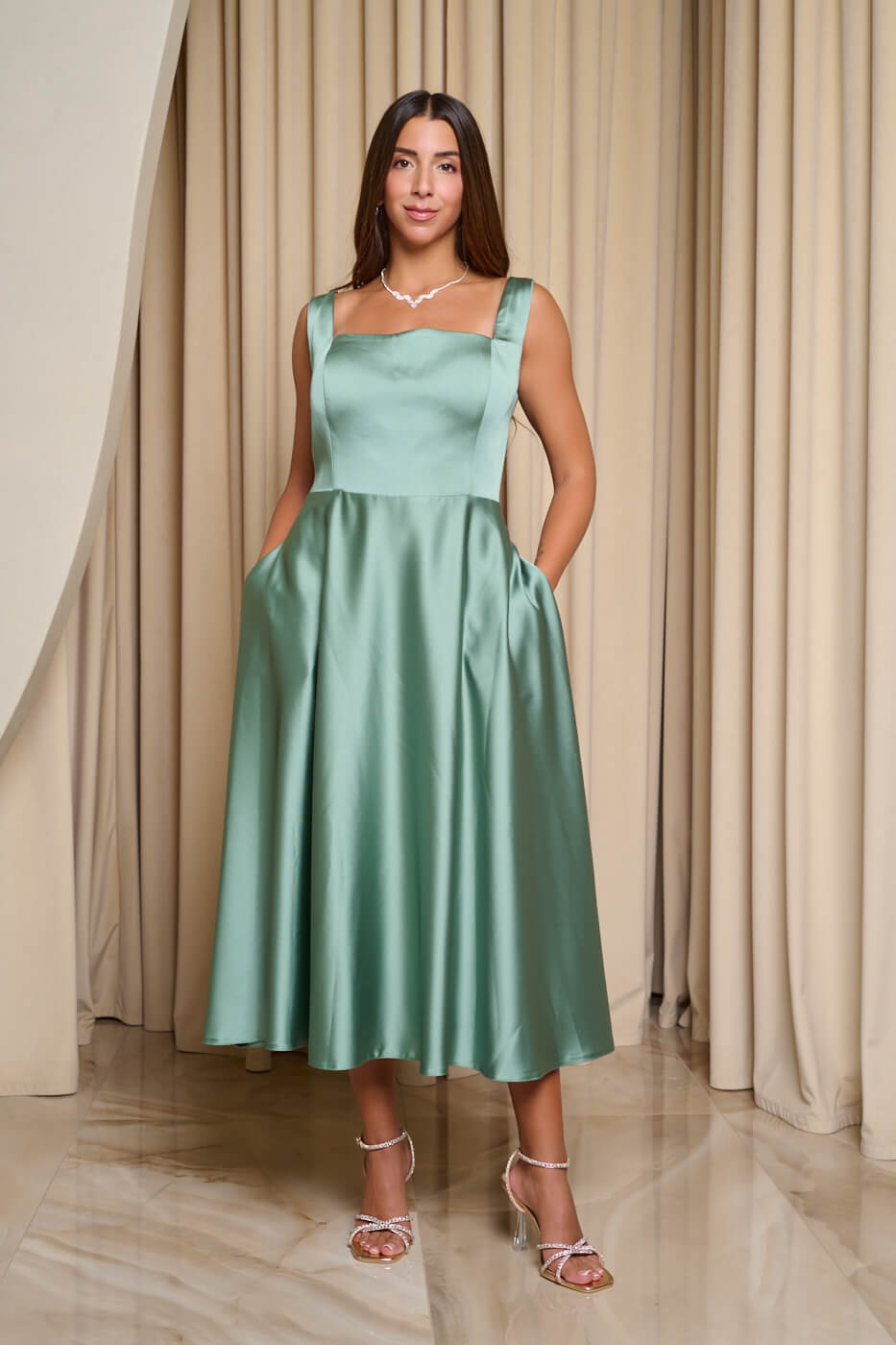 Φόρεμα midi σατέν με τιράντες μέντα. Διαθέτει χοντρές τιράντες, cups στο μπούστο και τσέπες. Είναι σε Α γραμμή και κλείνει με φερμουάρ από πίσω. Έχει τετράγωνη λαιμόκοψη.