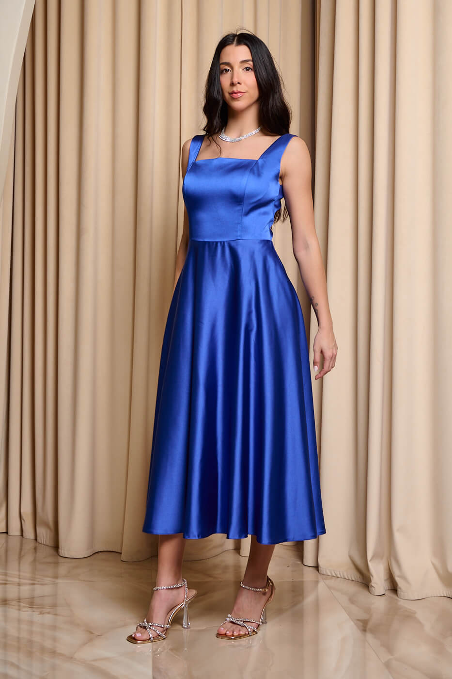 Φόρεμα midi σατέν με τιράντες μπλε ρουά. Διαθέτει χοντρές τιράντες, cups στο μπούστο και τσέπες. Είναι σε Α γραμμή και κλείνει με φερμουάρ από πίσω. Έχει τετράγωνη λαιμόκοψη.