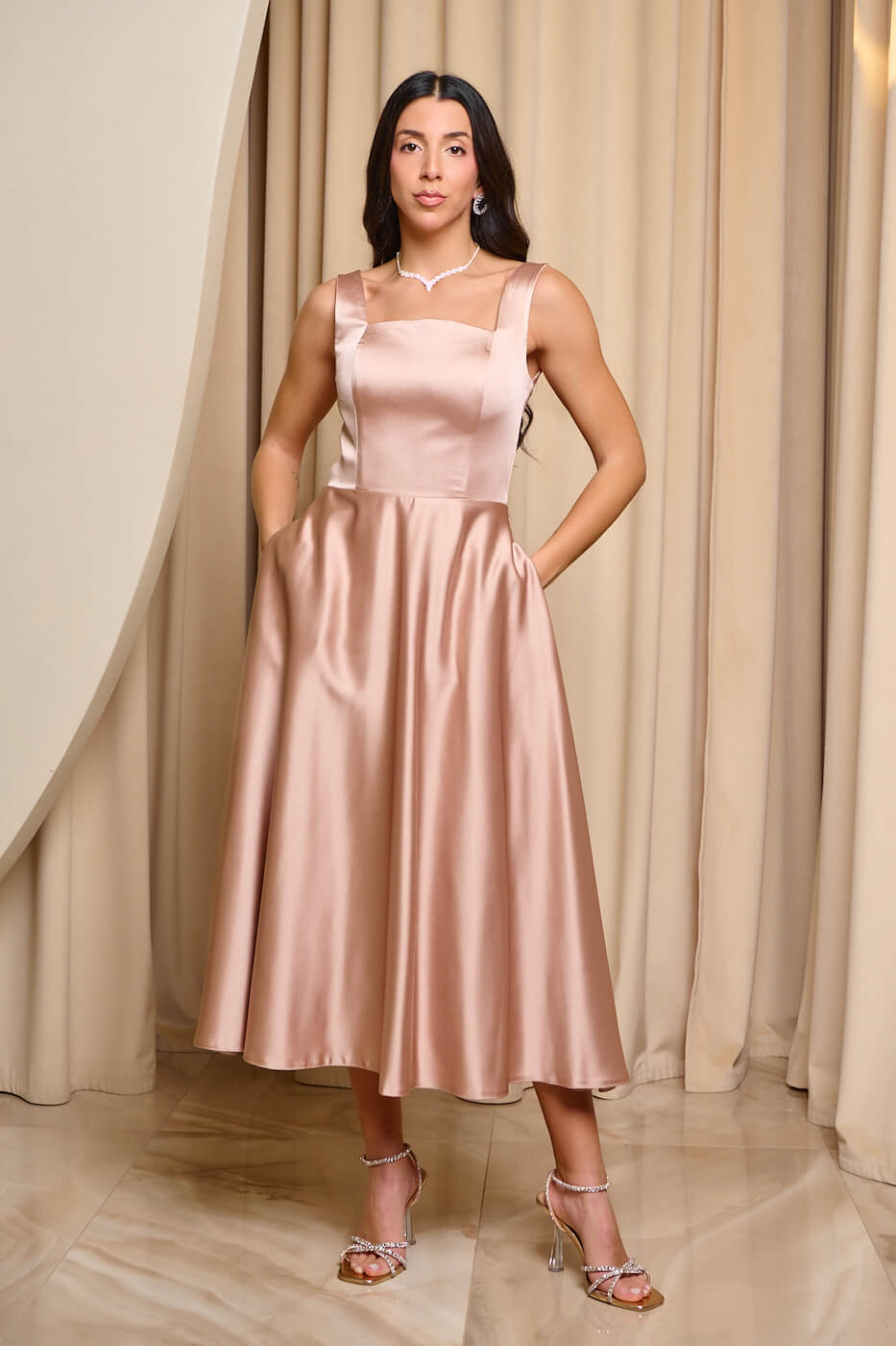 Φόρεμα midi σατέν με τιράντες σαμπανιζέ. Διαθέτει χοντρές τιράντες, cups στο μπούστο και τσέπες. Είναι σε Α γραμμή και κλείνει με φερμουάρ από πίσω. Έχει τετράγωνη λαιμόκοψη.