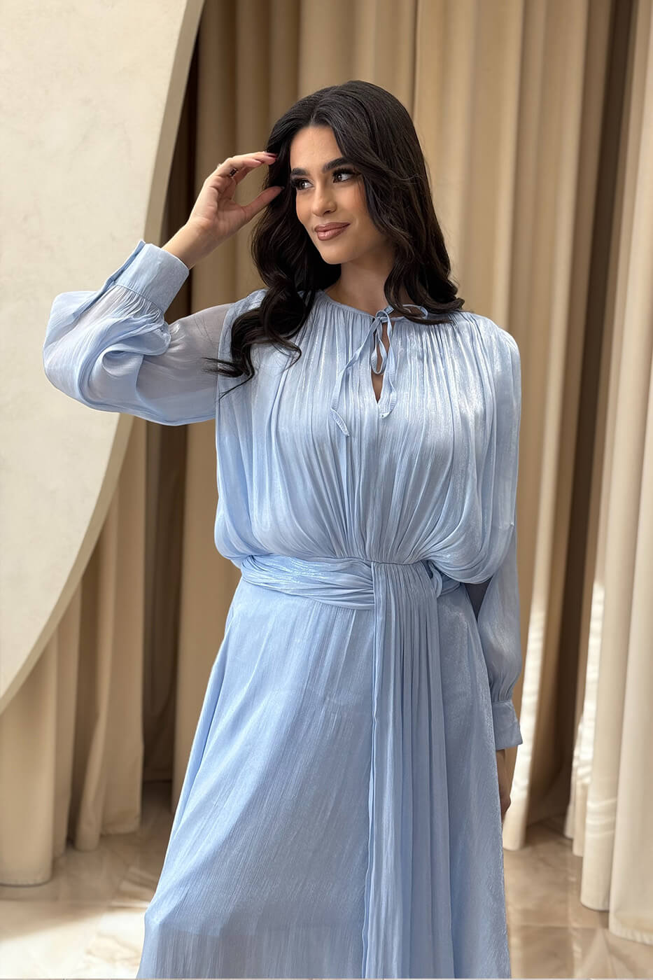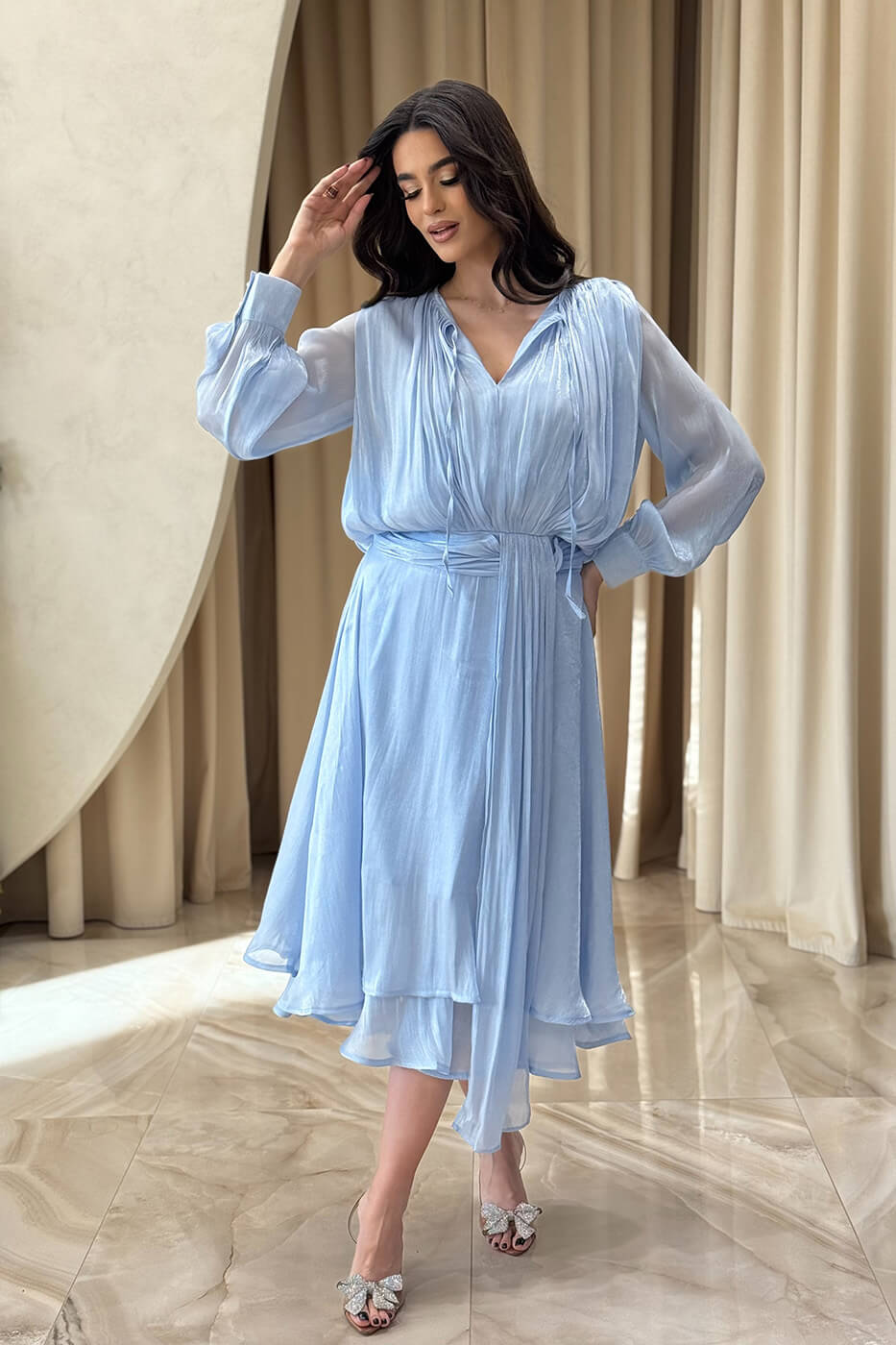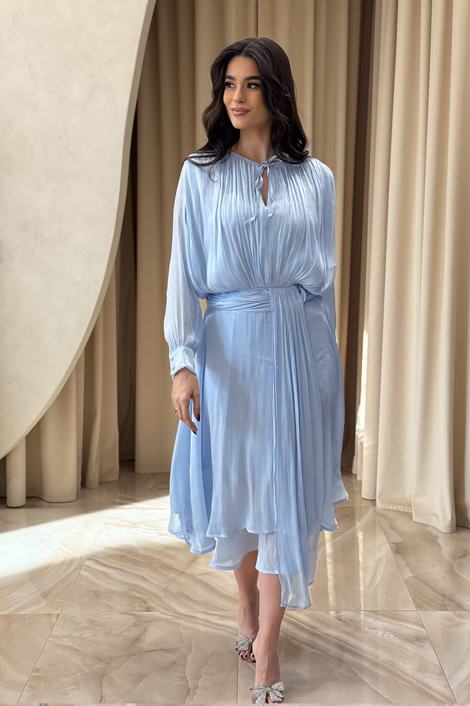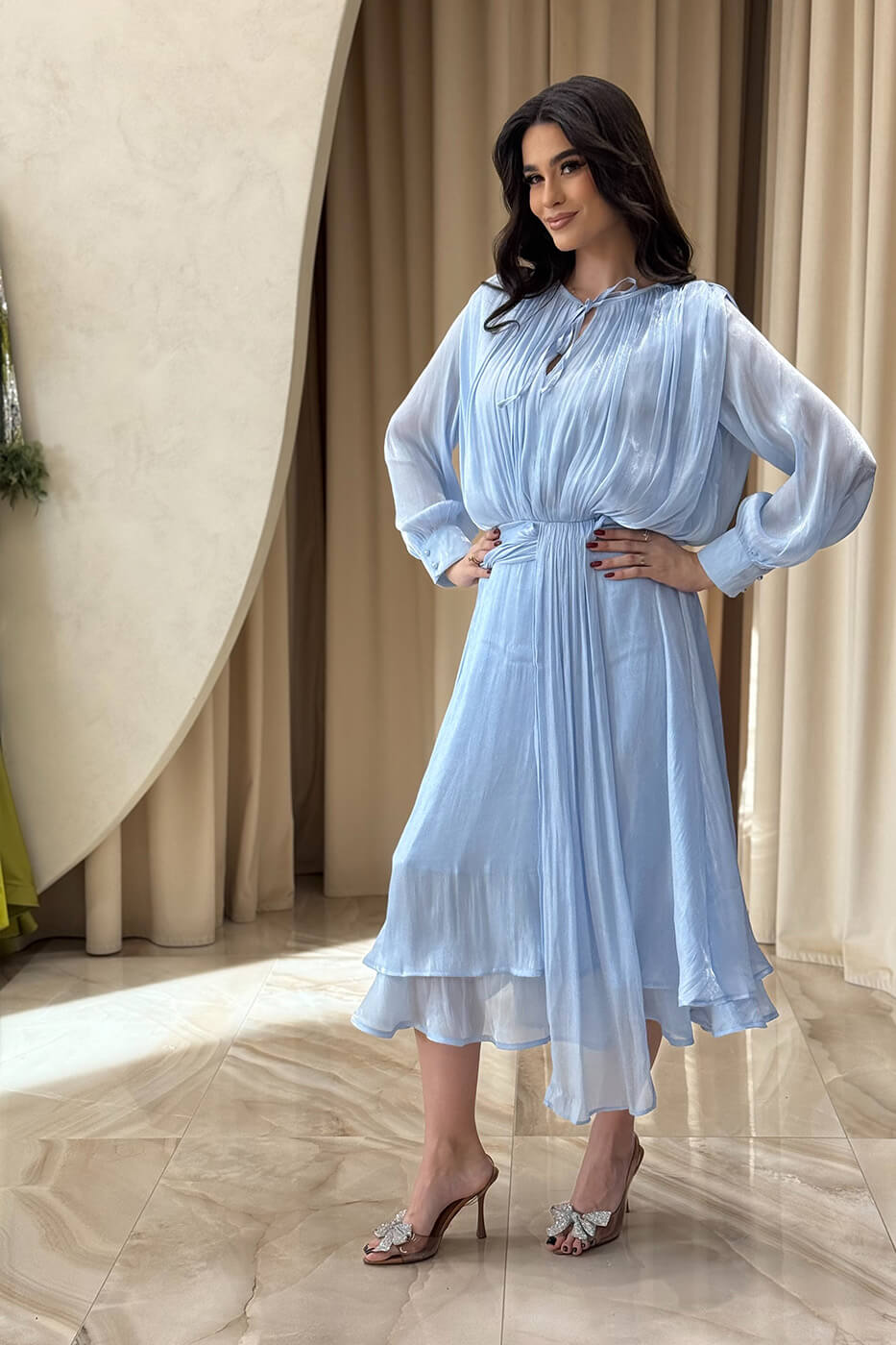 Φόρεμα midi σατινέ baby blue . Αέρινο κομψό και εντυπωσιακό midi φόρεμα στην απόλυτη baby blue απόχρωση. Διαθέτει mao γιακά με δέσιμο μπροστά και μακριά μανίκια με μανσέτα και περλέ κουμπιά στον ίδιο τόνο. Η σφηκοφωλιά και η ενσωματωμένη twisted ζώνη τονίζουν πολύ ωραία τη μέση και προσφέρουν ελαστικότητα. Το κάτω μέρος είναι αέρινο με δύο διαδοχικά βολάν που προσφέρουν υπέροχη κίνηση. Το ύφασμα του είναι ημιδιάφανο σατινέ με διακριτική λάμψη. Επιπλέον, διαθέτει εσωτερική φόδρα. Ιδανικό για κομψές επίσημες εμφανίσεις με ρομαντική διάθεση.