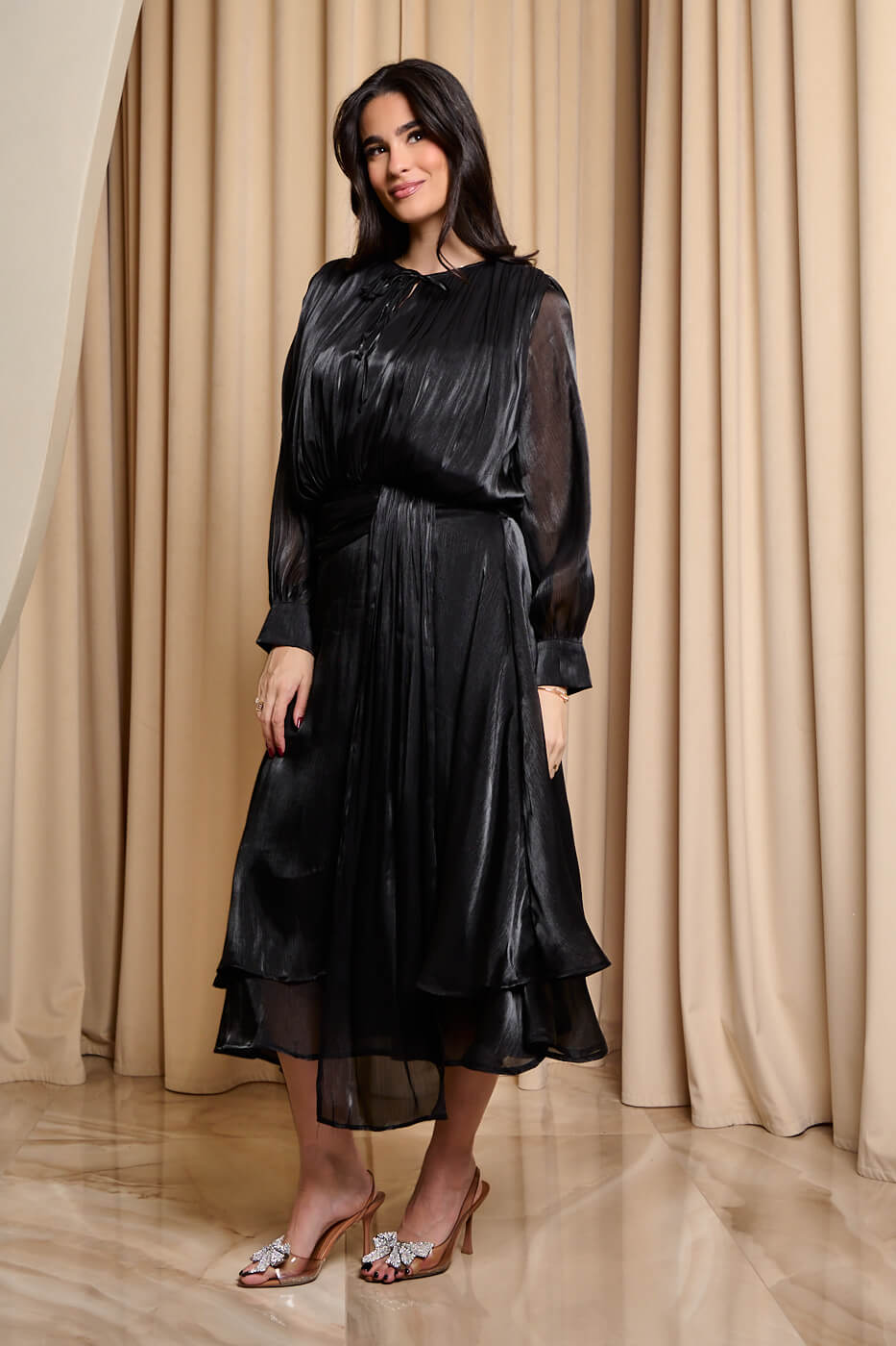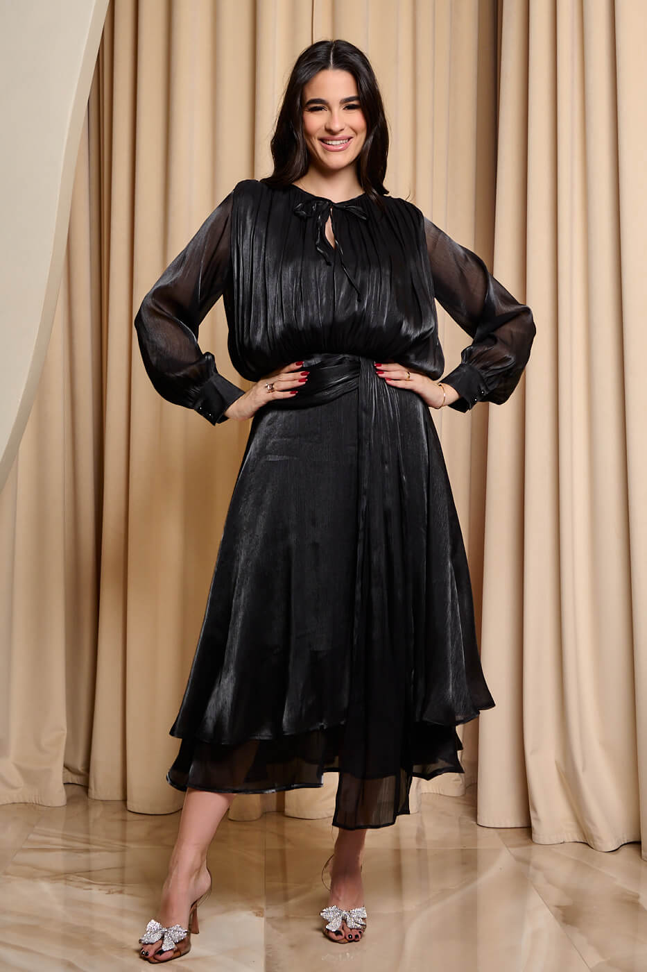 Φόρεμα midi σατινέ μαύρο . Αέρινο κομψό και εντυπωσιακό midi φόρεμα στο απόλυτα διαχρονικό μαύρο χρώμα. Διαθέτει mao γιακά με δέσιμο μπροστά και μακριά μανίκια με μανσέτα και περλέ κουμπιά στον ίδιο τόνο. Η σφηκοφωλιά και η ενσωματωμένη twisted ζώνη τονίζουν πολύ ωραία τη μέση και προσφέρουν ελαστικότητα. Το κάτω μέρος είναι αέρινο με δύο διαδοχικά βολάν που προσφέρουν υπέροχη κίνηση. Το ύφασμα του είναι ημιδιάφανο σατινέ με διακριτική λάμψη. Επιπλέον, διαθέτει εσωτερική φόδρα. Ιδανικό για κομψές επίσημες εμφανίσεις με ρομαντική διάθεση.