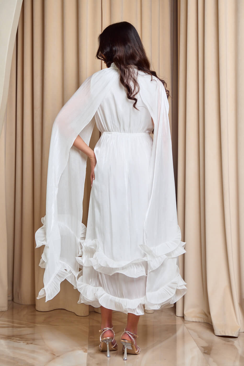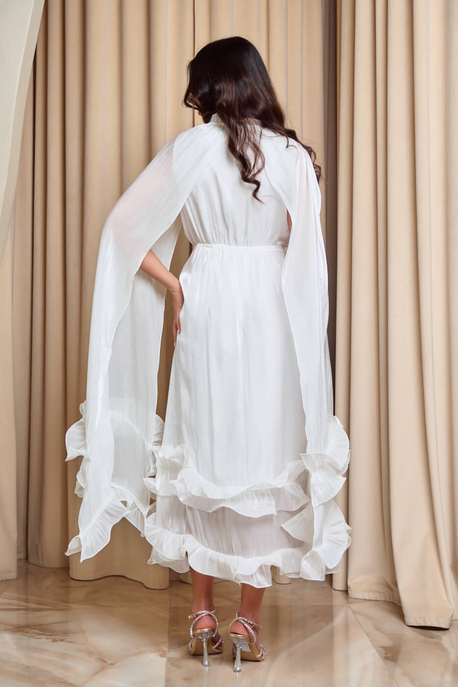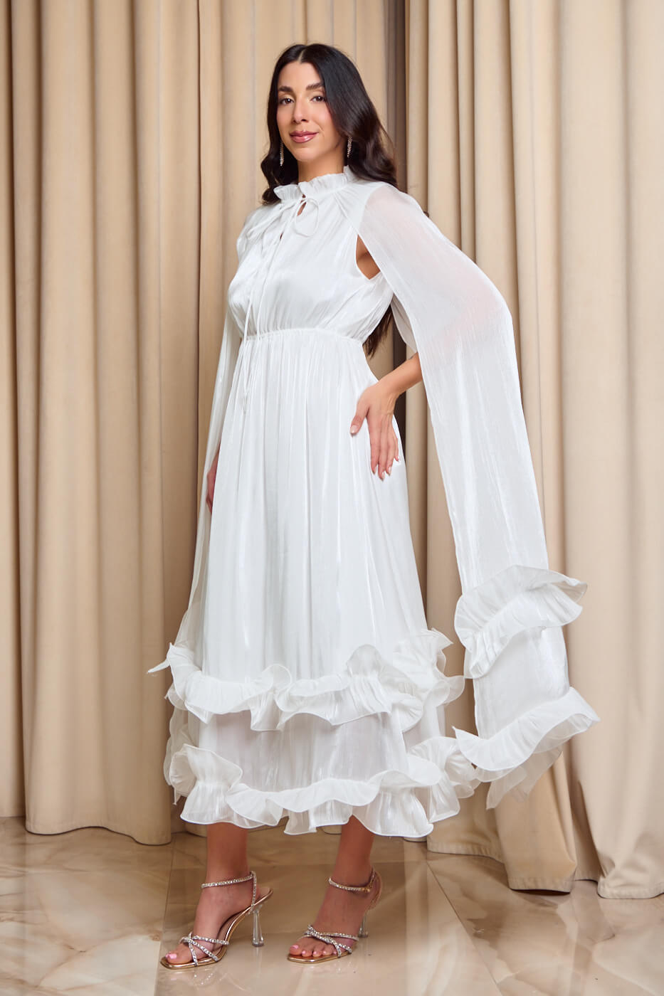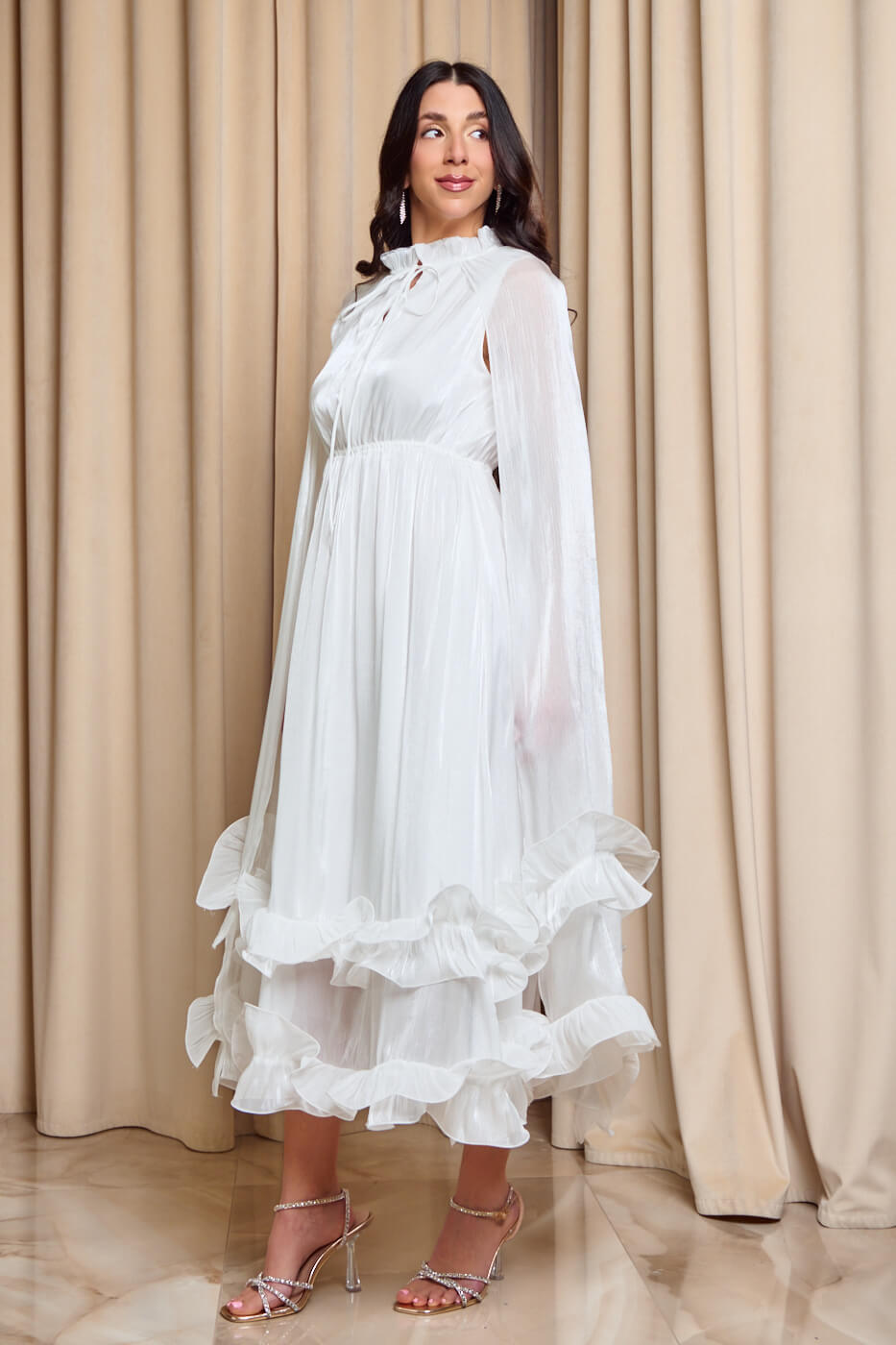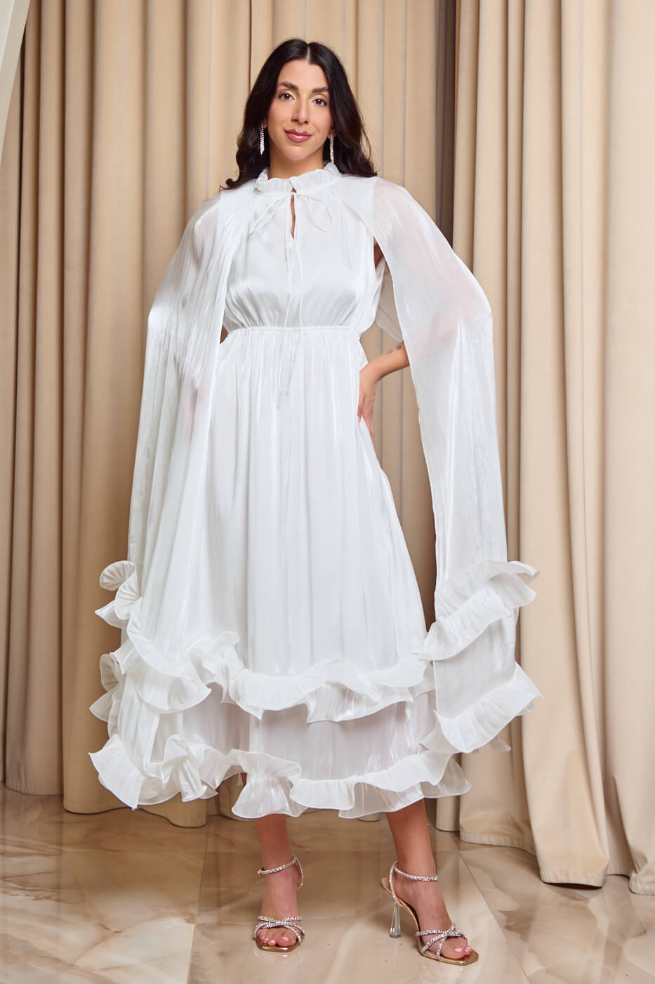 Φόρεμα midi σατινέ με βολάν και κάπα άσπρο