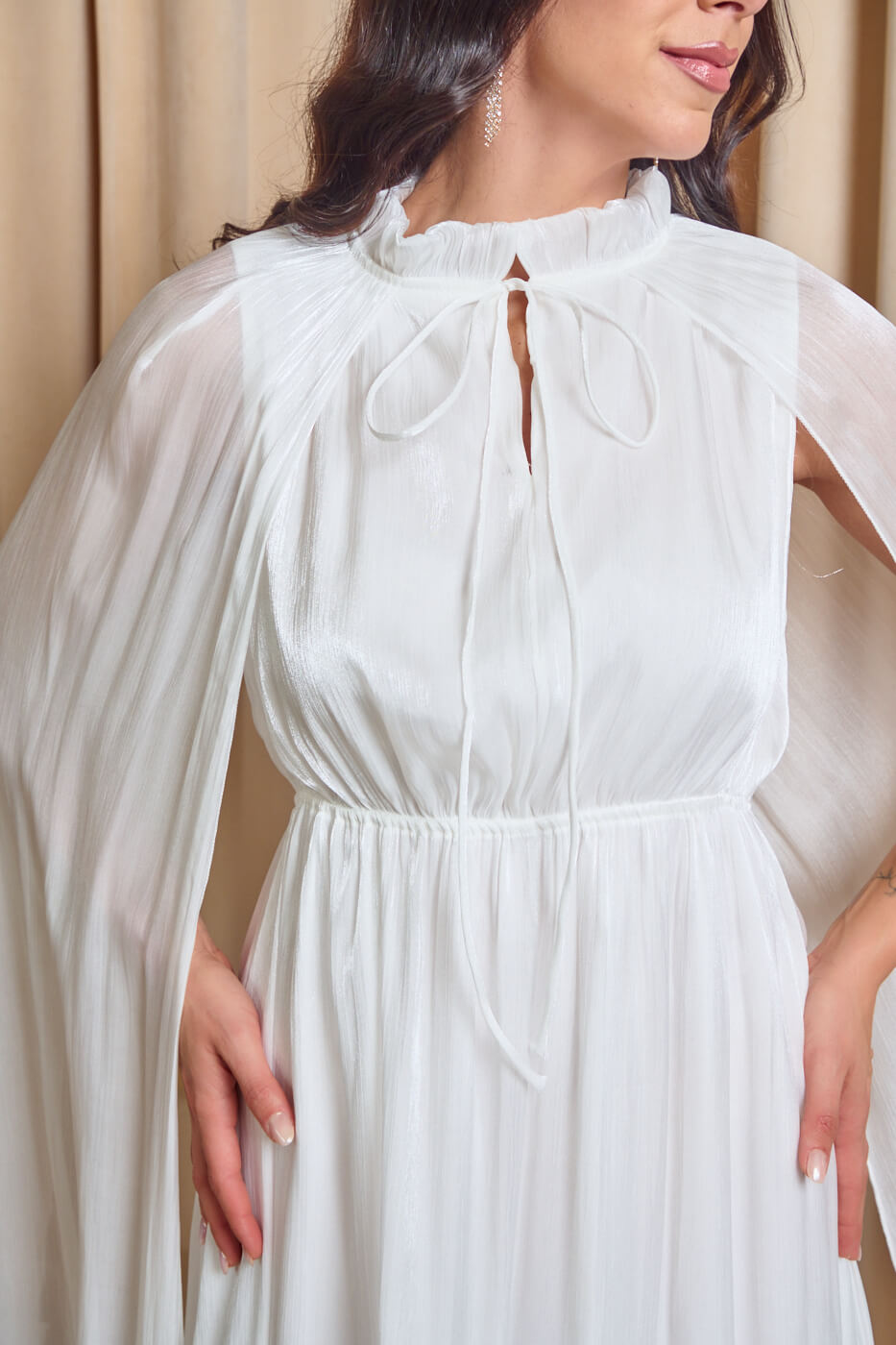 Φόρεμα midi σατινέ με βολάν και κάπα άσπρο. Ένα κομψό midi φόρεμα στην απόλυτα διαχρονική λευκή απόχρωση. Στο πάνω μέρος διαθέτει ενσωματωμένη κάπα που δένει στο λαιμό και δημιουργεί mao γιακά με βολάν. Η κάπα καταλήγει σε εντυπωσιακά βολάν. Το κάτω μέρος είναι σε άλφα γραμμή αέρινο με αντίστοιχα βολάν στο τελείωμα. Το σατινέ ύφασμα του προσφέρει μια διακριτική και απόλυτα κομψή λάμψη. Διαθέτει εσωτερική φόδρα και λάστιχο στη μέση. Ιδανικό για κομψές επίσημες εμφανίσεις που ξεχωρίζουν για την κομψότητα και το ρομαντικό τους χαρακτήρα.