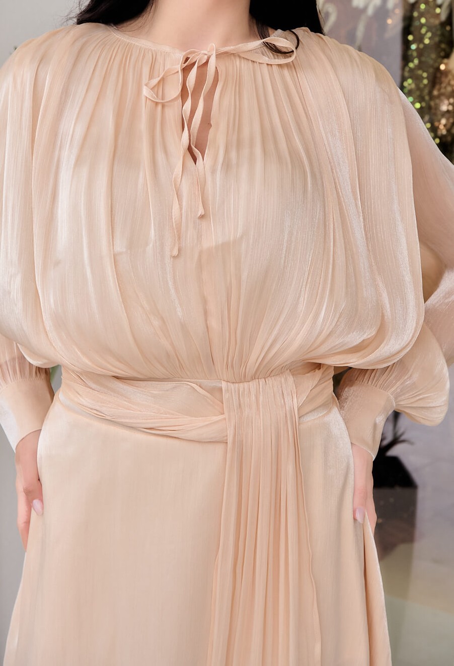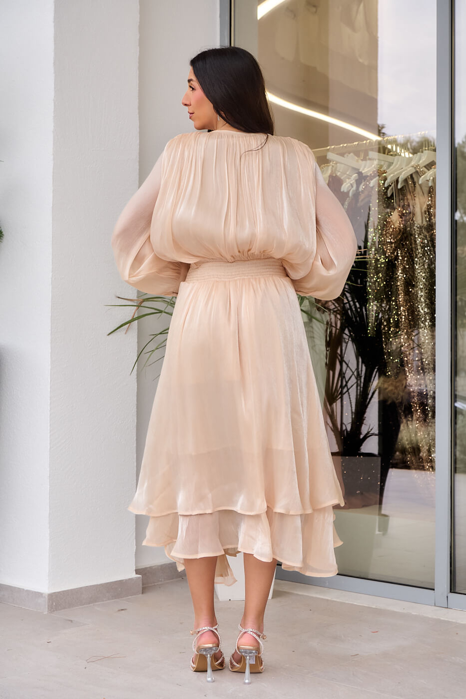 Φόρεμα midi σατινέ μπεζ . Αέρινο κομψό και εντυπωσιακό midi φόρεμα σε μπεζ απόχρωση. Διαθέτει mao γιακά με δέσιμο μπροστά και μακριά μανίκια με μανσέτα και περλέ κουμπιά στον ίδιο τόνο. Η σφηκοφωλιά και η ενσωματωμένη twisted ζώνη τονίζουν πολύ ωραία τη μέση και προσφέρουν ελαστικότητα. Το κάτω μέρος είναι αέρινο με δύο διαδοχικά βολάν που προσφέρουν υπέροχη κίνηση. Το ύφασμα του είναι ημιδιάφανο σατινέ με διακριτική λάμψη. Επιπλέον, διαθέτει εσωτερική φόδρα. Ιδανικό για κομψές επίσημες εμφανίσεις με ρομαντική διάθεση.
