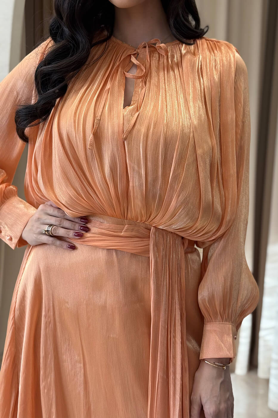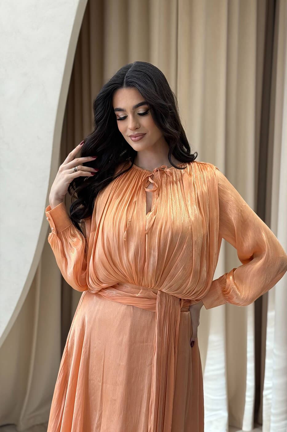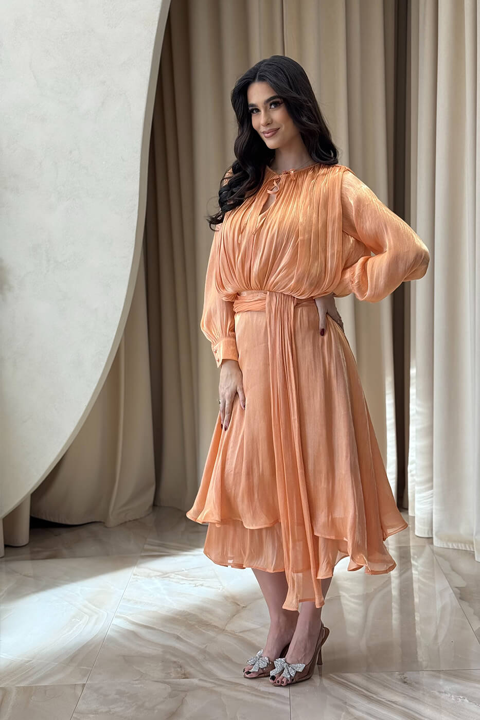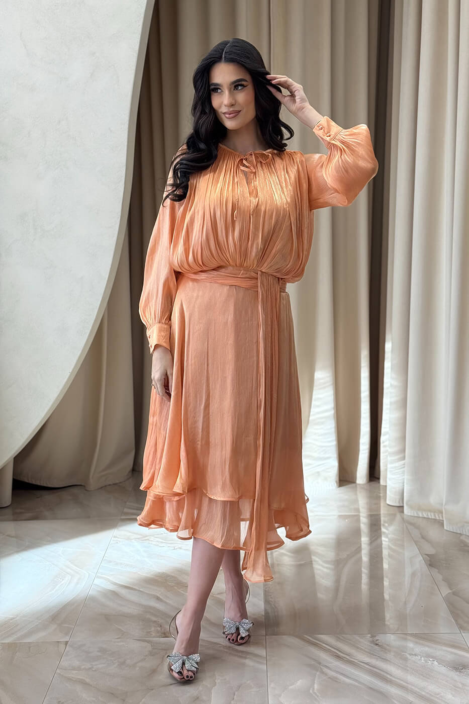 Φόρεμα midi σατινέ πορτοκαλί . Αέρινο κομψό και εντυπωσιακό midi φόρεμα σε πορτοκαλί απόχρωση. Διαθέτει mao γιακά με δέσιμο μπροστά και μακριά μανίκια με μανσέτα και περλέ κουμπιά στον ίδιο τόνο. Η σφηκοφωλιά και η ενσωματωμένη twisted ζώνη τονίζουν πολύ ωραία τη μέση και προσφέρουν ελαστικότητα. Το κάτω μέρος είναι αέρινο με δύο διαδοχικά βολάν που προσφέρουν υπέροχη κίνηση. Το ύφασμα του είναι ημιδιάφανο σατινέ με διακριτική λάμψη. Επιπλέον, διαθέτει εσωτερική φόδρα. Ιδανικό για κομψές επίσημες εμφανίσεις με ρομαντική διάθεση.