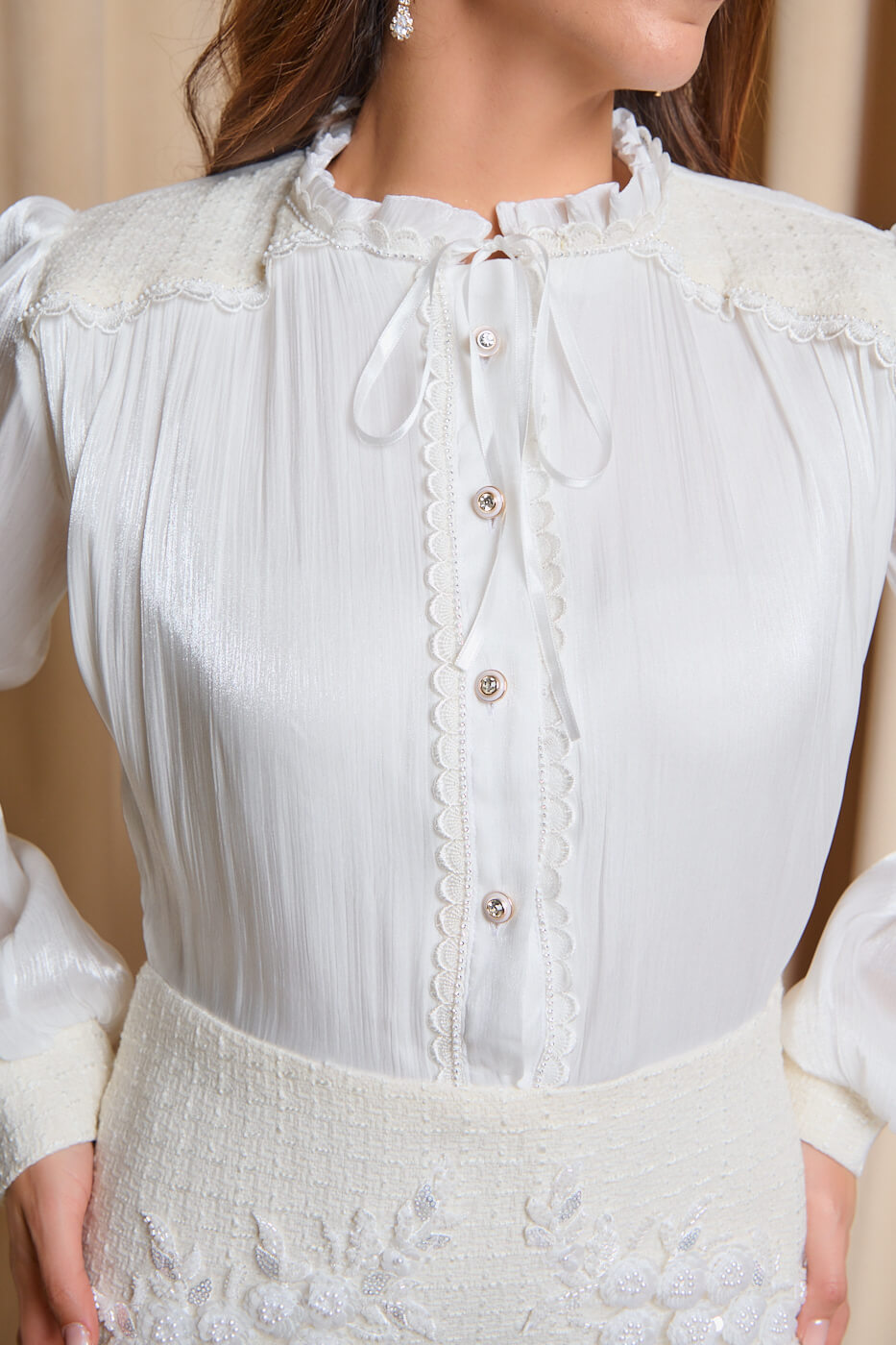 Φόρεμα midi tweed με κεντημένες λεπτομέρειες εκρού-λευκό. Το επάνω μέρος είναι σαν πουκάμισο λευκό με ύφασμα που έχει διακριτική λάμψη και κουμπιά – κόσμημα. Οι λευκές δαντελωτές λεπτομέρειες στο γιακά, στους ώμους και κατά μήκος του πουκαμίσου προσθέτουν μια ρομαντική νότα στο φόρεμα. Διαθέτει μικρό βολάν στη λαιμόκοψη και κορδέλα που δένει στο λαιμό. Τα μανίκια καταλήγουν σε μικρή εκρού μανσέτα με κουμπί – κόσμημα. Το κάτω μέρος είναι εκρού tweed με κεντημένες λεπτομέρειες. Διαθέτει εσωτερική φόδρα και κλείνει με φερμουάρ στο πλάι. Ένα ιδιαίτερο φόρεμα με ρομαντική διάθεση για εμφανίσεις που ξεχωρίζουν.