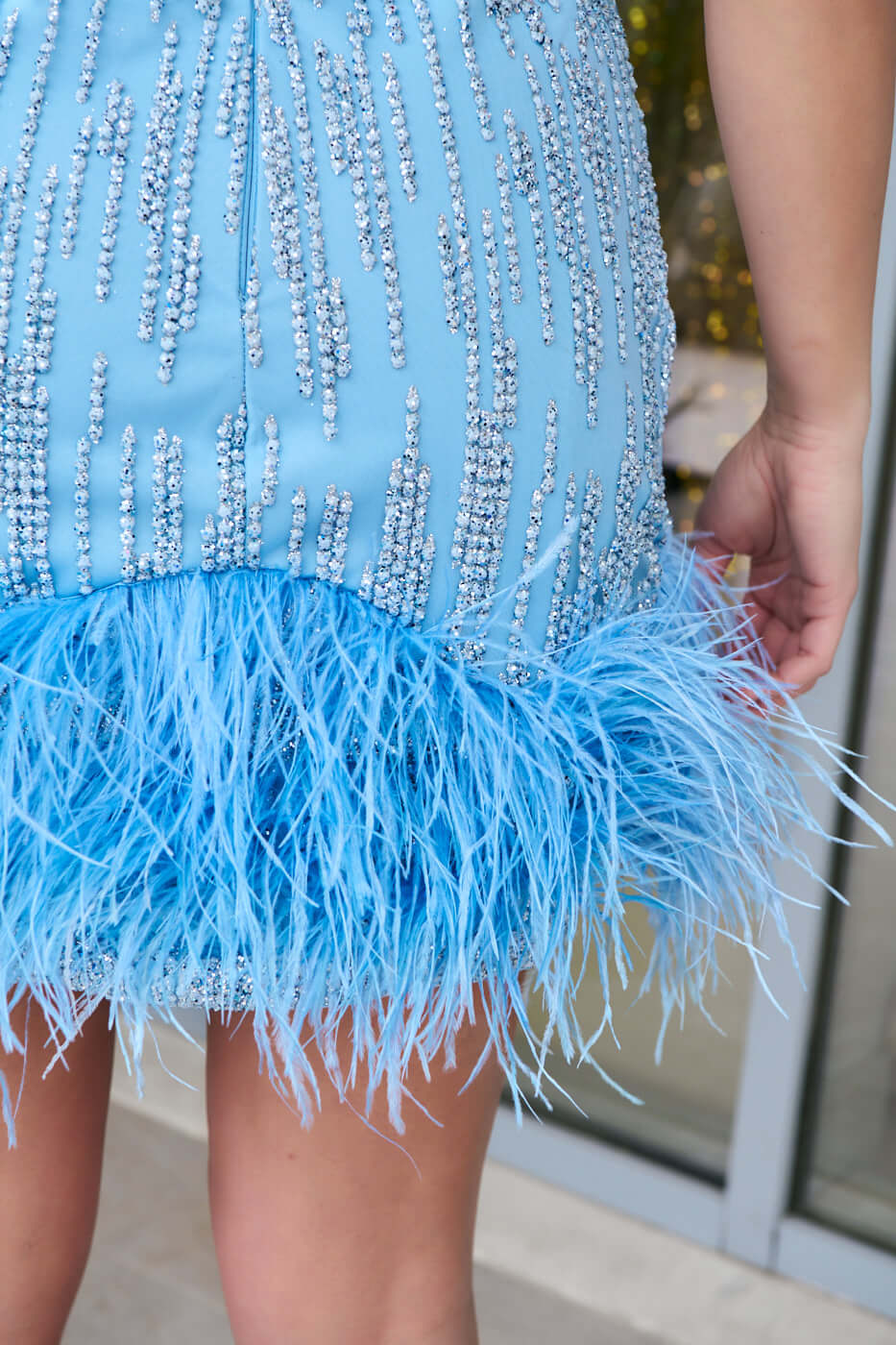 Φόρεμα mini με τρισδιάστατο γκλίτερ και feathers baby blue. Εντυπωσιακό mini φόρεμα στην απόλυτη baby blue απόχρωση. Διαθέτει περίτεχνα κάθετα σχέδια με τρισδιάστατο γκλίτερ σε όλο του το μήκος. Στο πάνω μέρος έχει V ντεκολτέ με διαφάνειες, εσωτερικά cups και λεπτές τιράντες. Στο κάτω μέρος έχει δύο σειρές από feathers στην ίδια απόχρωση που δίνουν μια πινελιά πολυτέλειας στο φόρεμα. Πίσω έχει επίσης V και κλείνει με φερμουάρ. Διαθέτει εσωτερική φόδρα. Ιδανικό για λαμπερές επίσημες εμφανίσεις που ξεχωρίζουν.