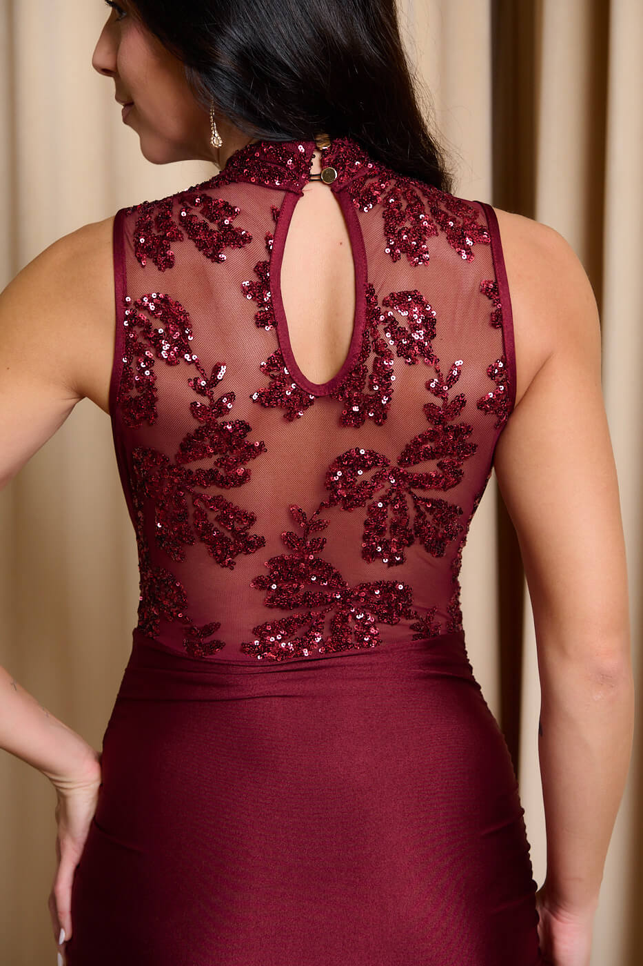 Φόρεμα mini ντραπέ με λεπτομέρεια διαφάνεια βουργουνδί. Ένα κομψό φόρεμα σε υπέροχη βουργουνδί απόχρωση.  Διαθέτει halter λαιμόκοψη που κλείνει με κουμπιά πίσω. Το μπούστο είναι ντραπέ με λεπτομέρεια διαφάνεια και παγιέτες που δημιουργούν περίτεχνα σχέδια.  Η ίδια διαφάνεια υπάρχει και στην πλάτη. Η εφαρμοστή γραμμή του με σούρες στο πλάι και το ελαστικό του ύφασμα αναδεικνύουν και κολακεύουν τη σιλουέτα.  Το ιδανικό φόρεμα για κομψές εμφανίσεις που ξεχωρίζουν.