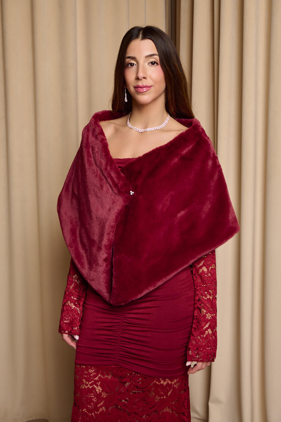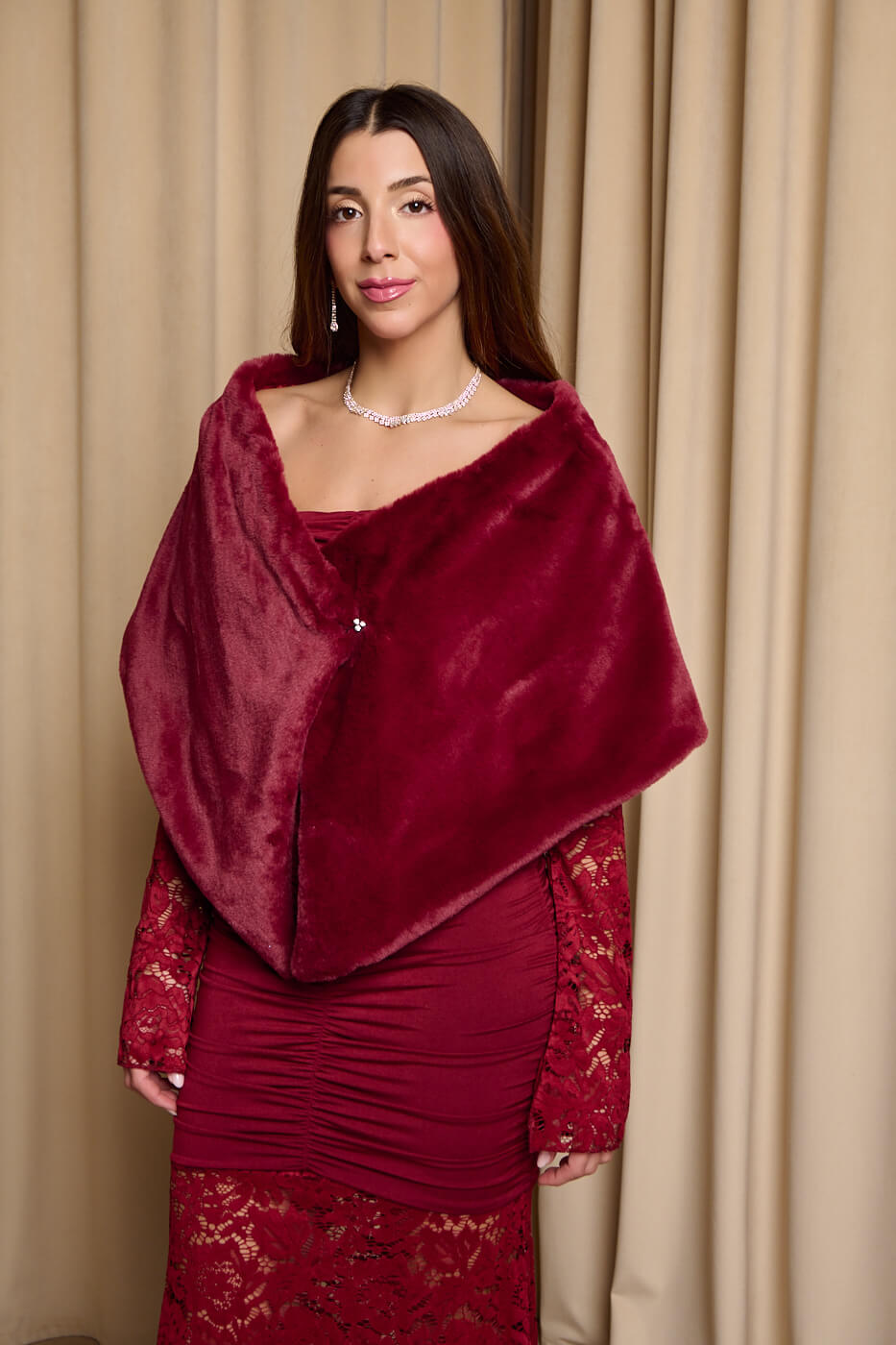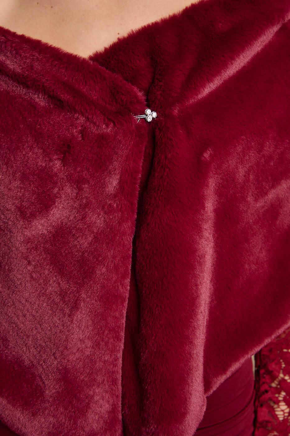 Γούνα ετόλ συνθετική βουργουνδί. Έχει εσωτερική φόδρα. Αγκαλιάζει όμορφα τους ώμους και κλείνει με κούμπωμα κόσμημα μπροστά, προσφέροντας ζεστασιά και στυλ. Ιδανική για βραδινές εμφανίσεις, γάμους ή επίσημες περιστάσεις.