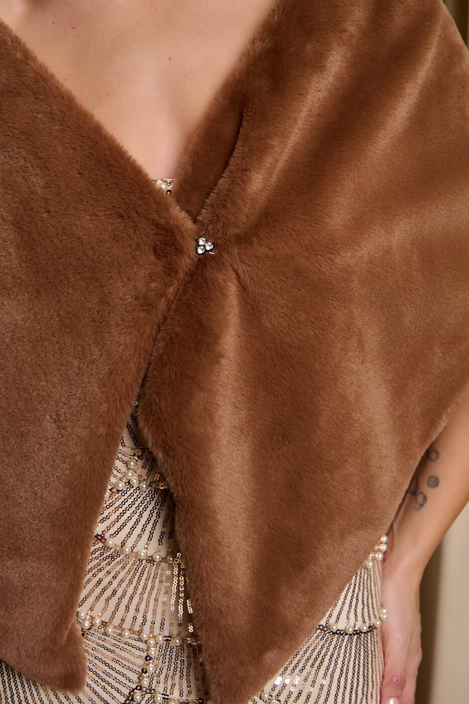 Γούνα ετόλ συνθετική ταμπά. Έχει εσωτερική φόδρα. Αγκαλιάζει όμορφα τους ώμους και κλείνει με κούμπωμα κόσμημα μπροστά, προσφέροντας ζεστασιά και στυλ. Ιδανική για βραδινές εμφανίσεις, γάμους ή επίσημες περιστάσεις.