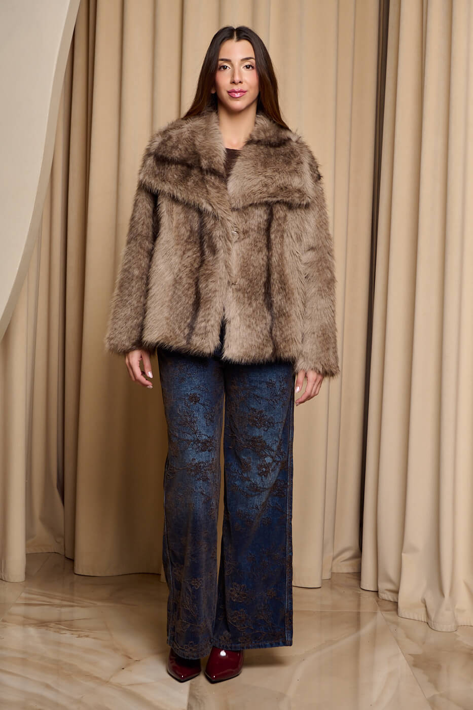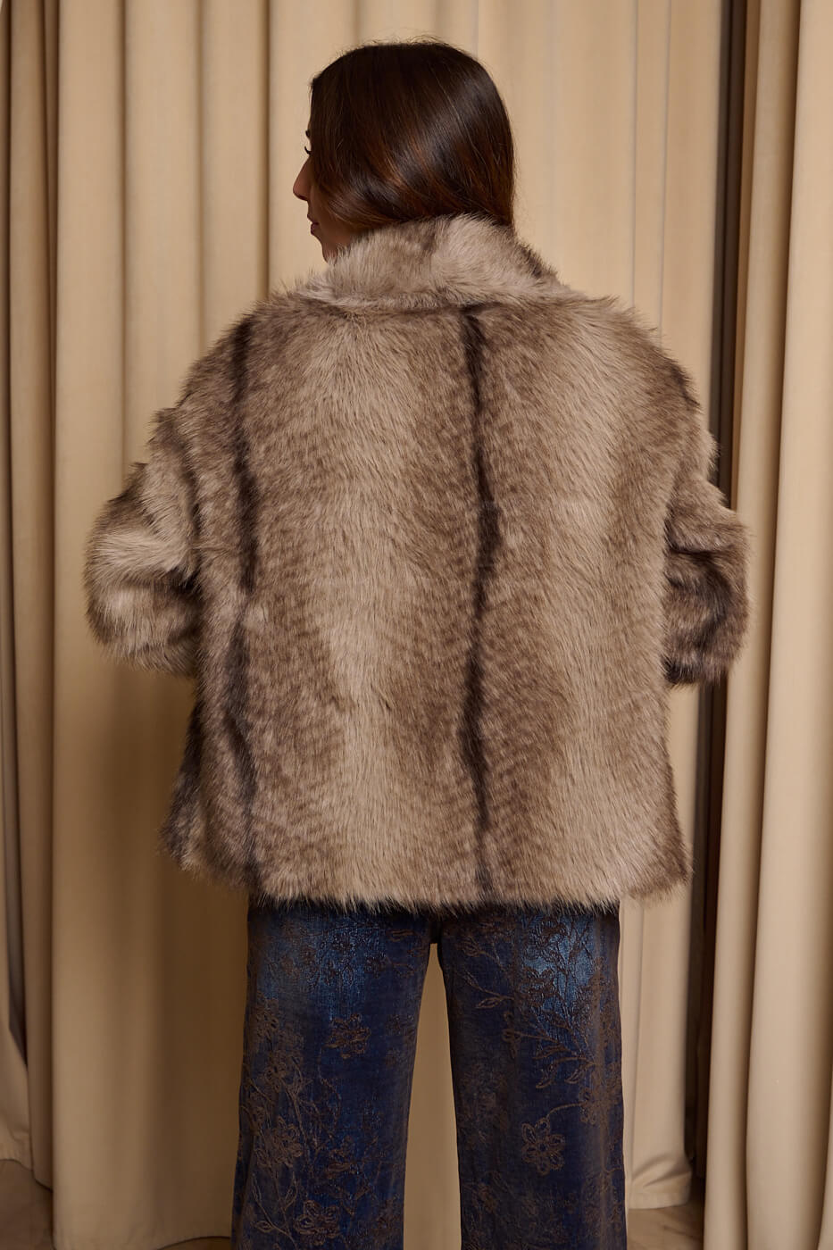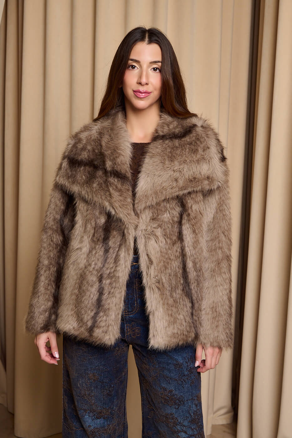 Γούνα κοντή συνθετική καφέ. Μια εντυπωσιακή καφέ γούνα με μαύρα νερά που θα αναβαθμίσει κάθε χειμερινή σας εμφάνιση. Διαθέτει μεγάλο γιακά και μακριά μανίκια. Κλείνει με κούμπωμα τύπου γάντζος με θηλιά. Έχει εσωτερική φόδρα και τσέπες. Η πλούσια υφή της προσφέρει ζεστασιά και πολυτελή αίσθηση. Ιδανική για all-day εμφανίσεις, από πρωινές βόλτες με τζιν έως και βραδινές εξόδους με καλό φόρεμα.