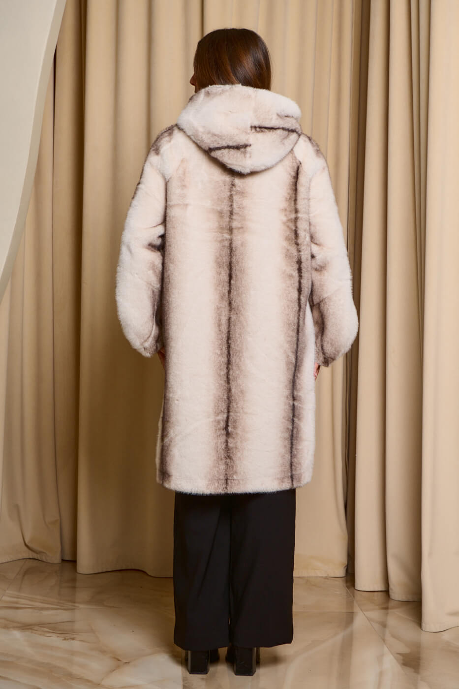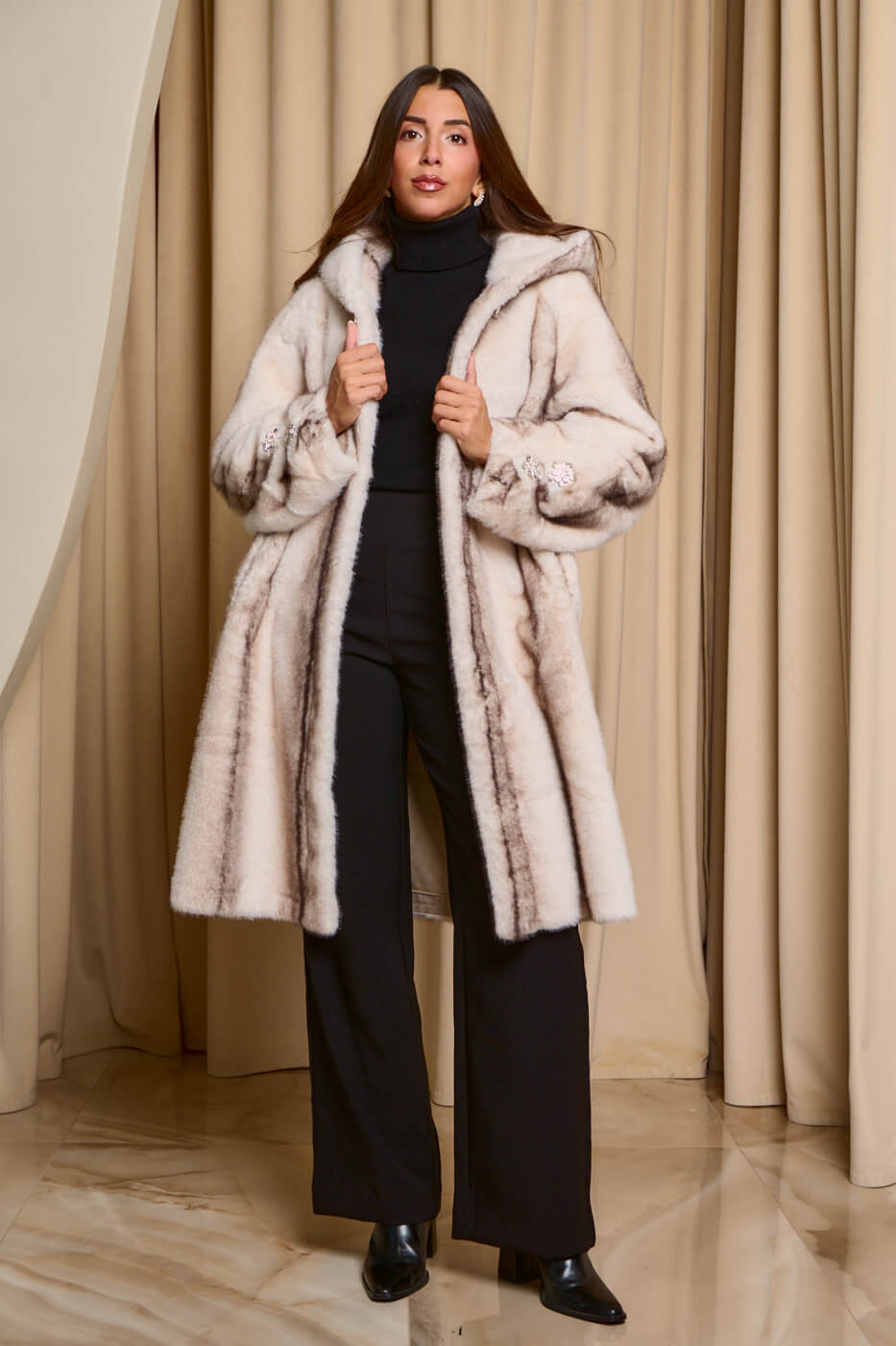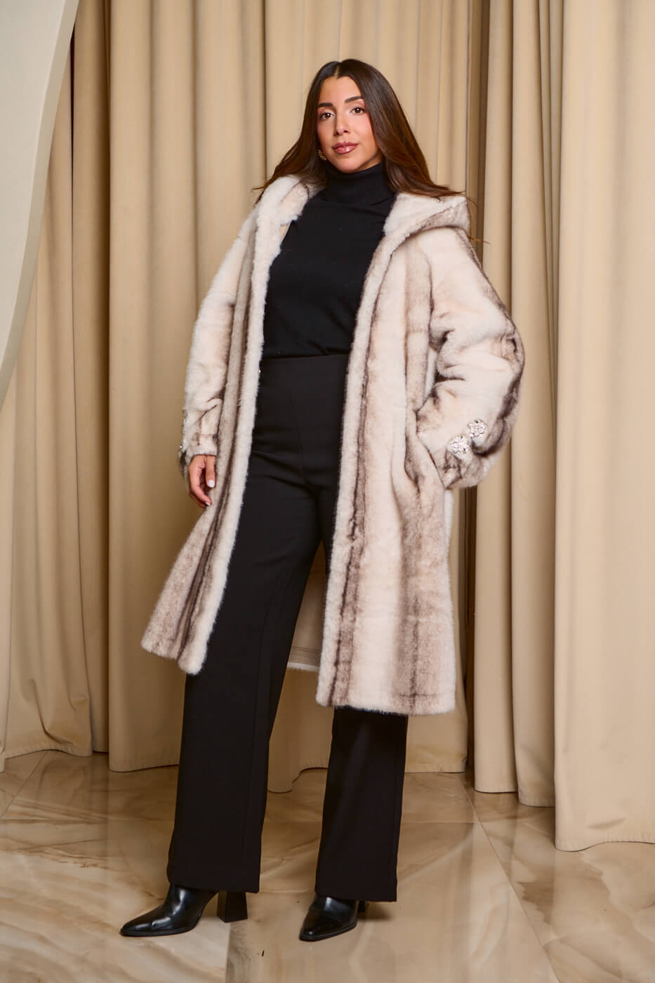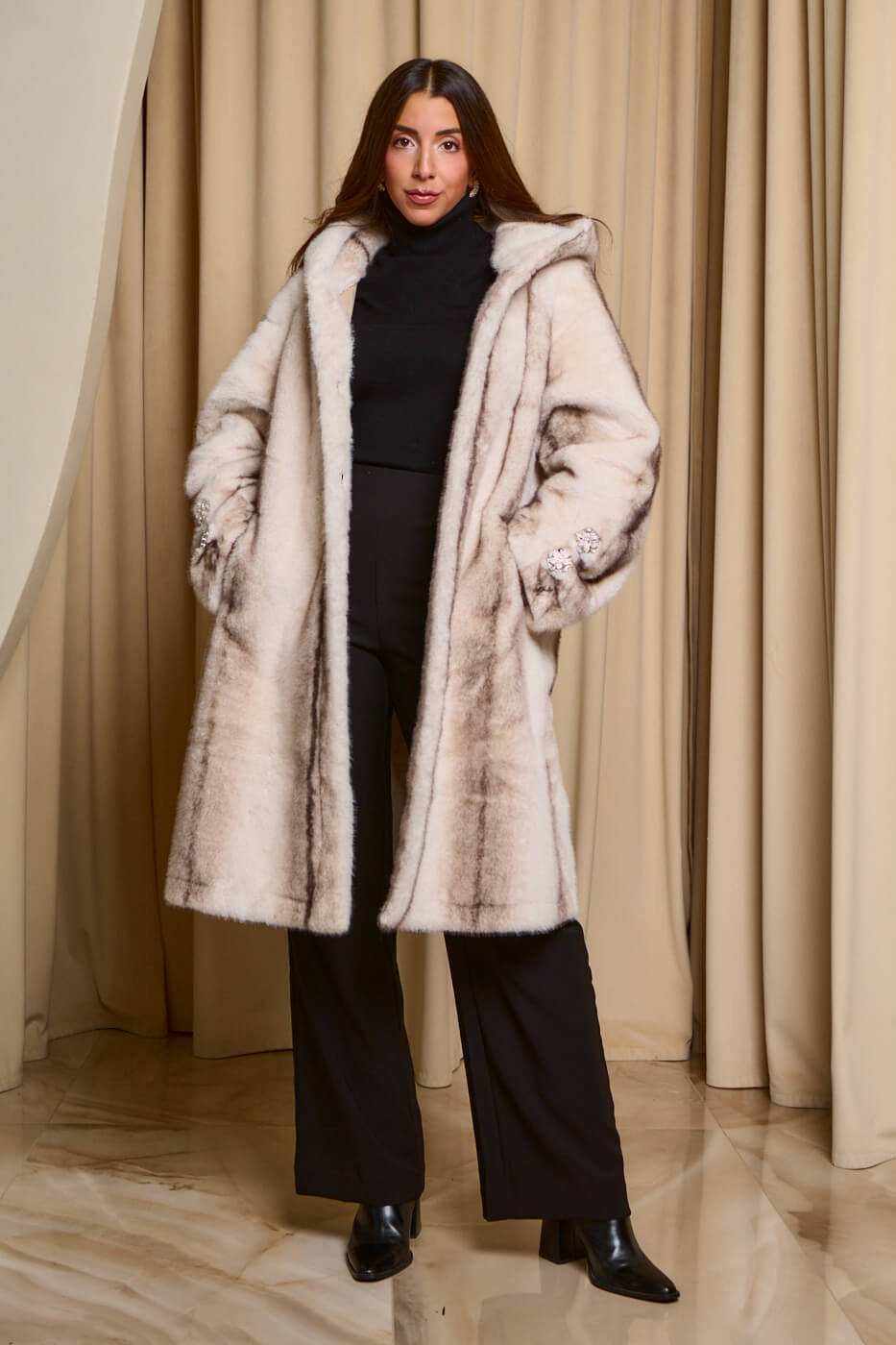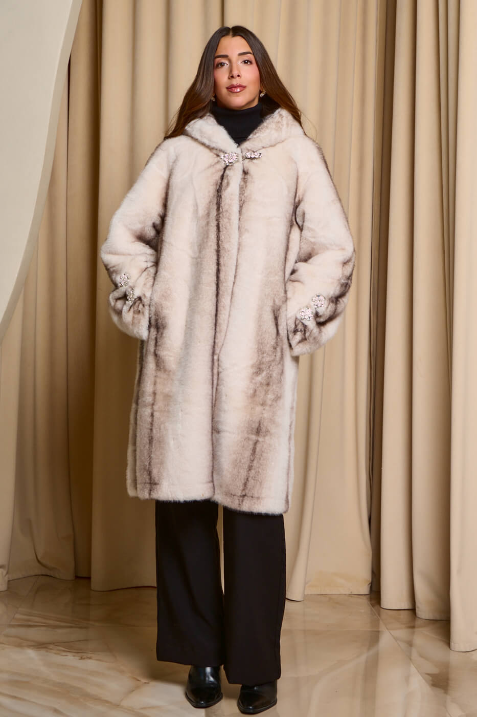• Γούνα με κουκούλα και στρας κοσμήματα καφέ