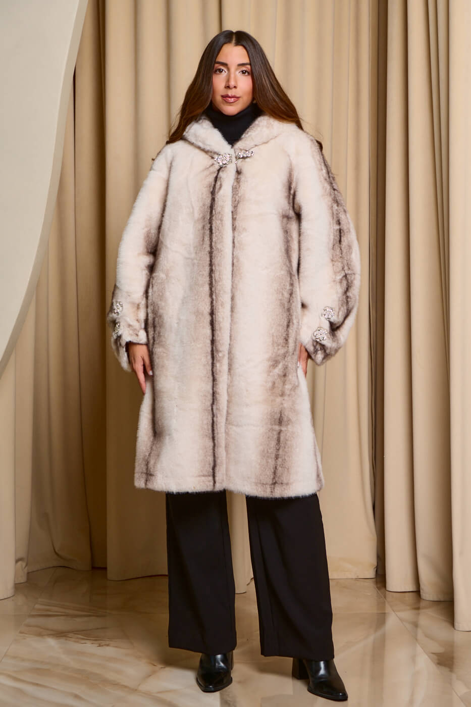 Γούνα με κουκούλα και στρας κοσμήματα γκρι ανοιχτό. Διαθέτει επένδυση μουτόν τσέπες και κουμπώνει με κρυφά κουμπιά στρας. Ένα κομμάτι που μπορείς να φορέσεις από το πρωί ως το βράδυ σε όλες τις casual αλλά και επίσημες εμφανίσεις σου. Ιδανική για τις κρύες ημέρες.