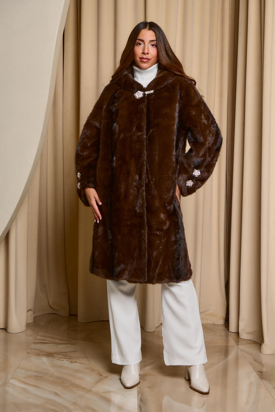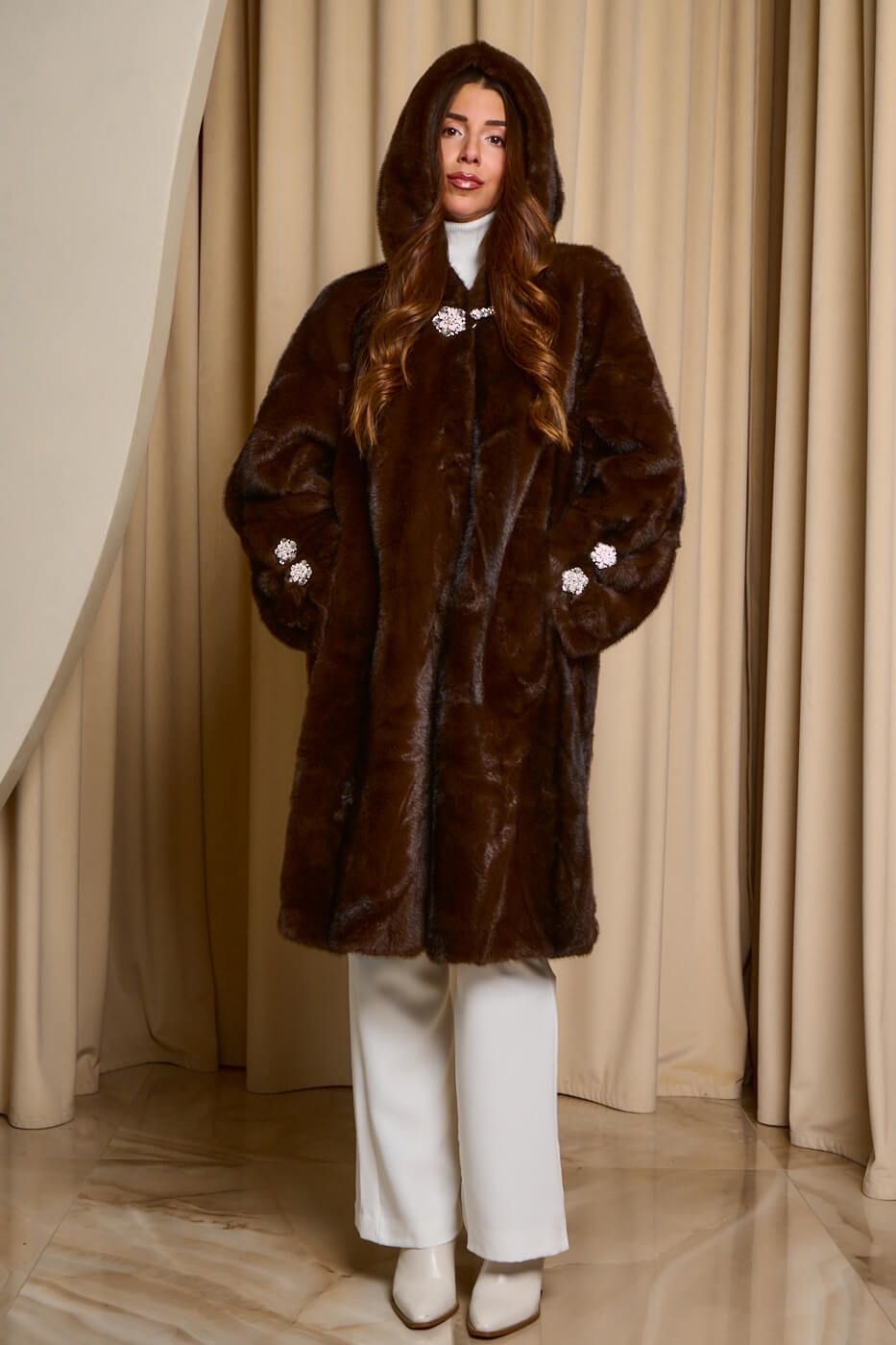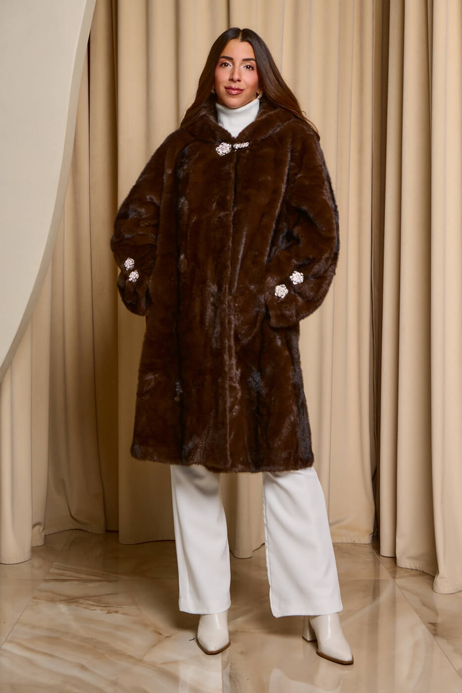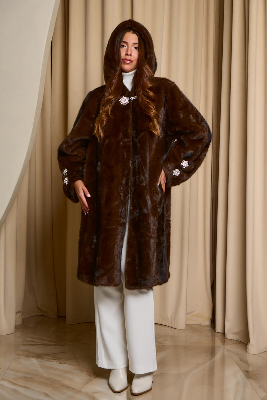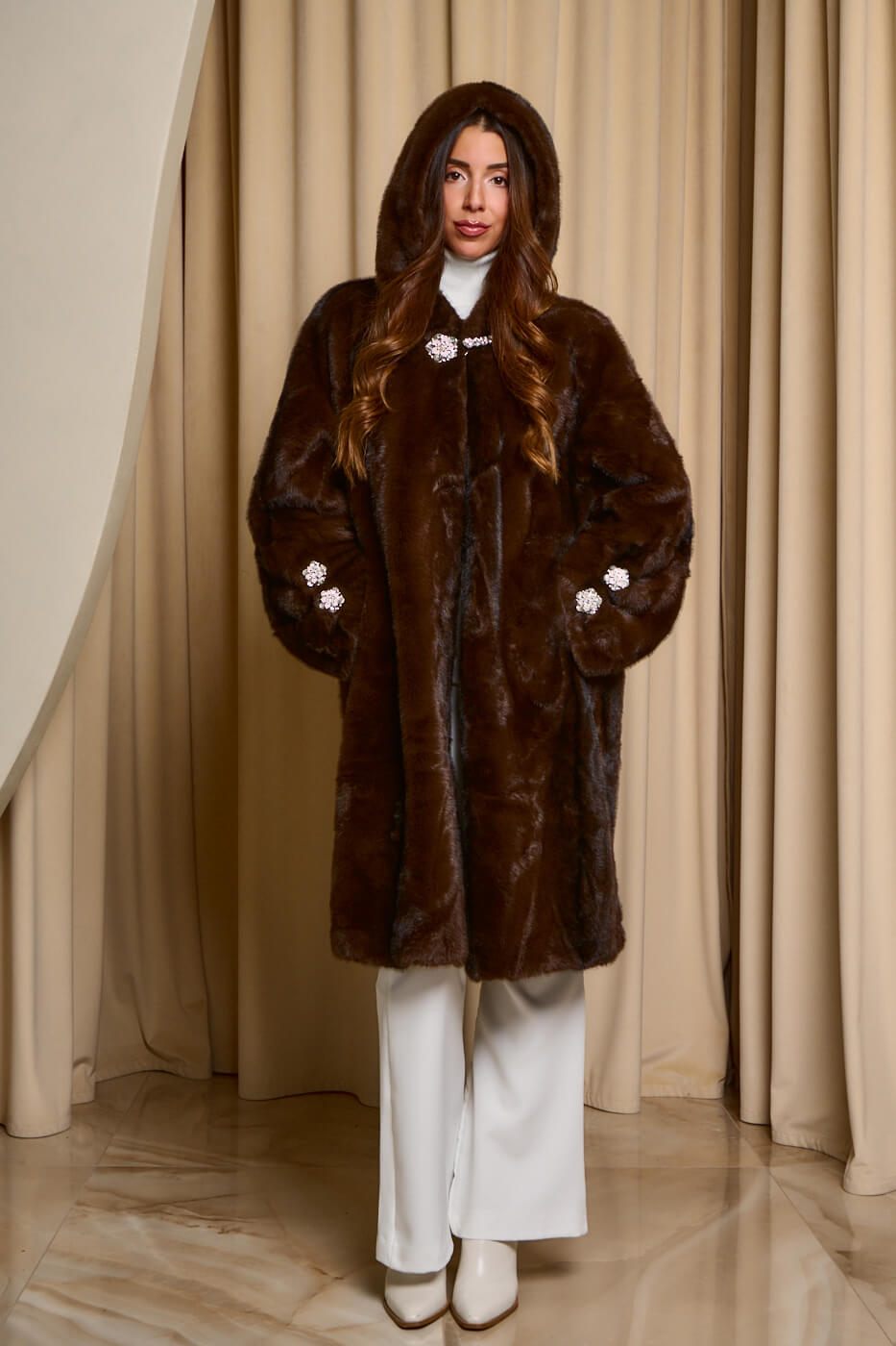 Γούνα με κουκούλα και στρας κοσμήματα καφέ. Διαθέτει επένδυση μουτόν τσέπες και κουμπώνει με κρυφά κουμπιά στρας. Μπορείς να φορέσεις από το πρωί.