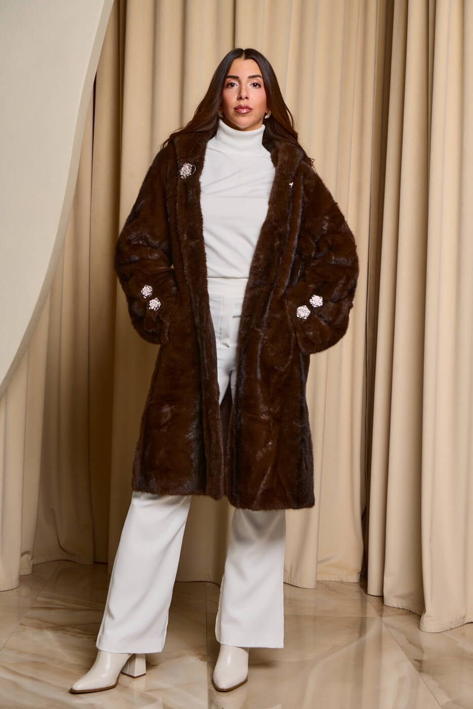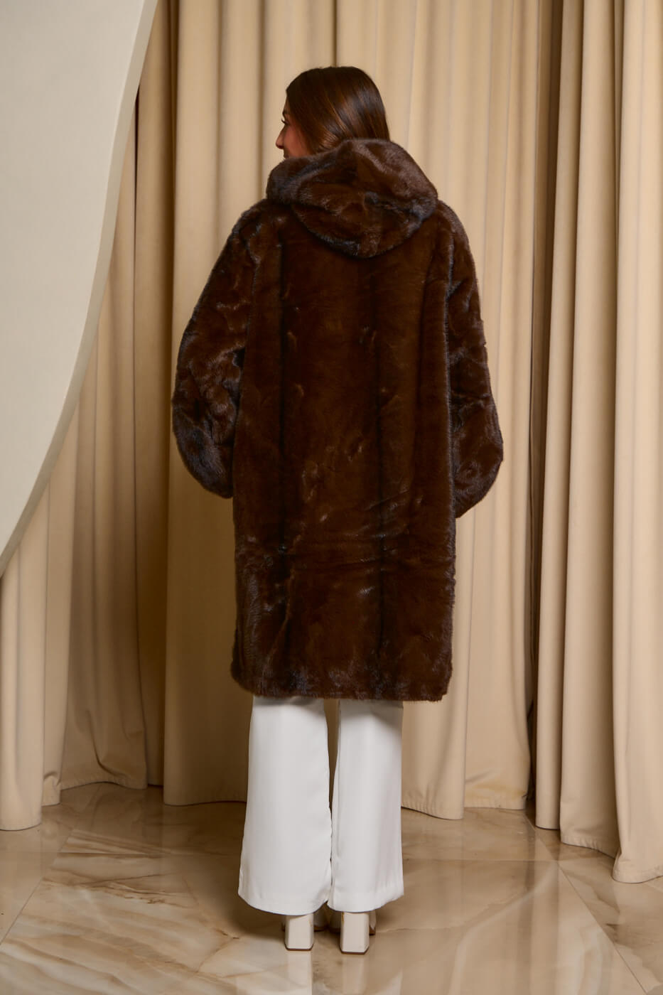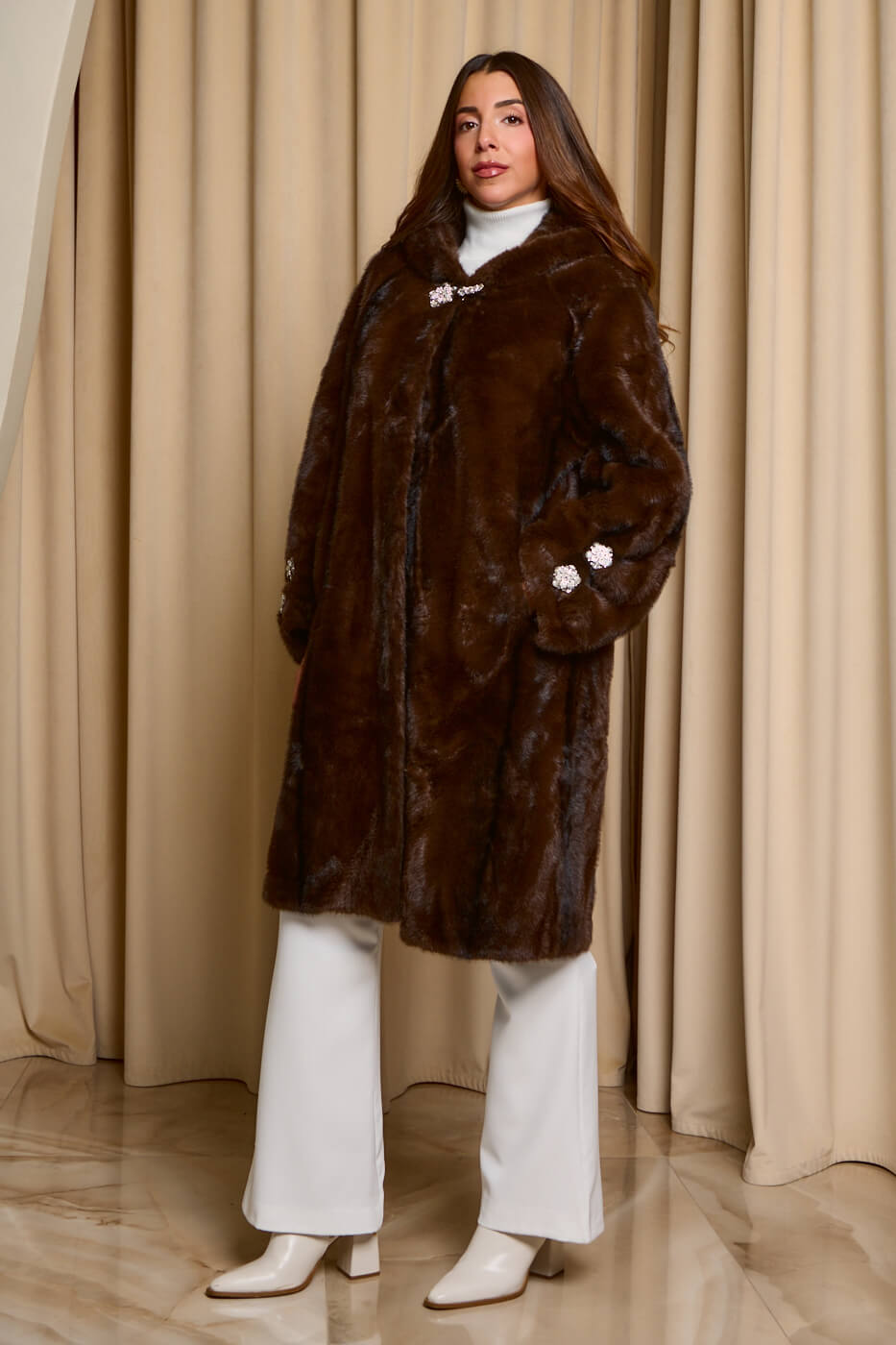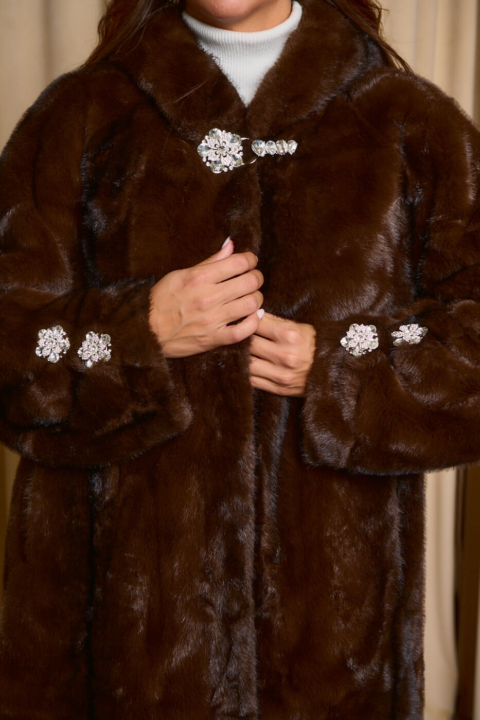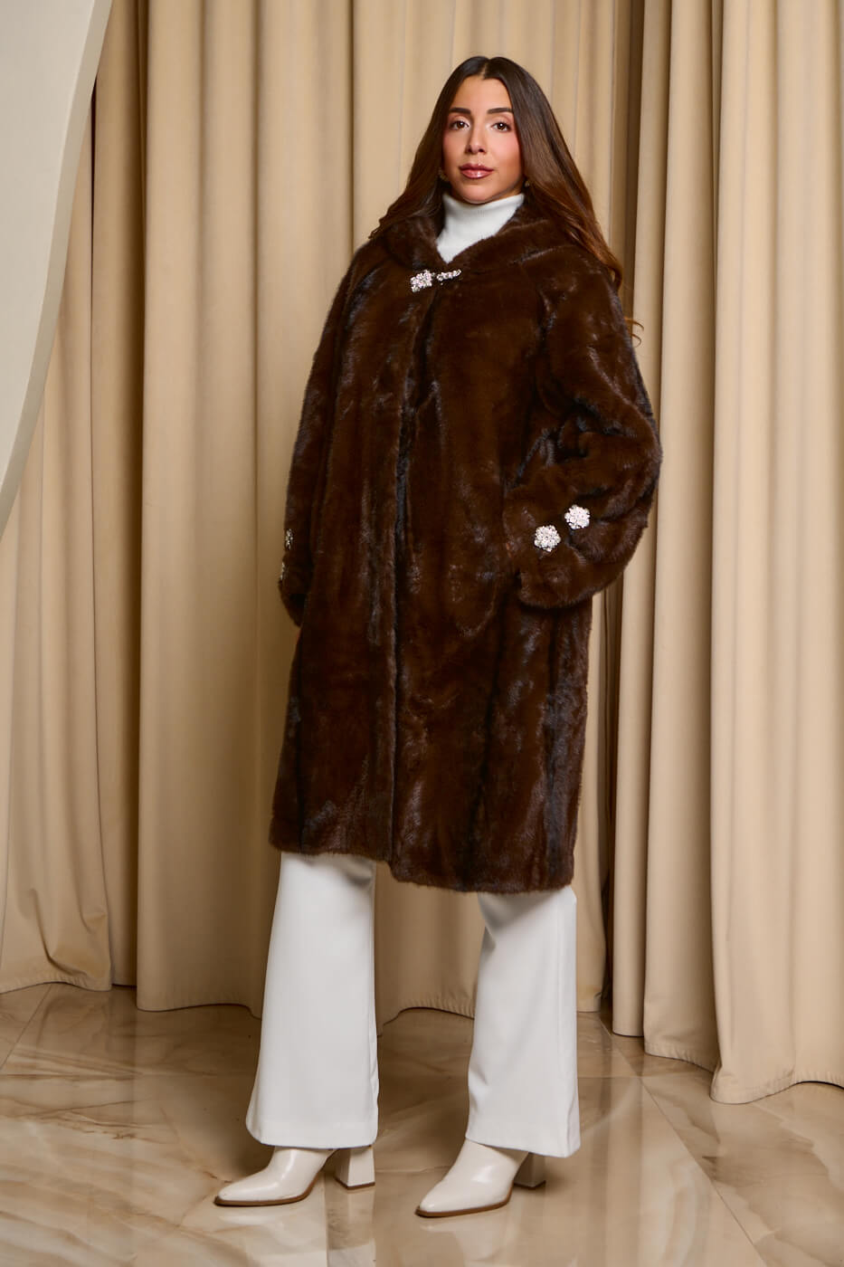 Γούνα με κουκούλα και στρας κοσμήματα καφέ. Διαθέτει επένδυση μουτόν τσέπες και κουμπώνει με κρυφά κουμπιά στρας. Μπορείς να φορέσεις από το πρωί.