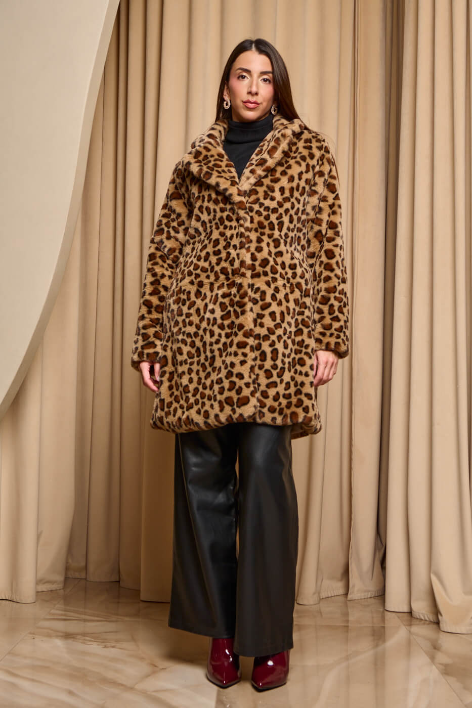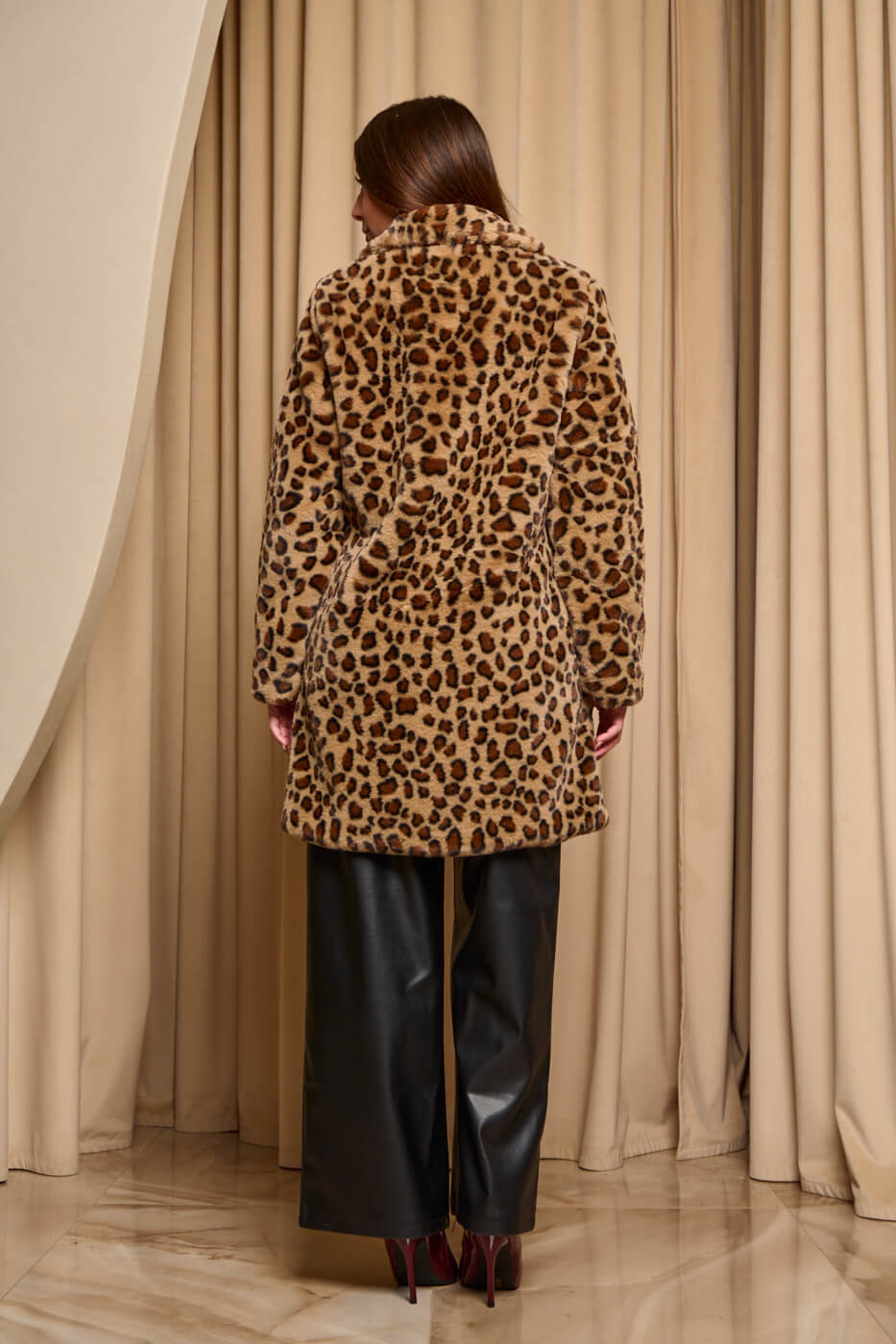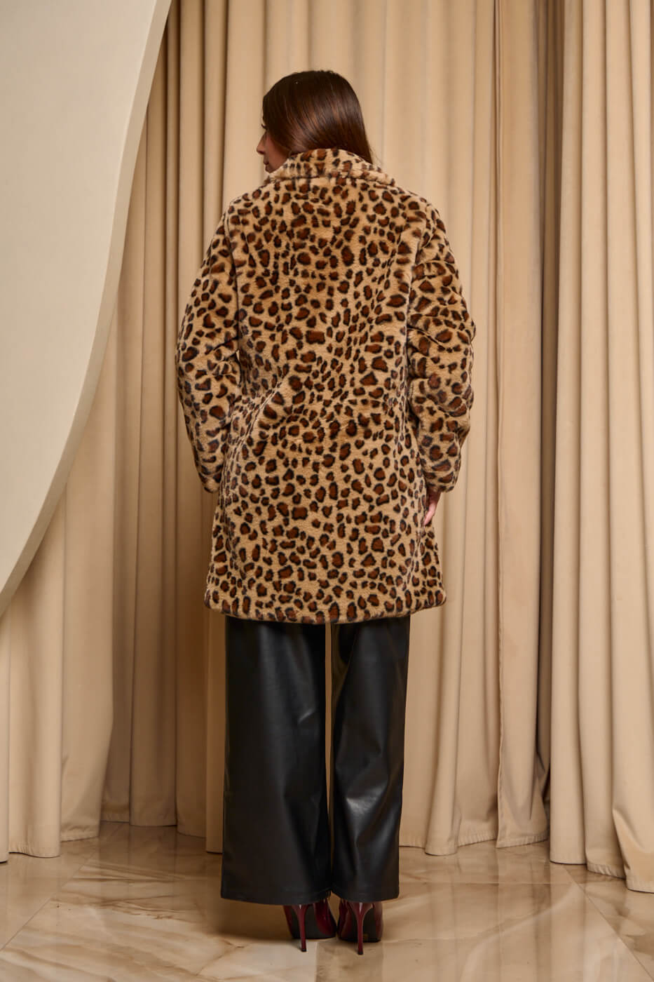 Γούνα με πέτο γιακά και τσέπες animal print. Με μακριά μανίκια και πέτο γιακά. Κλείνει μπροστά με κουμπιά εσωτερικά του παλτού. Διαθέτει τσέπες στο πλάι και εσωτερική φόδρα.