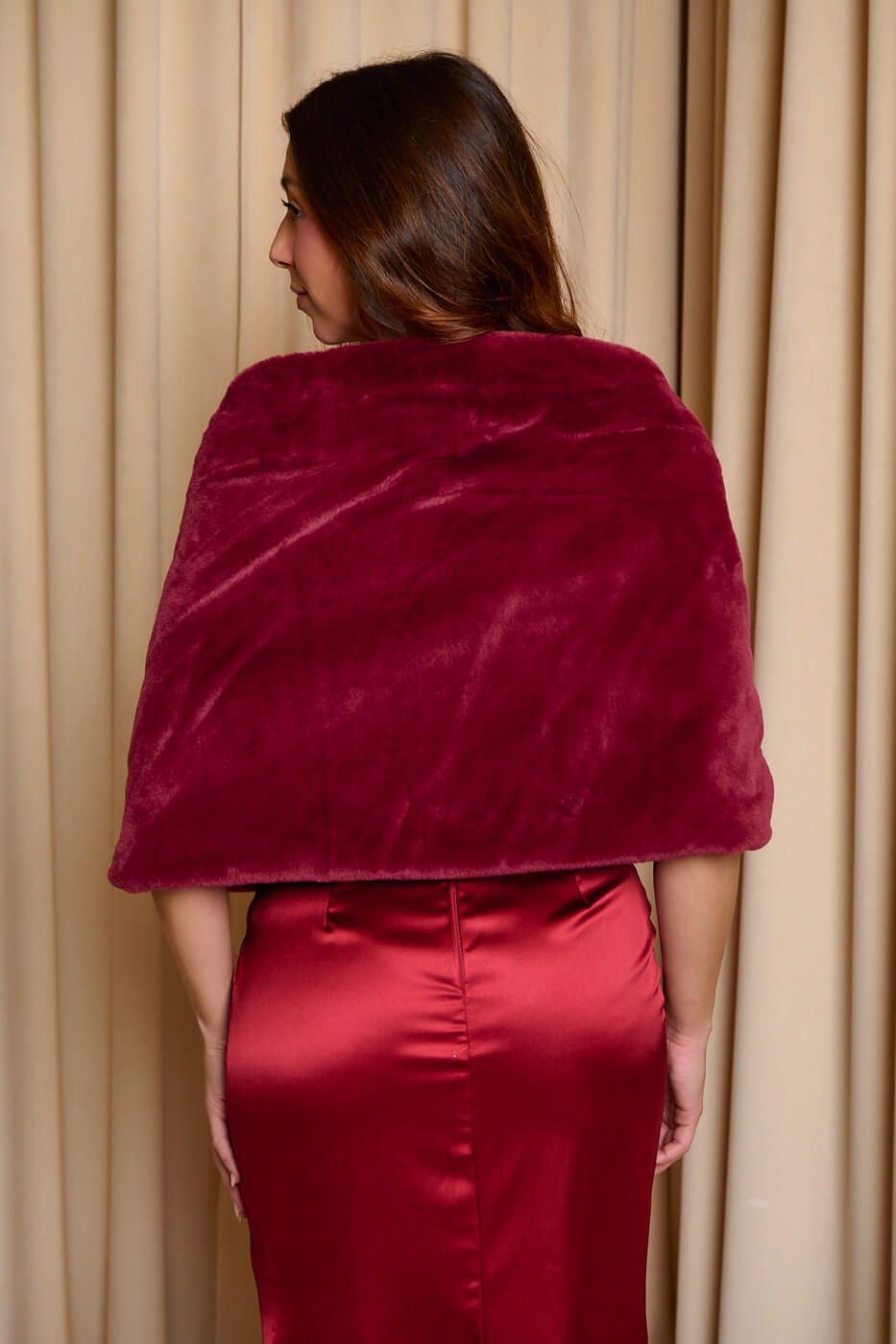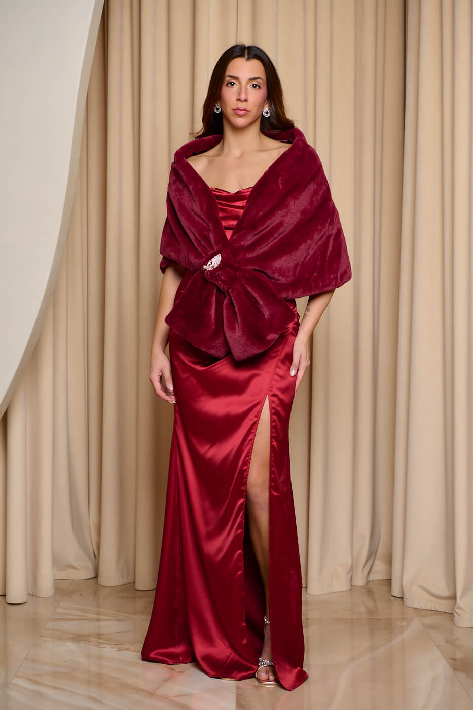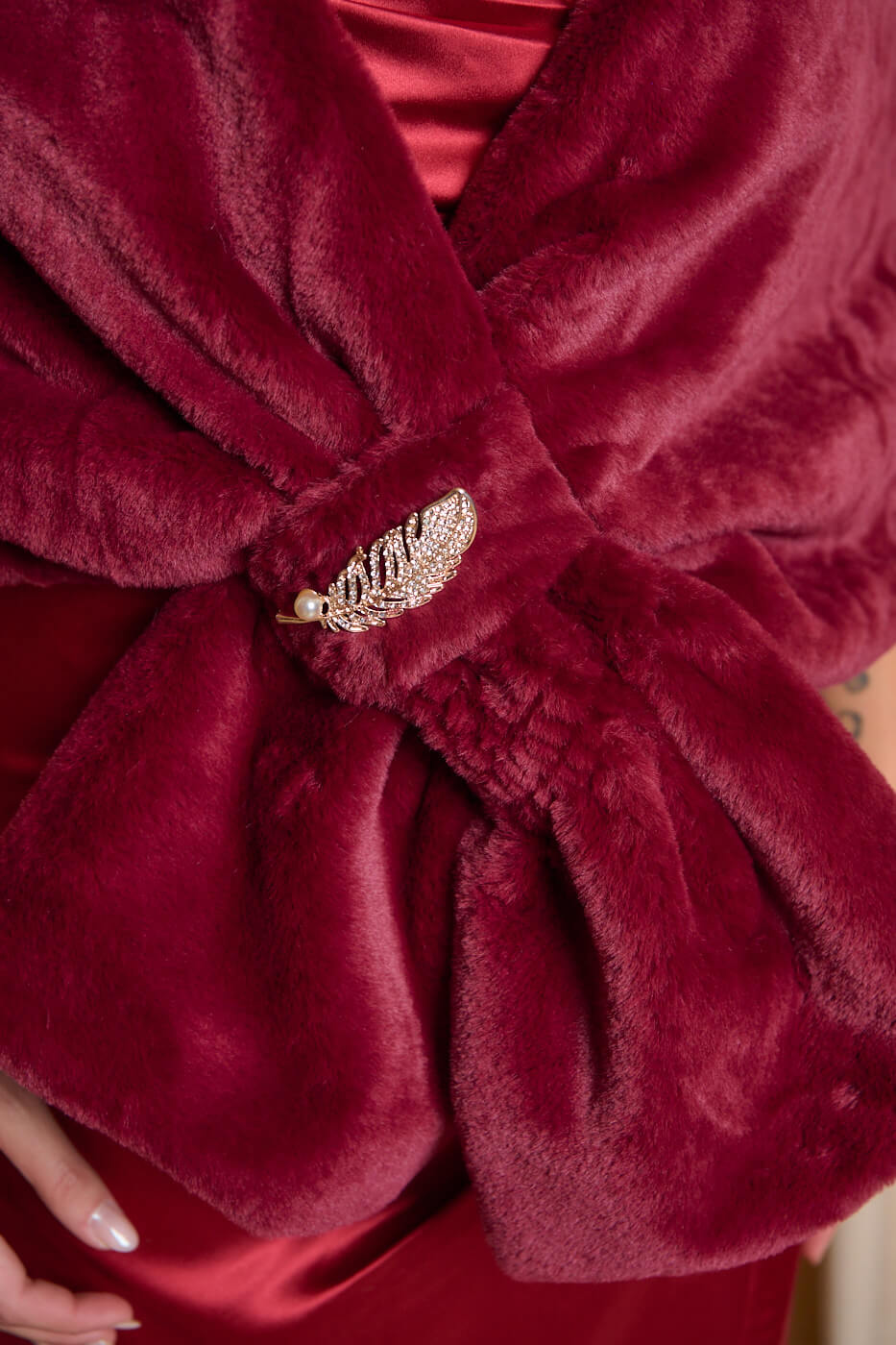 Γούνα συνθετική ετόλ με κόσμημα στρας βουργουνδί. Έχει εσωτερική φόδρα. Αγκαλιάζει όμορφα τους ώμους και σταυρώνει μπροστά, προσφέροντας ζεστασιά και στυλ. Διαθέτει κόσμημα μπροστά σε σχέδιο φύλλου με στρας και πέρλα. Ιδανική για βραδινές εμφανίσεις, γάμους ή επίσημες περιστάσεις.