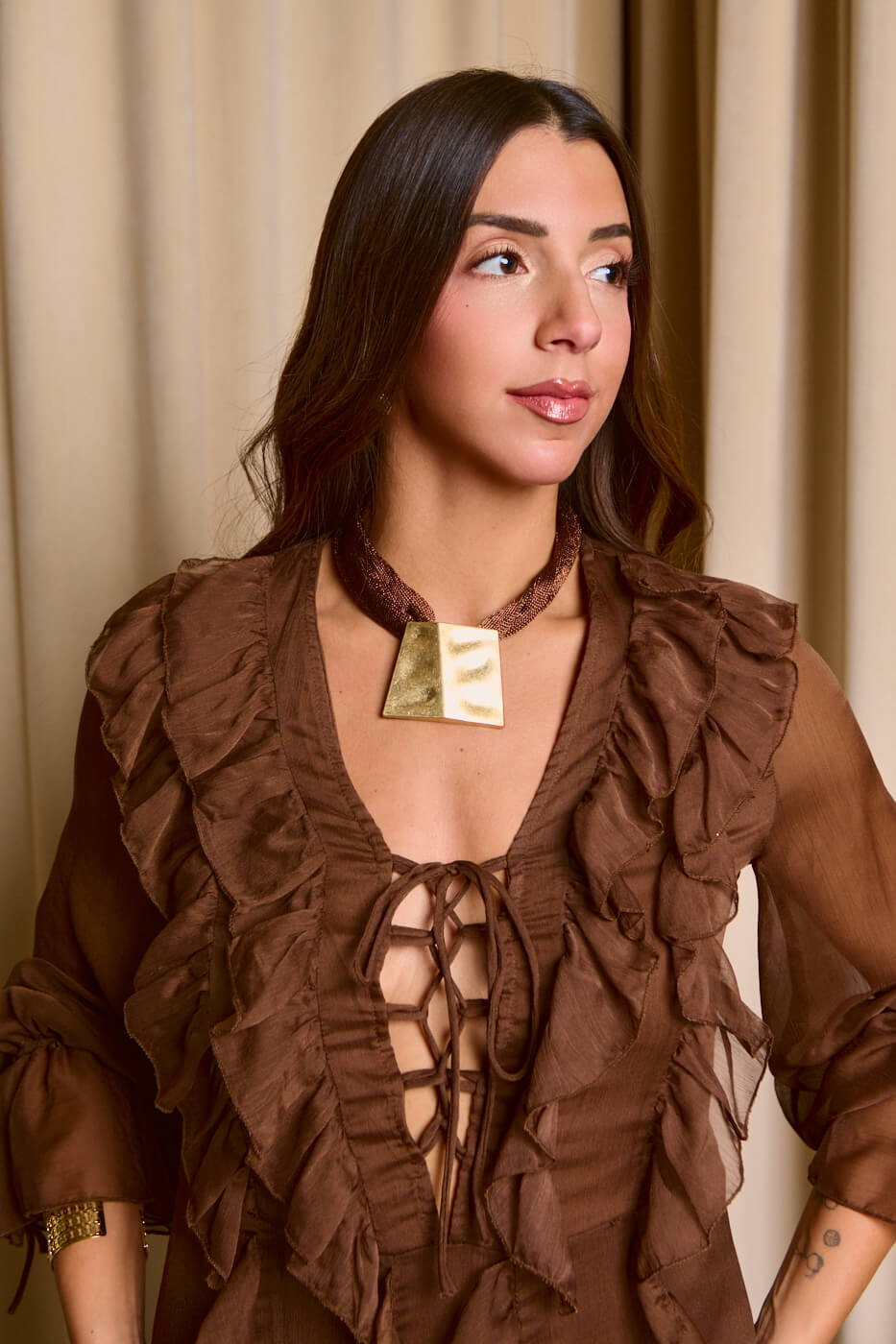 Κολιέ με διάτρητο μαντήλι bronze και κρεμαστό ανάγλυφο σχέδιο χρυσό. Στο πίσω μέρος του λαιμού κλείνει μαγνητικά. Έχει βάση σαν μαντήλι διάτρητό σε bronze χρώμα και ένα μεγάλο statement κρεμαστό μεταλλικό ανάγλυφο χρυσό.