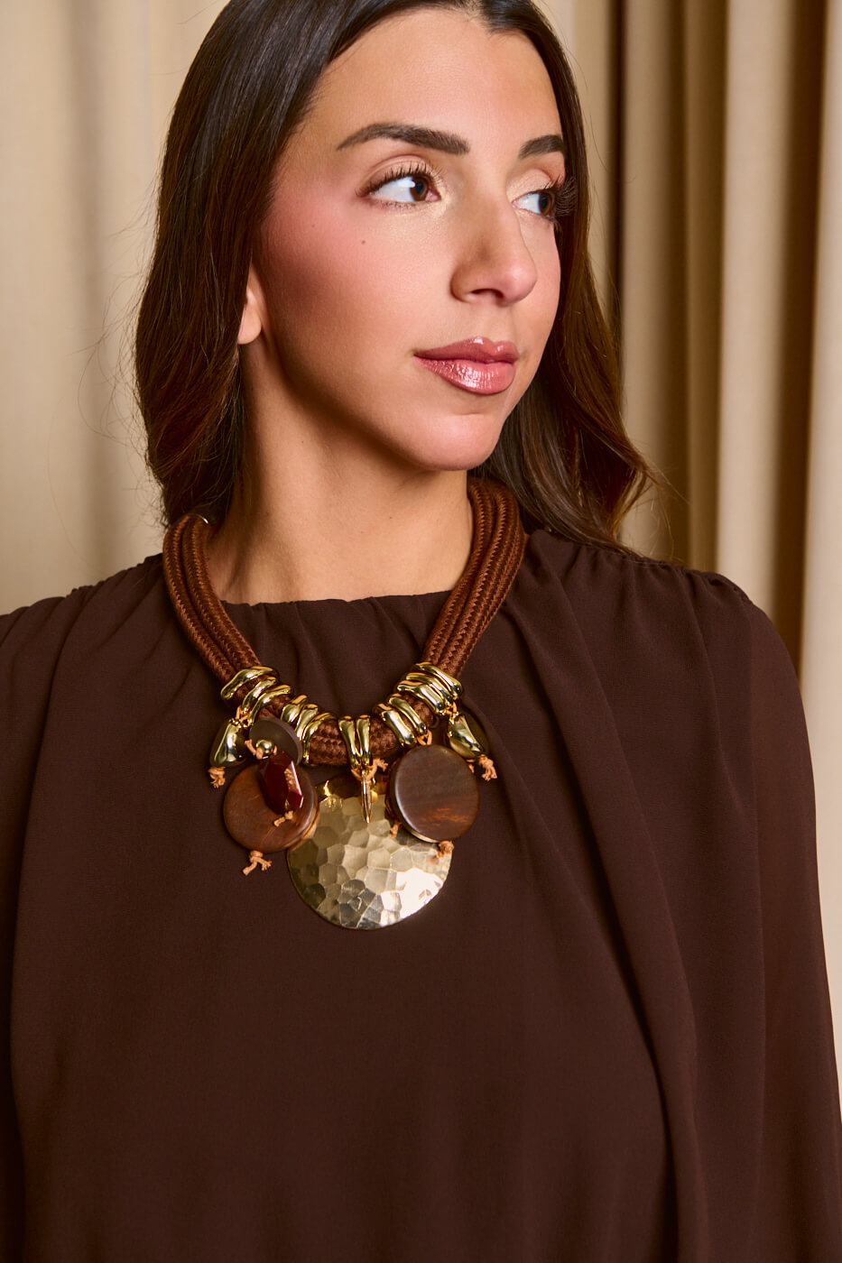 Κολιέ με στρογγυλά σχέδια και χοντρά καφέ κορδόνια χρυσό. Με τρία χοντρά κορδόνια που αγκαλιάζουν τον λαιμό. Διαθέτει στρόγγυλα σχέδια με υφή ξύλου και χρυσού μετάλλου και έχει ένα κεντρικό μεγάλο κύκλο με σφυρήλατα στοιχεία. Διαθέτει ρυθμιζόμενο κούμπωμα.