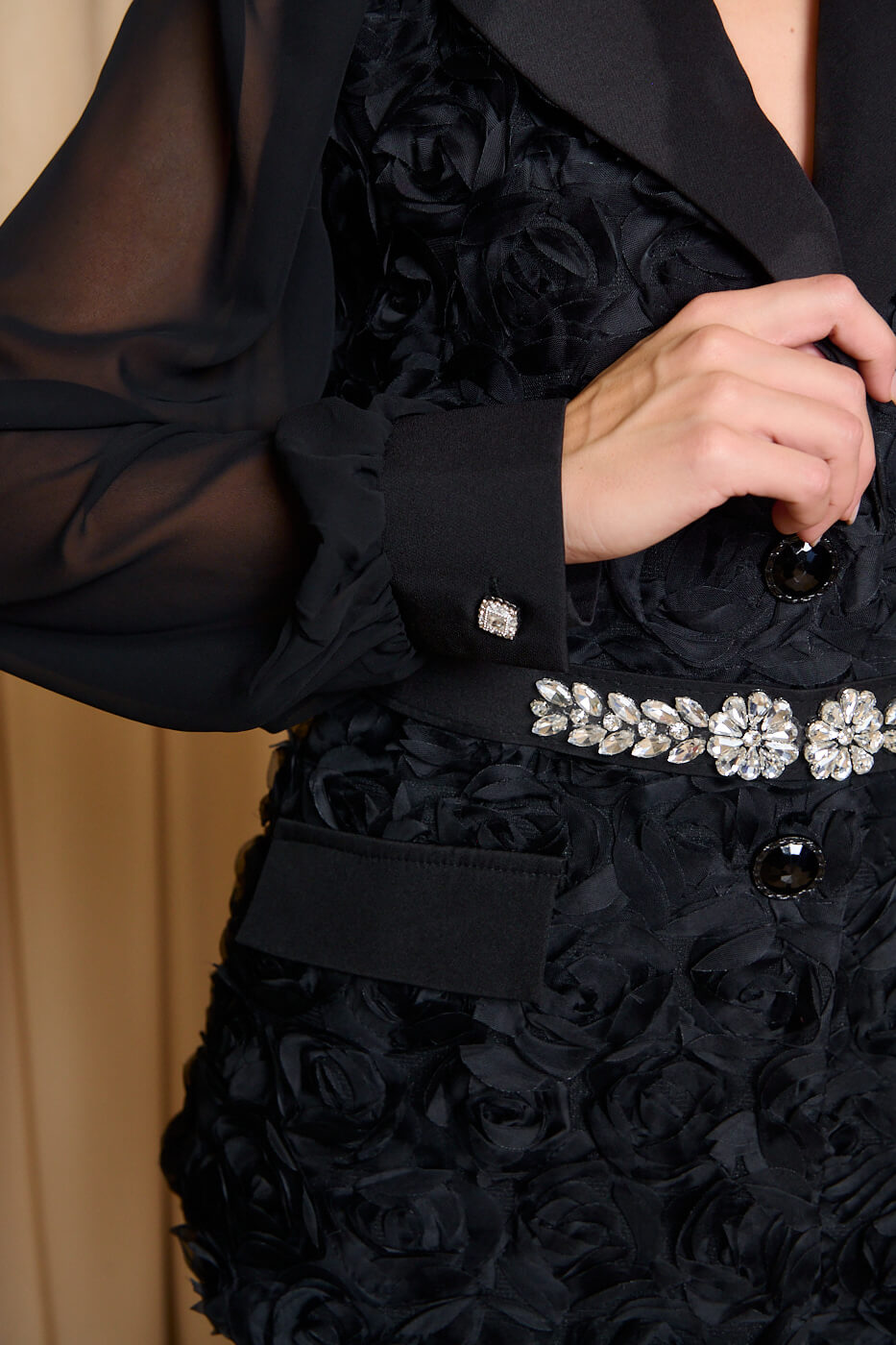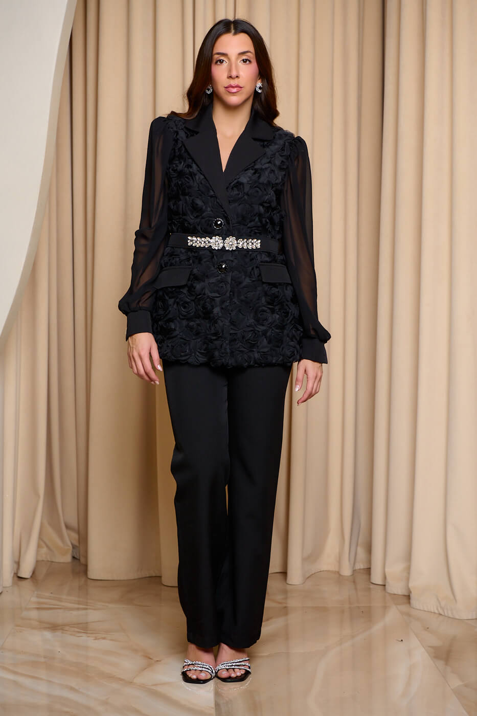 Κοστούμι με ανάγλυφα λουλούδια μαύρο. Το σακάκι διαθέτει τρισδιάστατα λουλούδια και διάφανα μανίκια με μανσέτες που κλείνουν με λαμπερό κουμπί. Επιπλέον, έχει πέτο γιακά , βάτες και κλείνει μπροστά με δύο εντυπωσιακά κουμπιά. Είναι εσωτερικά φοδραρισμένο και διαθέτει αποσπώμενη ζώνη. Το παντελόνι είναι σε ίσια γραμμή με λάστιχο στη μέση. Κλείνει με φερμουάρ στο πλάι.