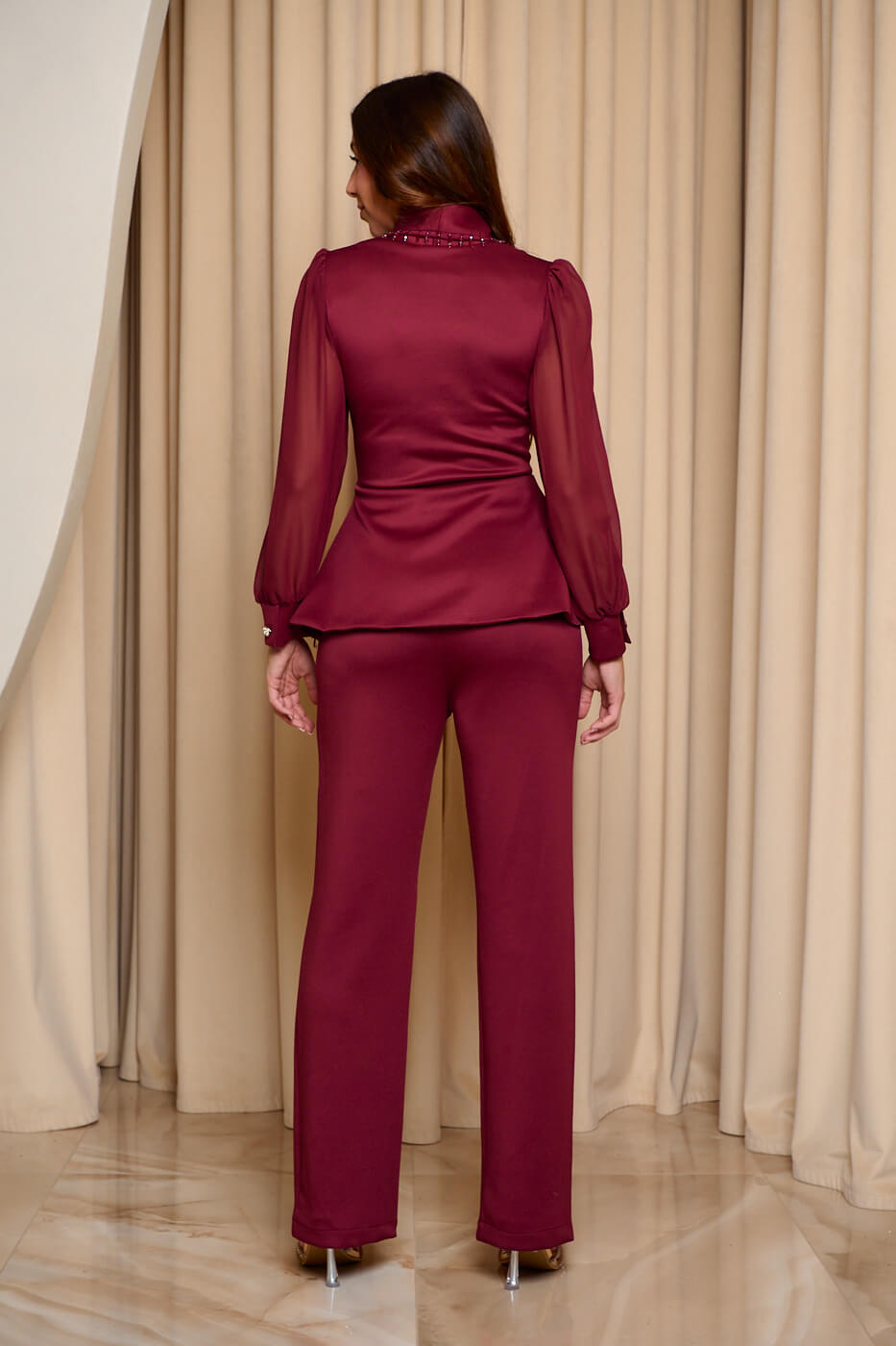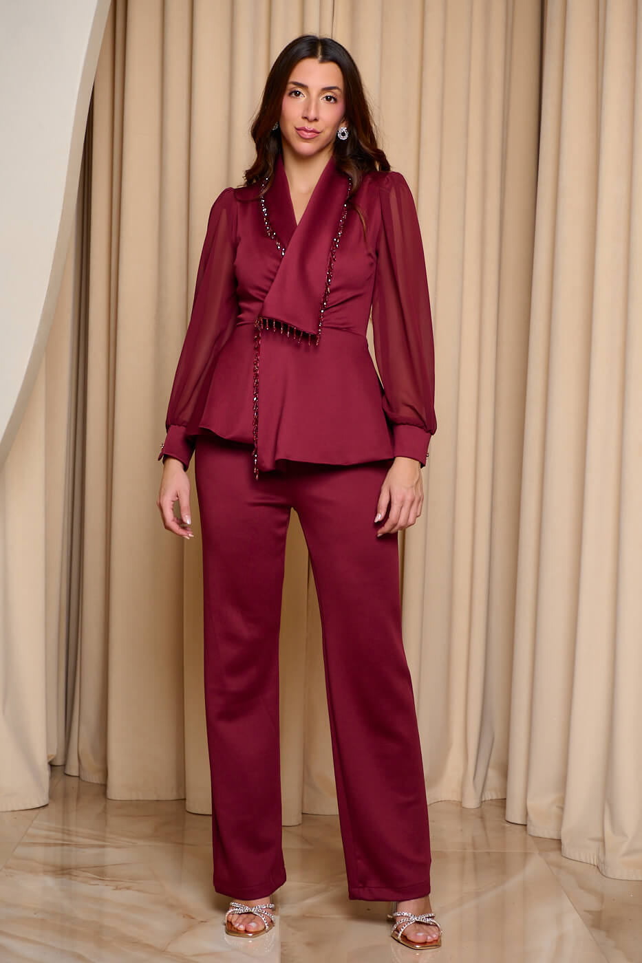 Κοστούμι με διακοσμητικές χάντρες βουργουνδί . Ένα εντυπωσιακό και κομψό κοστούμι που συνδυάζει διαχρονική φινέτσα και μοντέρνα γραμμή. Το σακάκι έχει πέπλουμ κόψιμο ,που αναδεικνύει τη μέση , μεγάλο εντυπωσιακό πέτο γιακά με κρεμαστές  χάντρες και βάτες στους ώμους. Τα μανίκια είναι διαφάνεια με μανσέτες και διακοσμητικό κουμπί κόσμημα. Κλείνει με φερμουάρ στο πλάι . Το παντελόνι είναι σε ίσια γραμμή και κλείνει με φερμουάρ.   Ιδανικό για κομψές εμφανίσεις με στυλ.